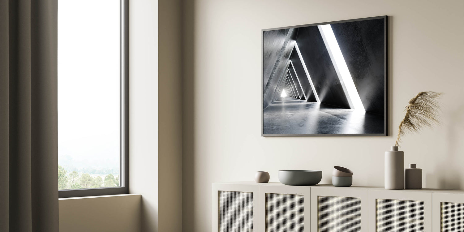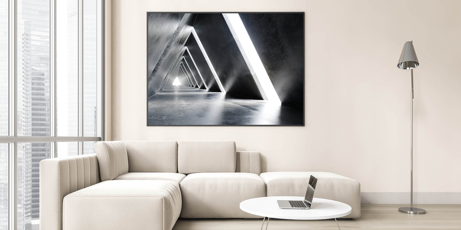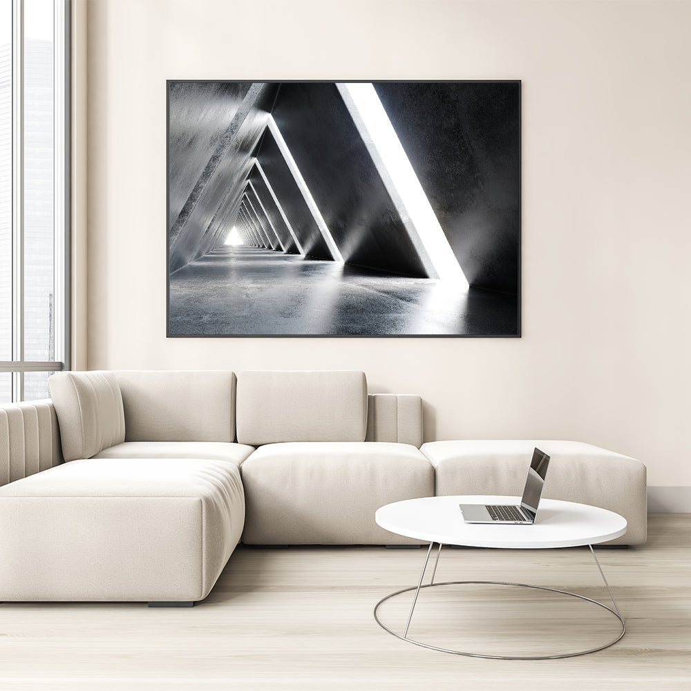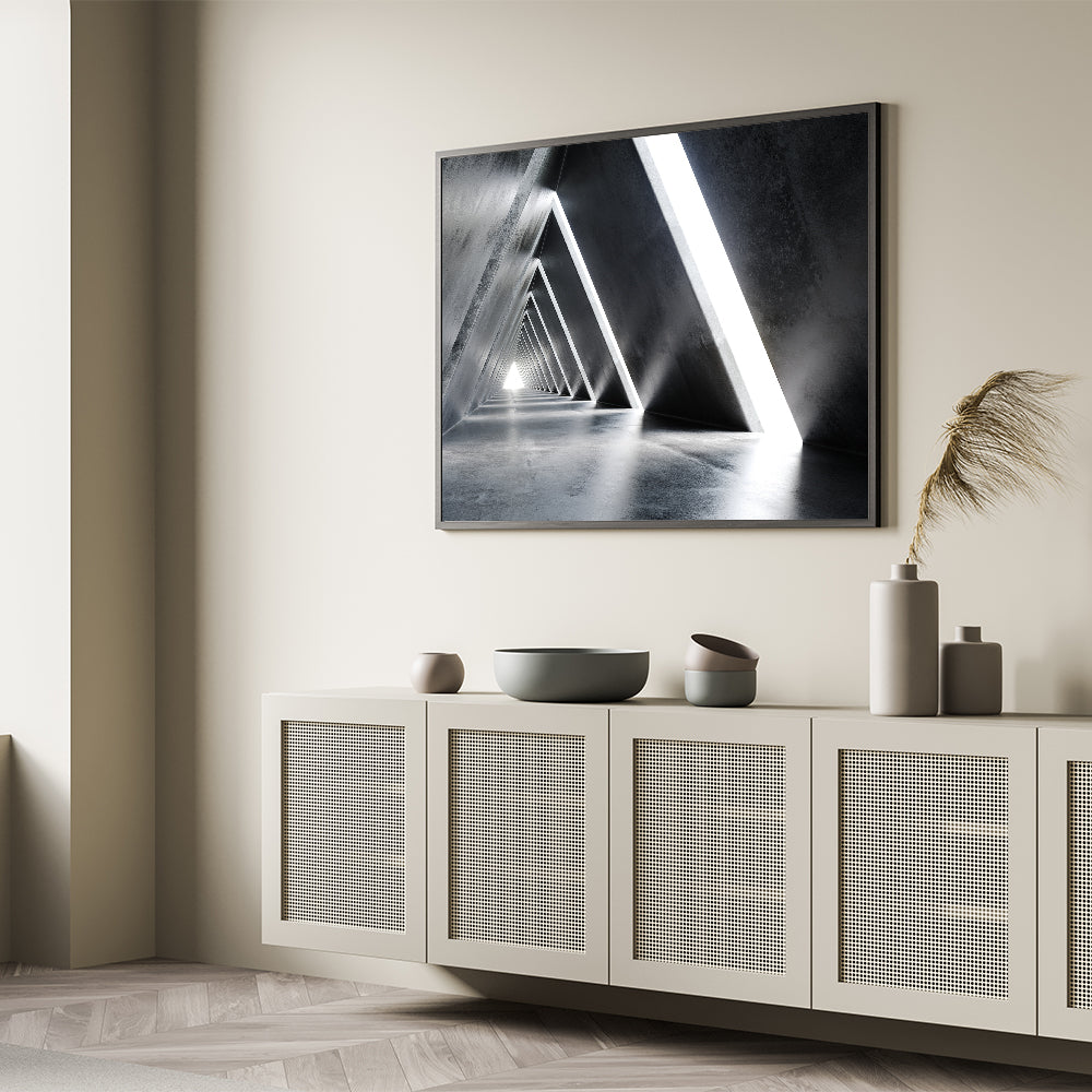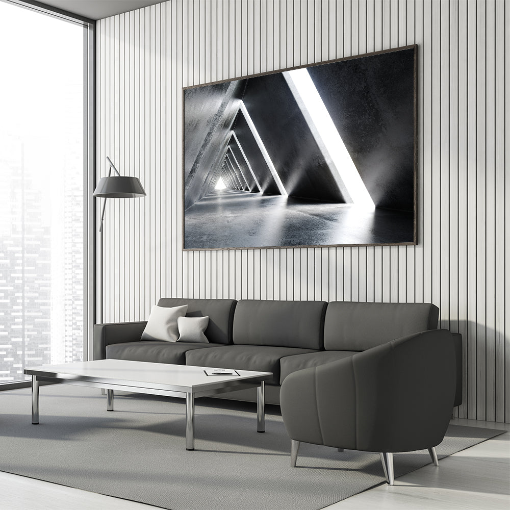 Introduce a sense of futuristic elegance to your space with this abstract tunnel wall art. The geometric design, highlighted by sharp lines and contrasting light and shadow, creates a visually stunning effect that captures the essence of modern architecture. This piece is perfect for adding a sleek, contemporary touch to any room, whether at home or in a corporate setting.