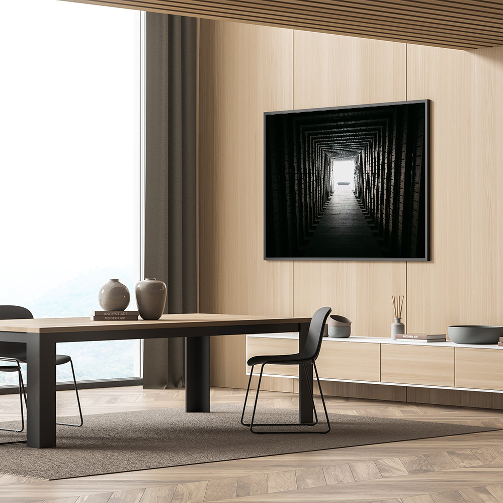 This symmetric tunnel perspective artwork is more than just a visual experience; it’s a statement piece that reflects the harmony and order found in urban architecture. Perfect for those who appreciate the intersection of art and design.
