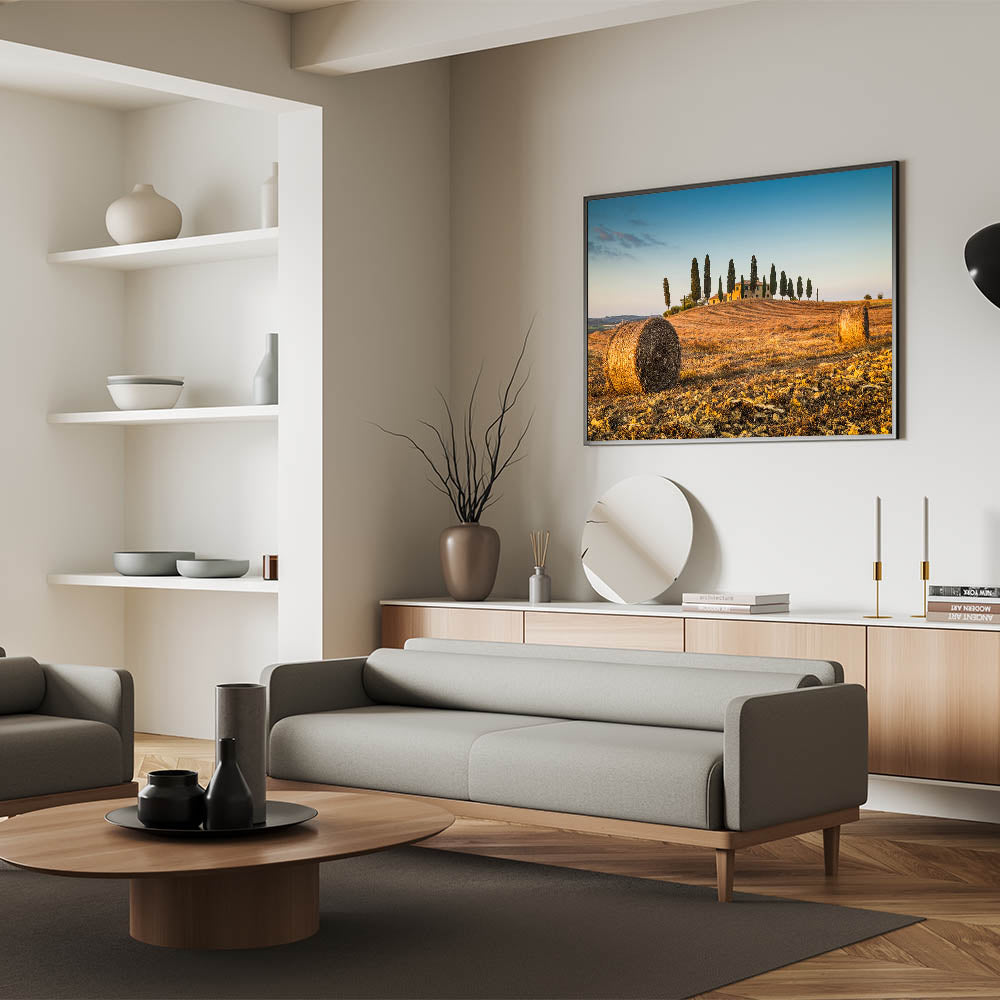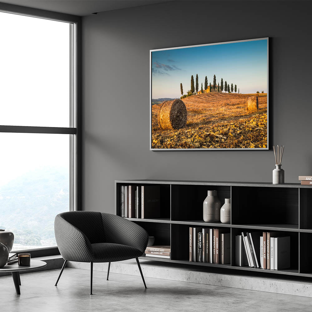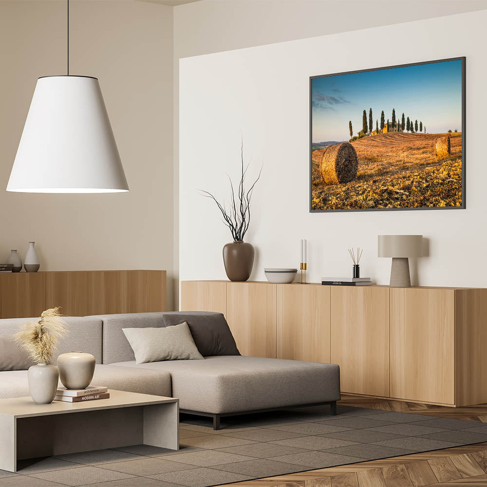 Capture the tranquil beauty of Italy’s rural charm with this Tuscan landscape artwork. This Tuscany scenery canvas print highlights a picturesque scene of rolling hills, golden hay bales, and iconic cypress trees basking in the glow of the Italian sun. Ideal for anyone looking to bring a touch of rustic elegance into their home, this Italy countryside wall art transports you to the peaceful countryside of Tuscany, evoking the warmth and serenity of this beloved region.