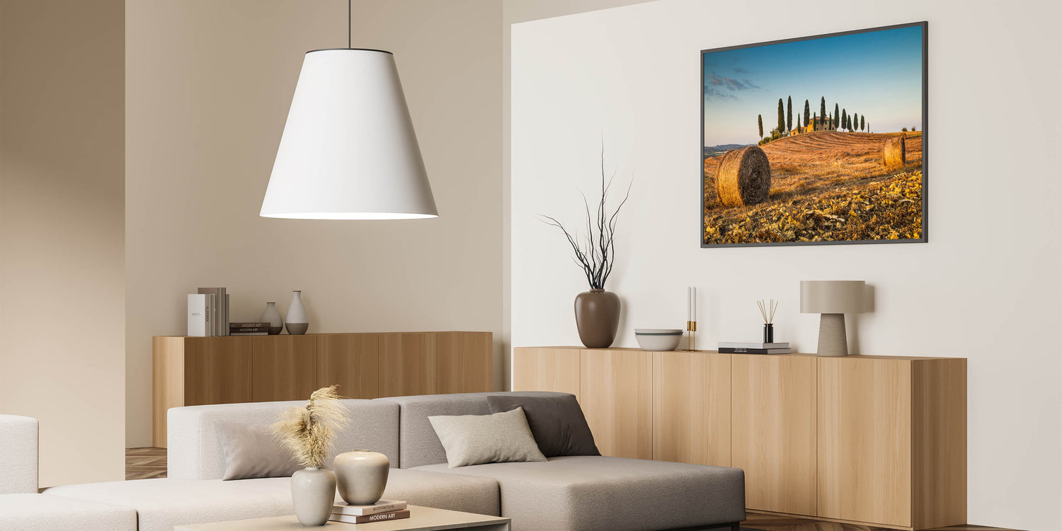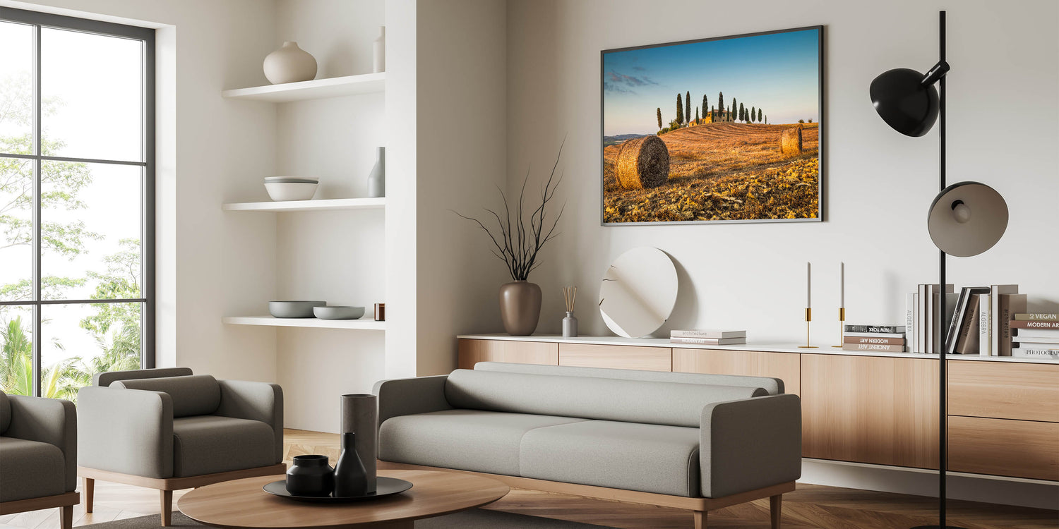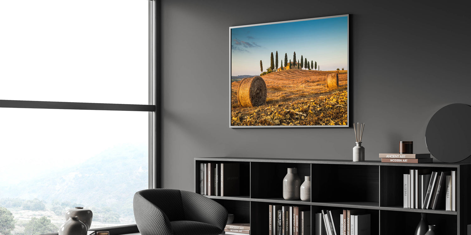 Capture the tranquil beauty of Italy’s rural charm with this Tuscan landscape artwork. This Tuscany scenery canvas print highlights a picturesque scene of rolling hills, golden hay bales, and iconic cypress trees basking in the glow of the Italian sun. Ideal for anyone looking to bring a touch of rustic elegance into their home, this Italy countryside wall art transports you to the peaceful countryside of Tuscany, evoking the warmth and serenity of this beloved region.