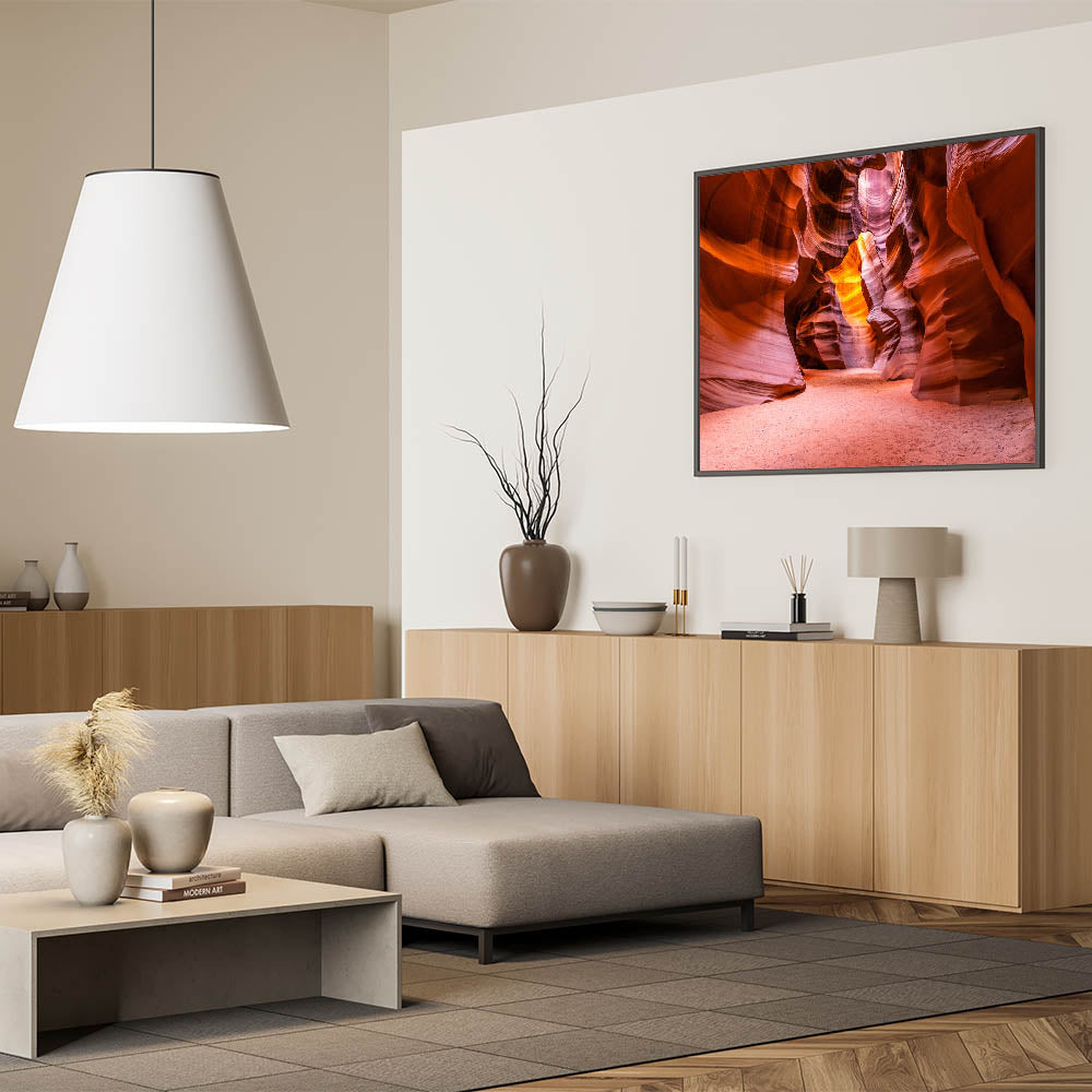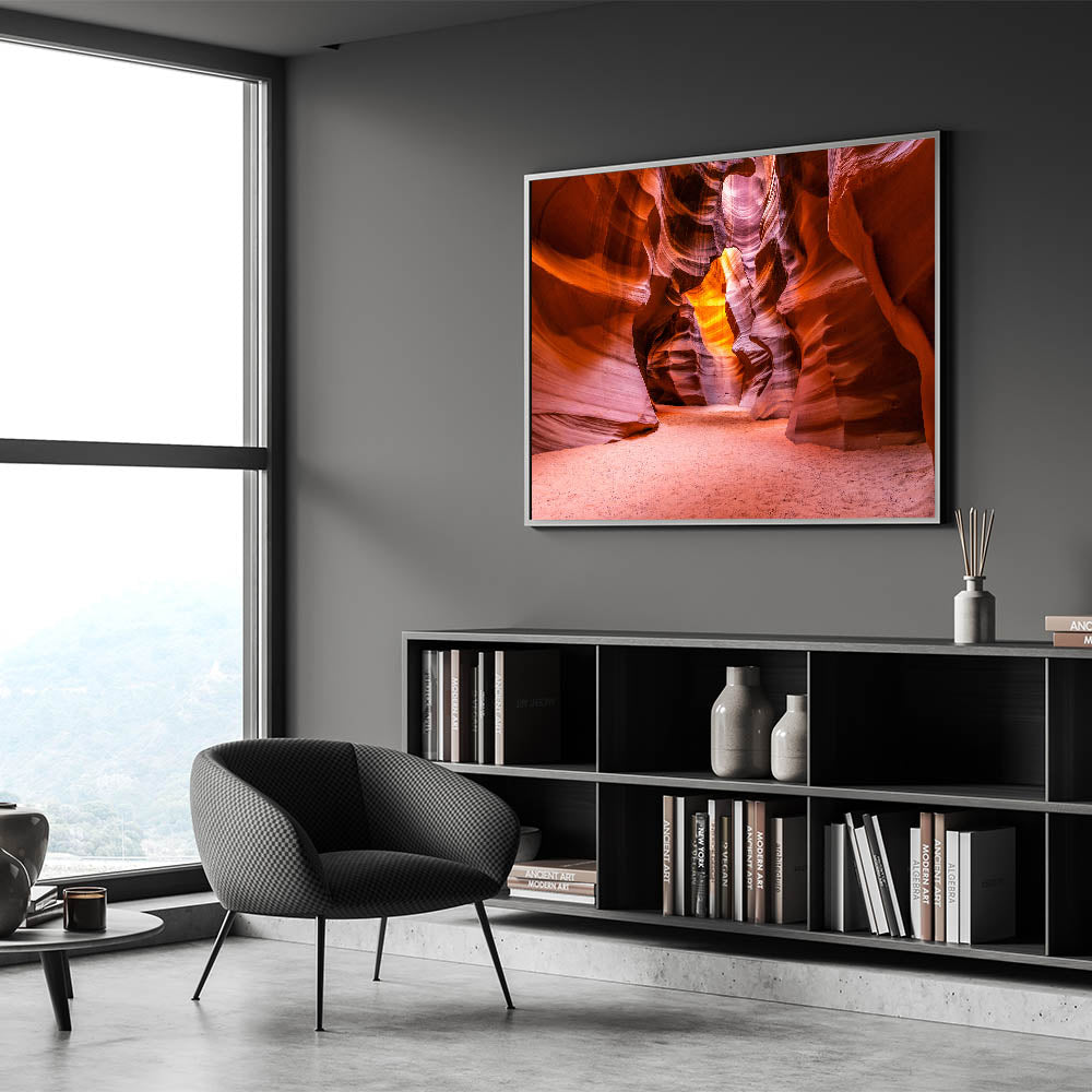 This Antelope Canyon wall art captures the warm, earthy tones of Arizona’s iconic red rock canyon. The soft curves of the sandstone and the glowing orange and red hues make this artwork an inviting and captivating piece for any space. With its intricate patterns and natural beauty, this stunning Antelope Canyon photography transports you to the heart of the majestic Arizona desert.