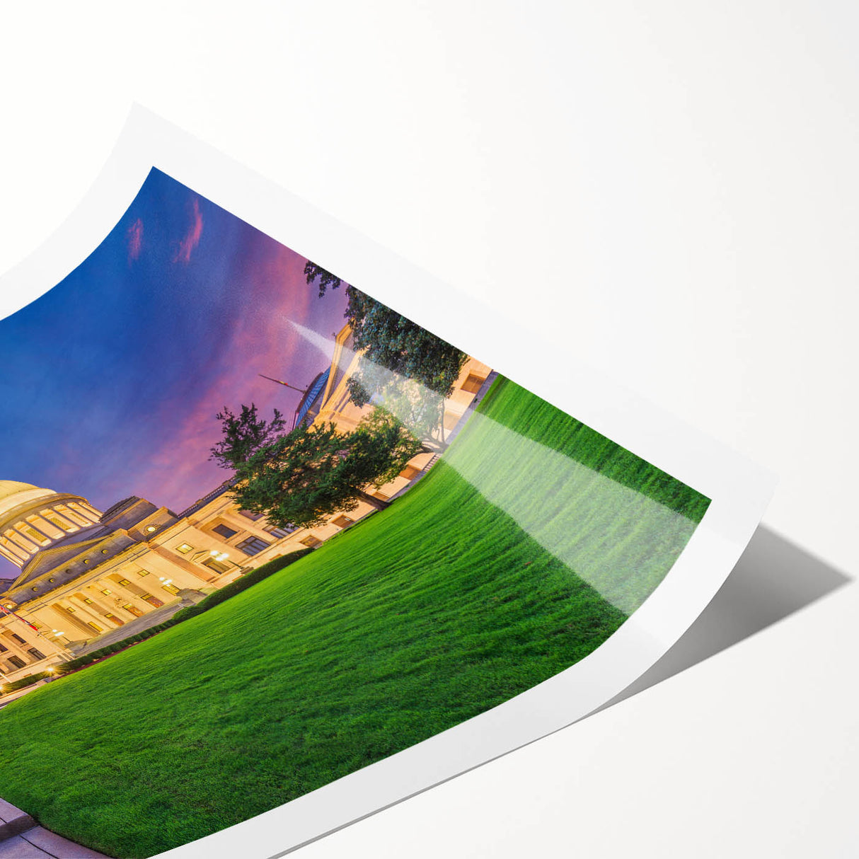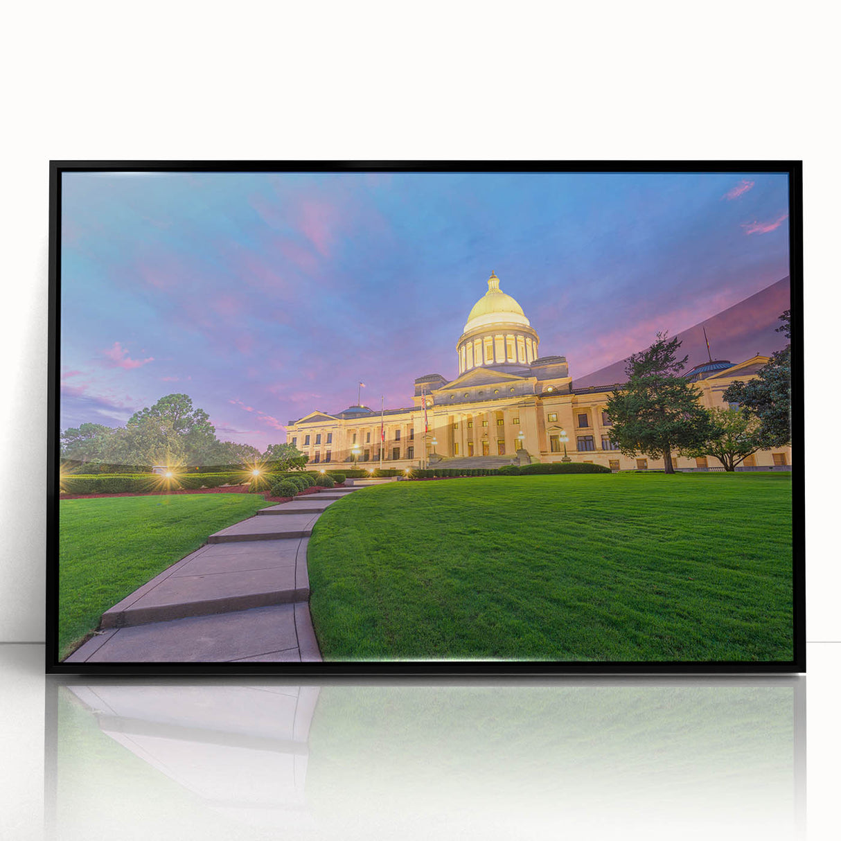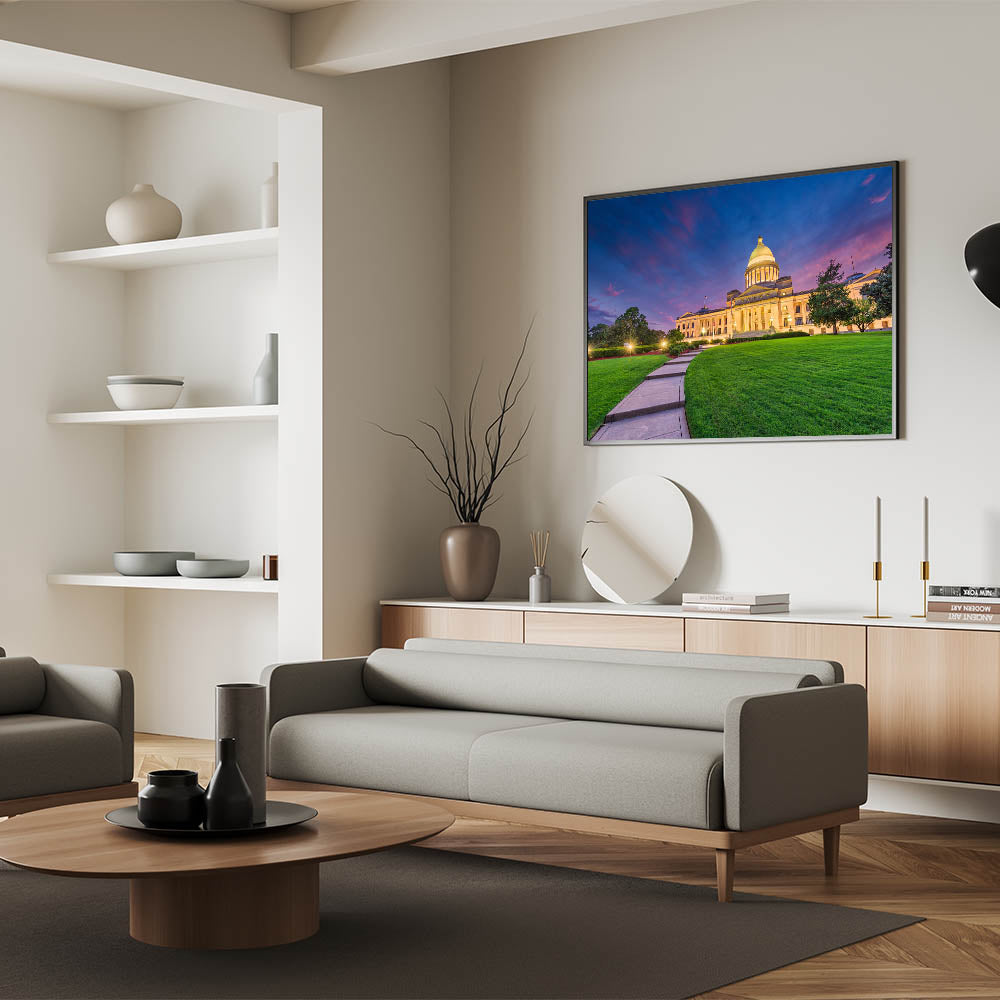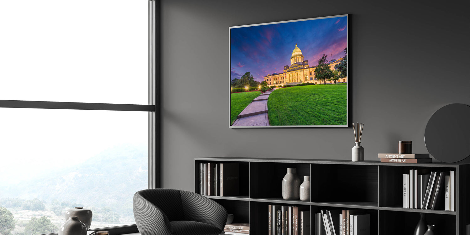 Experience the grandeur of Arkansas’s iconic Capitol building at twilight with this stunning art print. The twilight sky’s rich purples and pinks provide a dramatic backdrop to the Capitol’s majestic architecture, while the lush green lawn in the foreground adds a natural balance. This piece of art beautifully combines the historic elegance of the Capitol with the natural beauty of Arkansas’s landscapes, making it a perfect addition to any space.