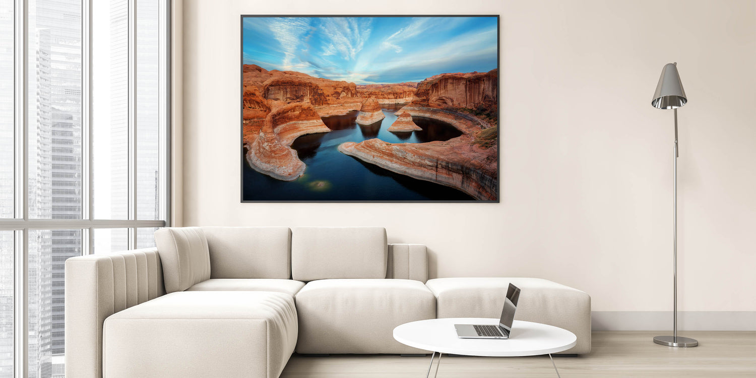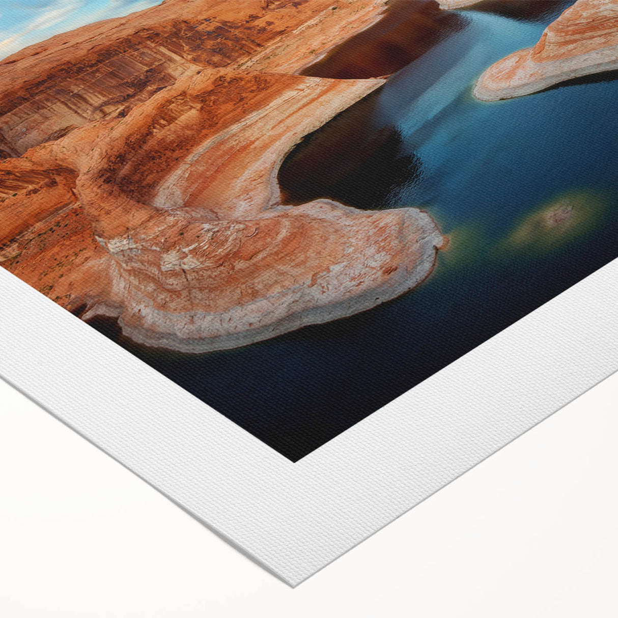 Enhance your space with this serene Glen Canyon wall art, featuring the striking beauty of the Arizona desert landscape. The smooth, flowing curves of the canyon contrasted against the deep blue waters create a peaceful and mesmerizing scene. This artwork captures the essence of the Southwest, showcasing nature’s elegance in a vibrant mix of rich earth tones and sky blues. Whether displayed in your living room, office, or bedroom, this Glen Canyon photography will bring a sense of calm and natural beauty to any space.