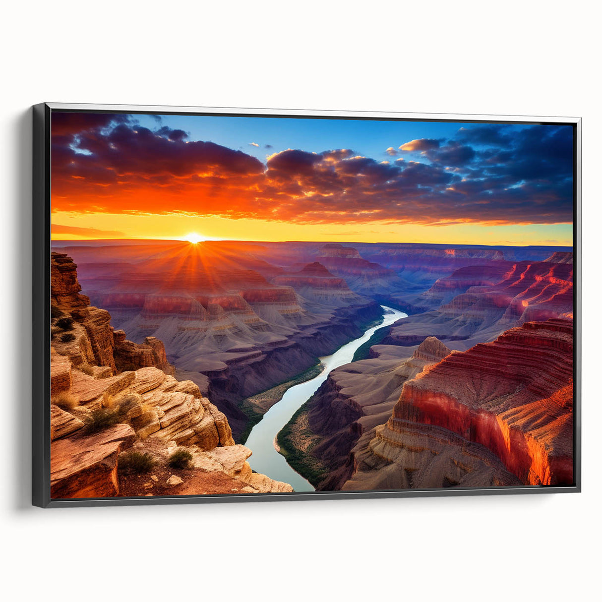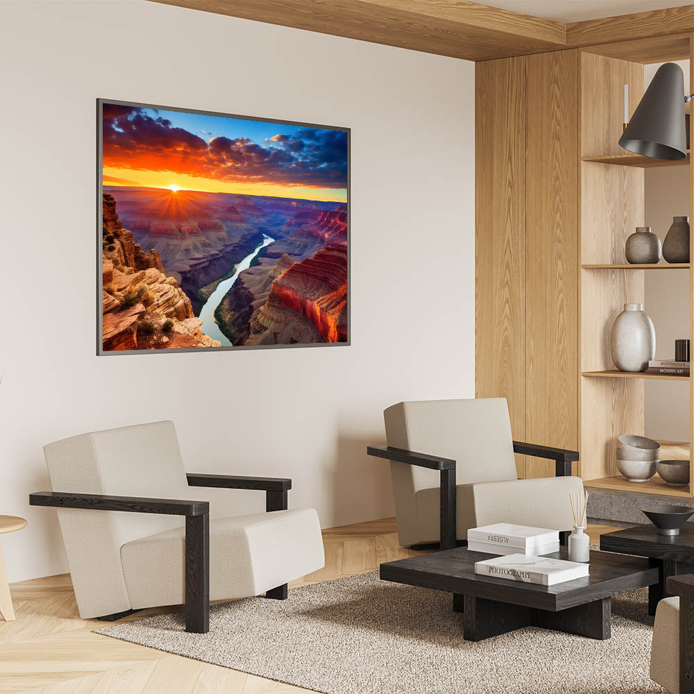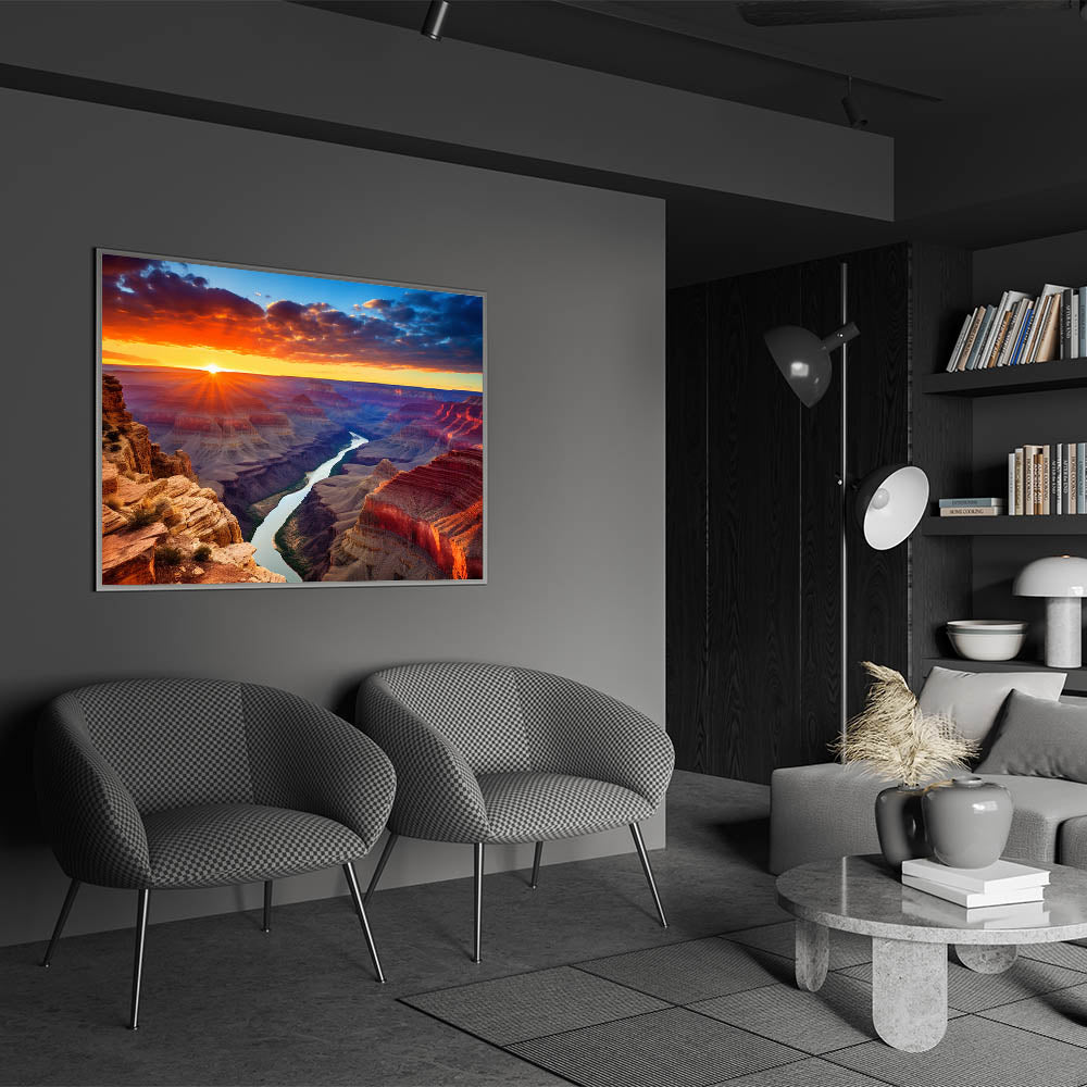 Experience the breathtaking beauty of the Grand Canyon at sunset with this vibrant wall art. The fiery sky illuminates the canyon’s rugged cliffs, creating a stunning contrast with the winding Colorado River below. Perfect for adding warmth and natural beauty to your home, this scenic Grand Canyon painting is ideal for Southwest-inspired decor. The dramatic colors of the sunset and canyon make this artwork a focal point for any room.