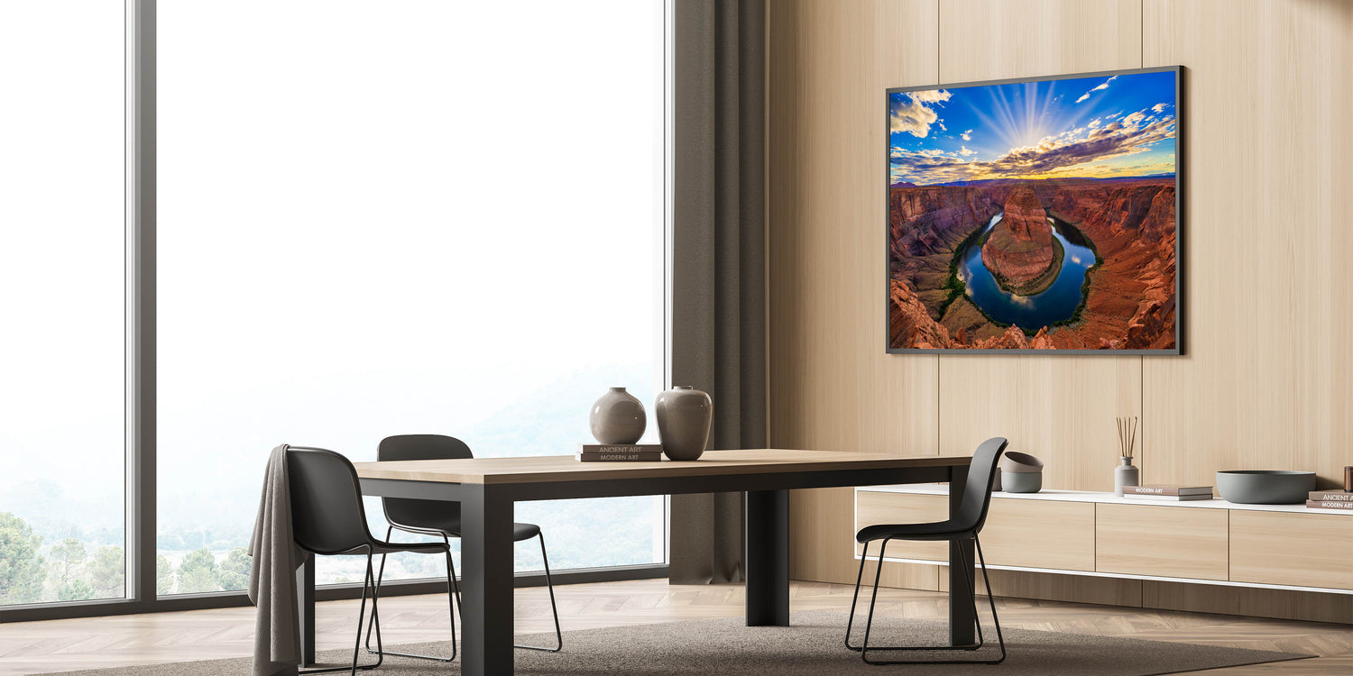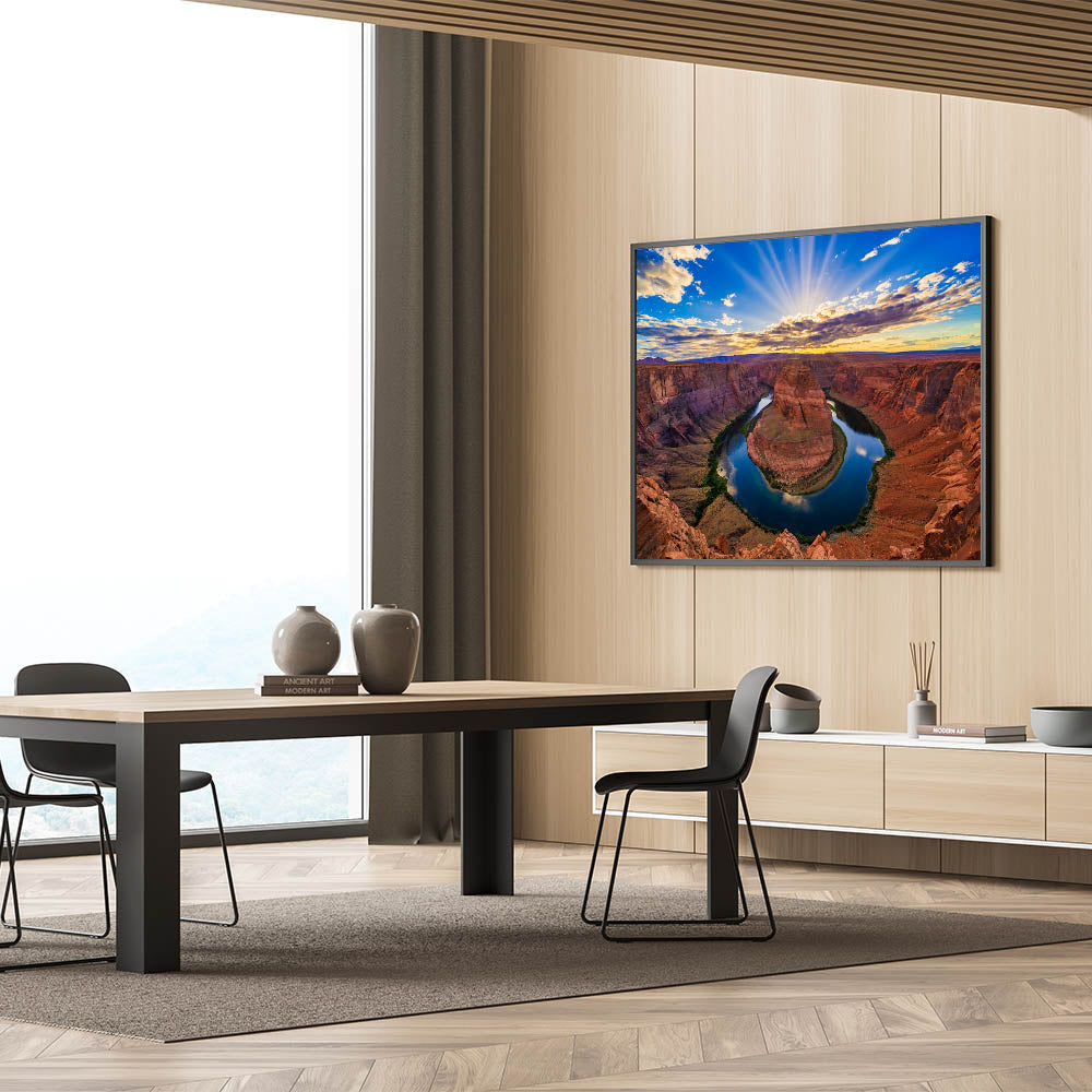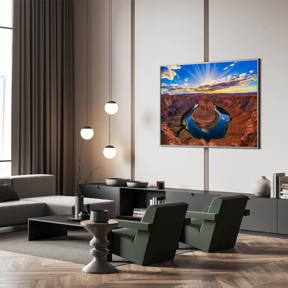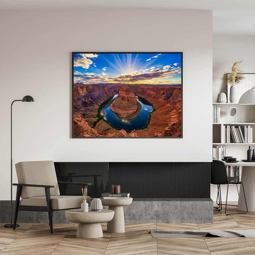 Immerse yourself in the stunning beauty of Arizona's landscape with this captivating view of Horseshoe Bend, beautifully illuminated by radiant sun rays. This scenic Horseshoe Bend print captures the grandeur of the Southwest, with the iconic curve of the Colorado River winding through the majestic red rock canyons. Perfect for any room, this nature-inspired wall art is available in multiple formats including Stretched Canvas, Framed Prints, and Acrylic Glass. The vibrant colors and intricate details make it an ideal addition to any home decor, adding a touch of Southwest charm and natural beauty.