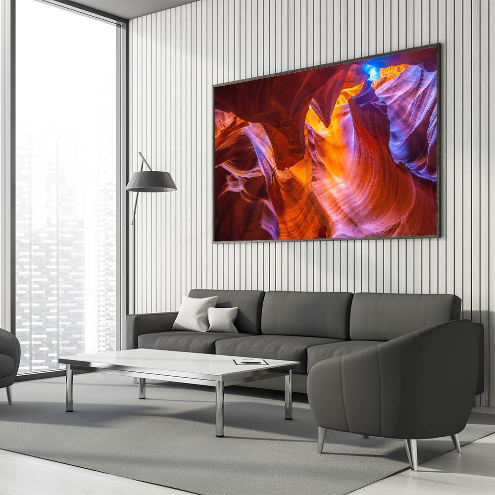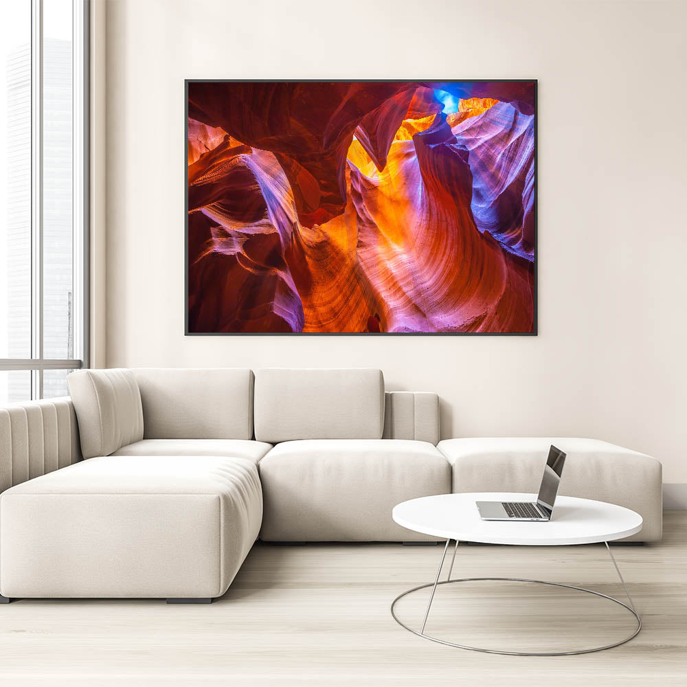This vibrant Antelope Canyon wall art captures the dramatic beauty of Arizona’s red rock formations. With its rich oranges, purples, and reds, this striking piece brings the colorful majesty of the canyon to life, making it the perfect focal point for any room. The dynamic interplay of natural light and shadow highlights the canyon’s swirling sandstone formations, adding depth and movement to this stunning Antelope Canyon photography.