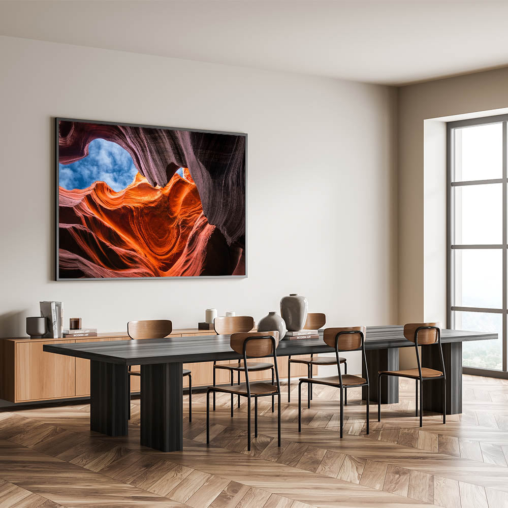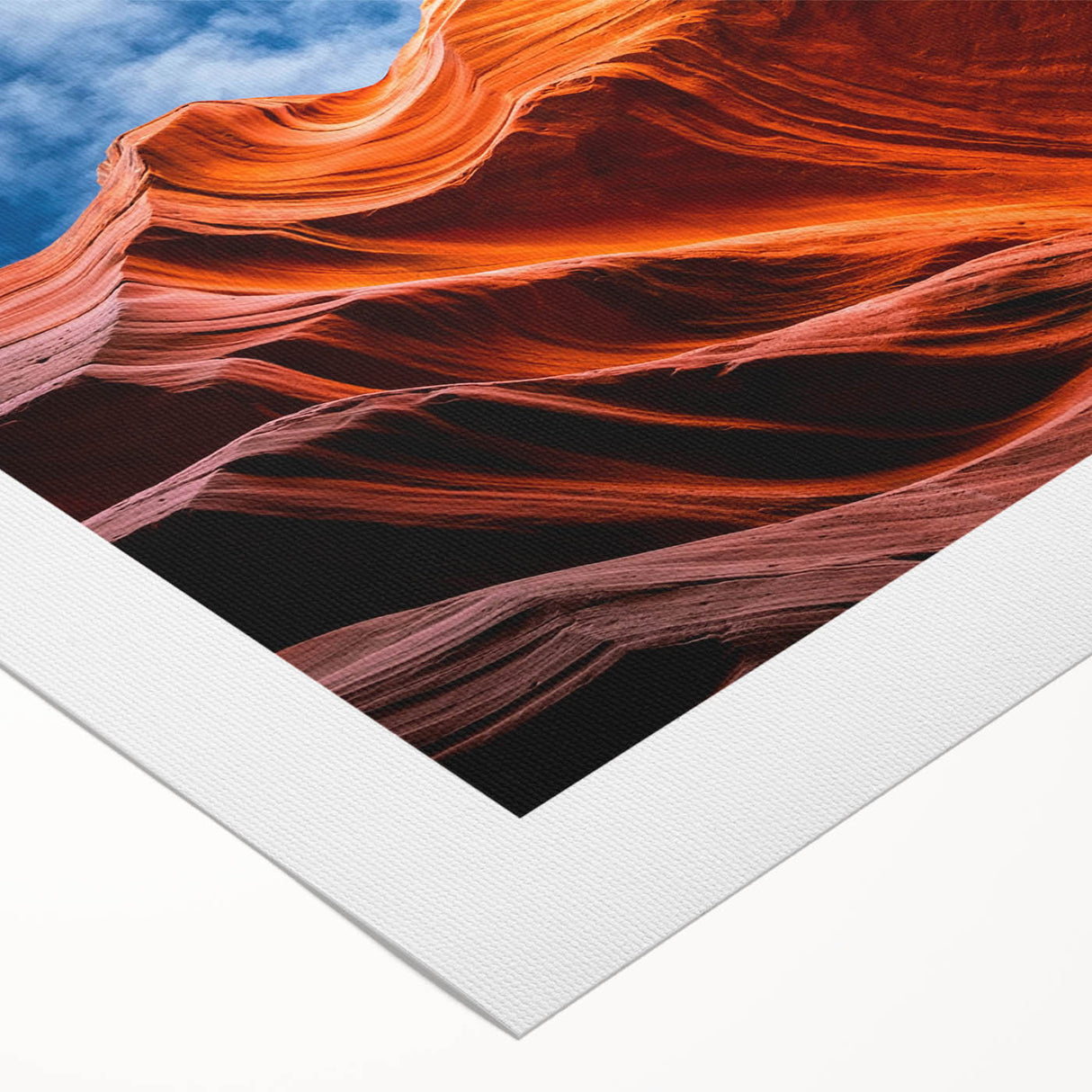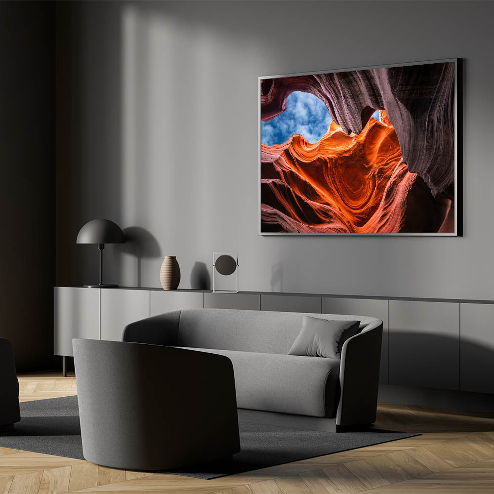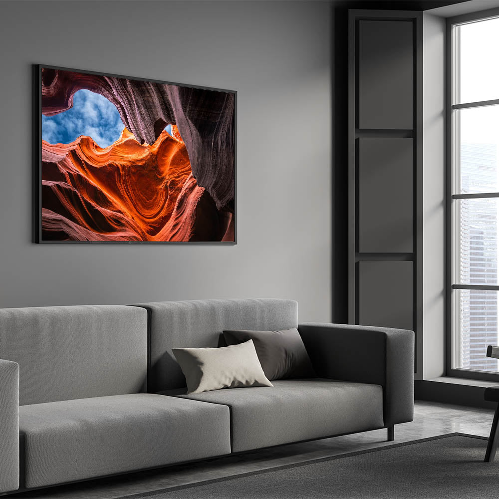 This vivid Antelope Canyon wall art showcases the mesmerizing beauty of Arizona’s famed red rock canyon. The warm tones of the orange sandstone formations contrast beautifully with the cool blue sky, creating a dynamic and visually stunning composition. The flowing, intricate patterns of the canyon are captured with incredible detail, making this stunning Antelope Canyon photography an ideal statement piece for any room.