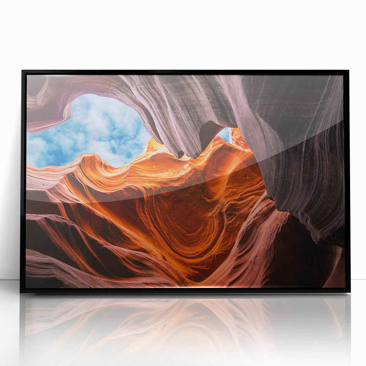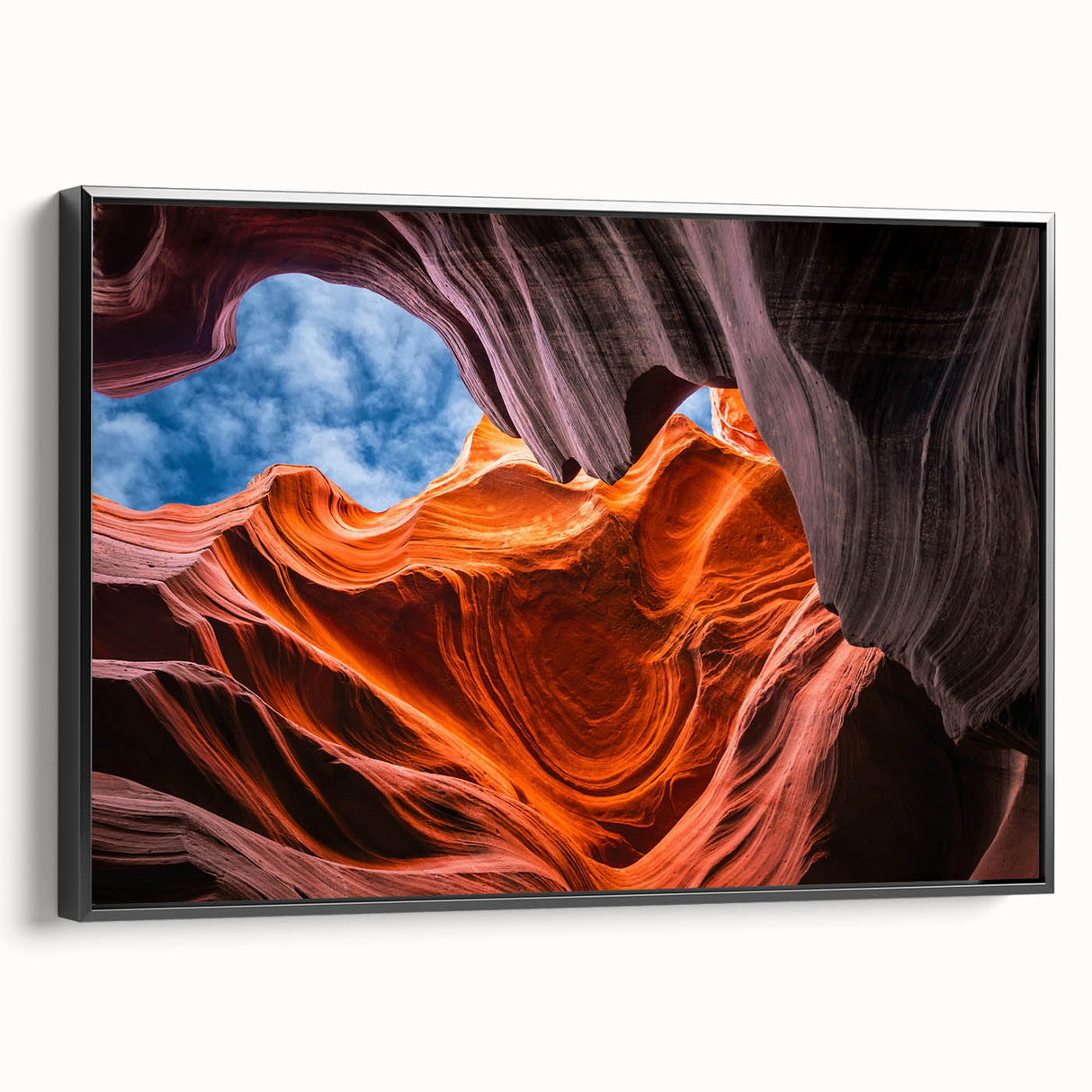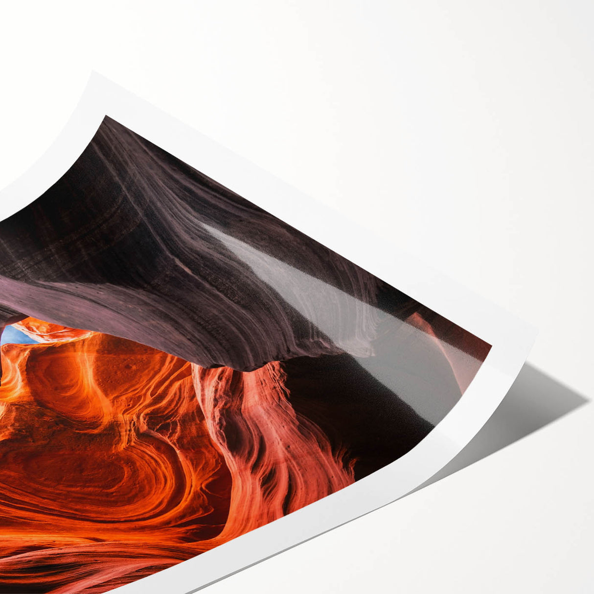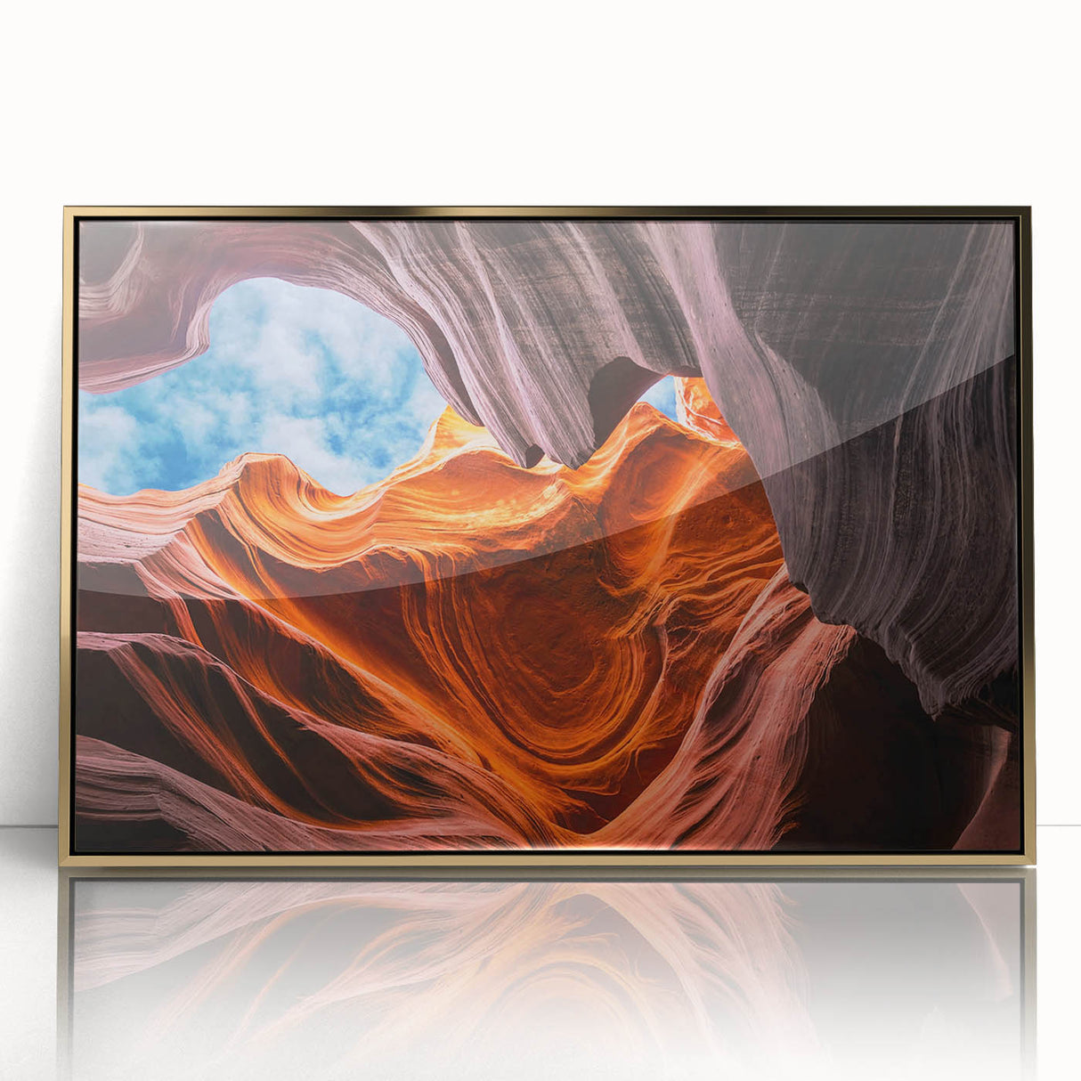 This vivid Antelope Canyon wall art showcases the mesmerizing beauty of Arizona’s famed red rock canyon. The warm tones of the orange sandstone formations contrast beautifully with the cool blue sky, creating a dynamic and visually stunning composition. The flowing, intricate patterns of the canyon are captured with incredible detail, making this stunning Antelope Canyon photography an ideal statement piece for any room.