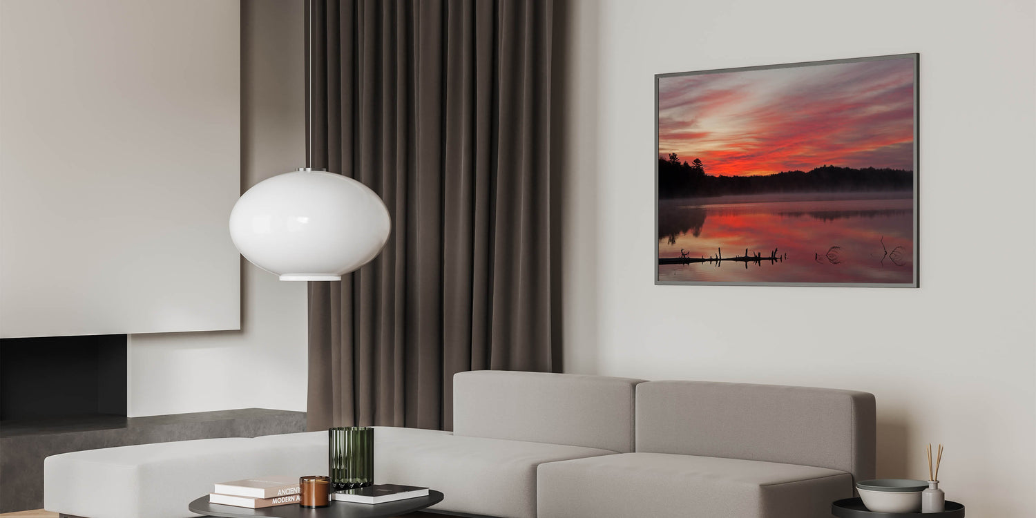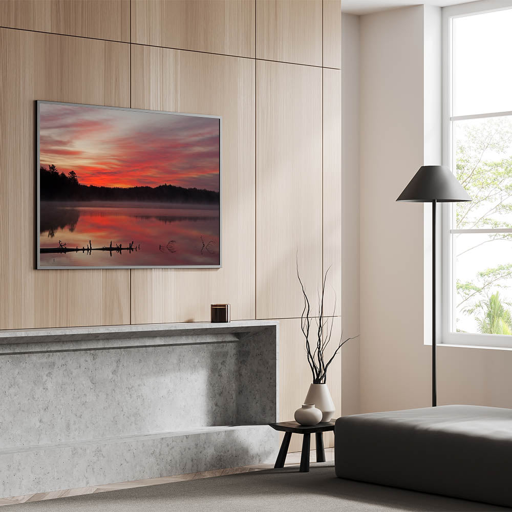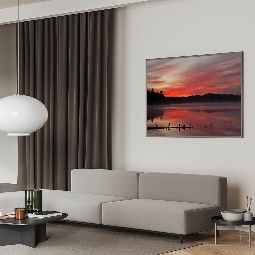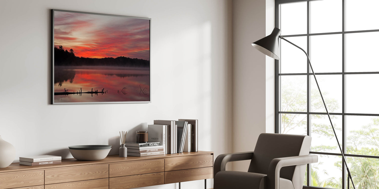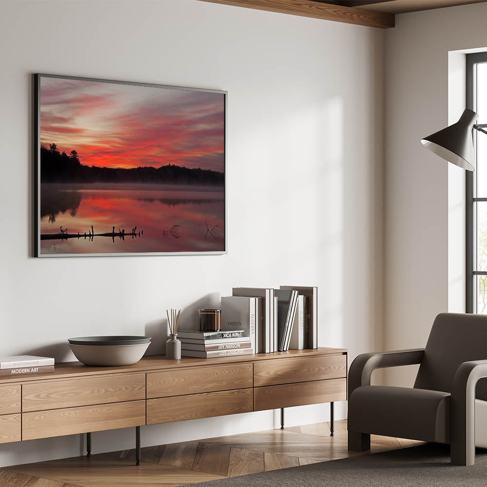 Experience the captivating beauty of a fiery sunset over a peaceful lake in Michigan’s Upper Peninsula with this stunning canvas print. Part of our Upper Peninsula Wall Art Collection, this artwork captures the vivid red and orange hues as they reflect off the lake's surface, creating a serene and mesmerizing atmosphere. This piece is perfect for adding warmth and natural beauty to any room, bringing a piece of the Upper Peninsula's landscape indoors.