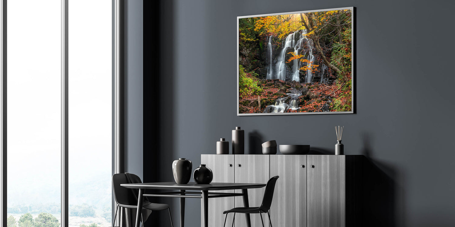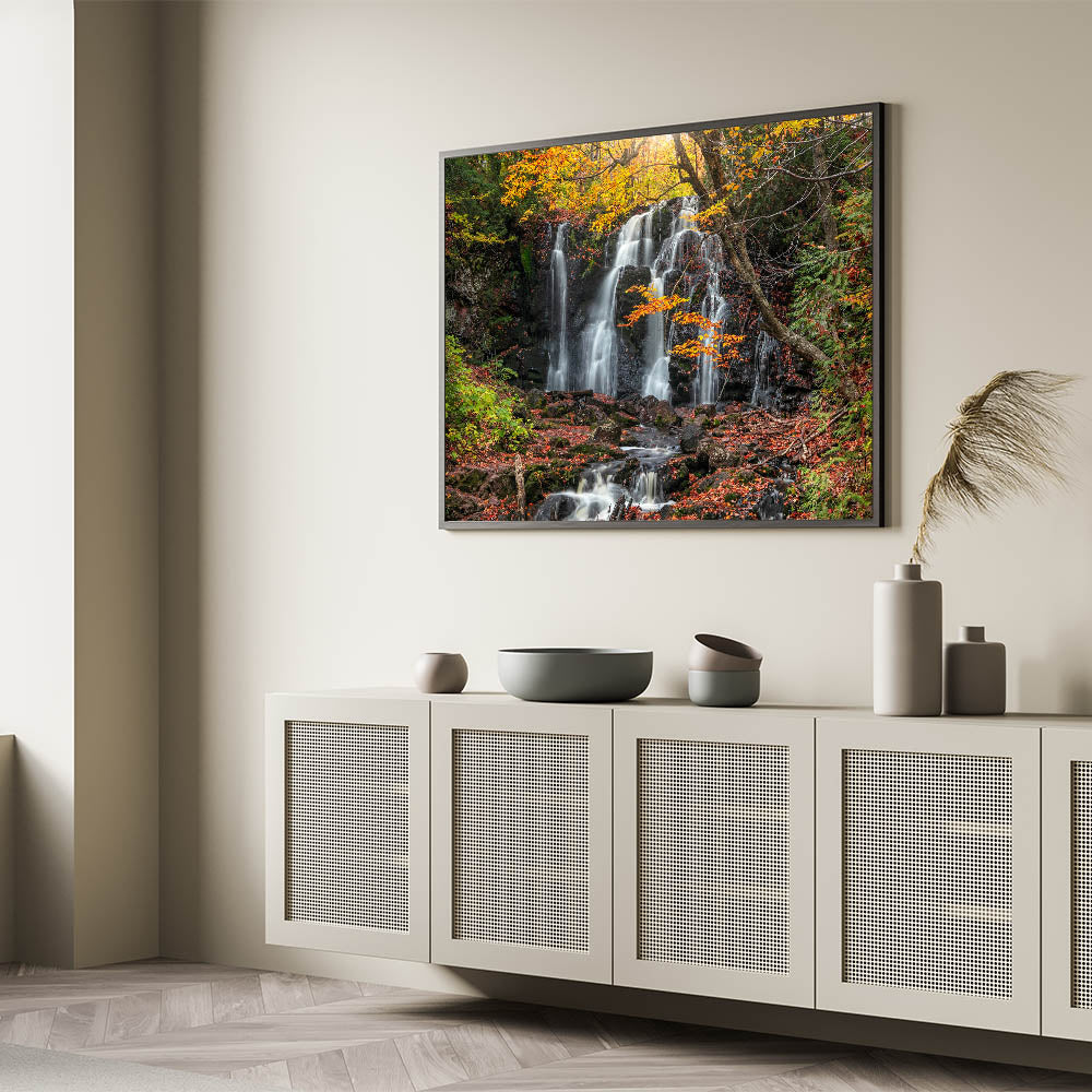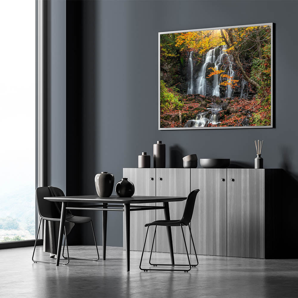 Embrace the enchanting beauty of Michigan's Upper Peninsula with this autumn waterfall landscape print. Part of our Upper Peninsula Wall Art Collection, this piece captures the vibrant fall colors as they frame a cascading waterfall, creating a serene and natural scene that brings the essence of the Upper Peninsula into any room. This unique Upper Peninsula art celebrates nature’s seasonal transformation and is perfect for those who love the colors and charm of Michigan’s landscapes.