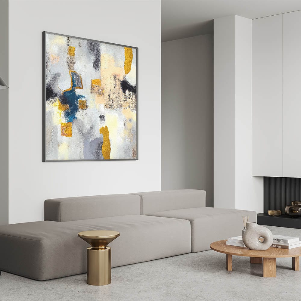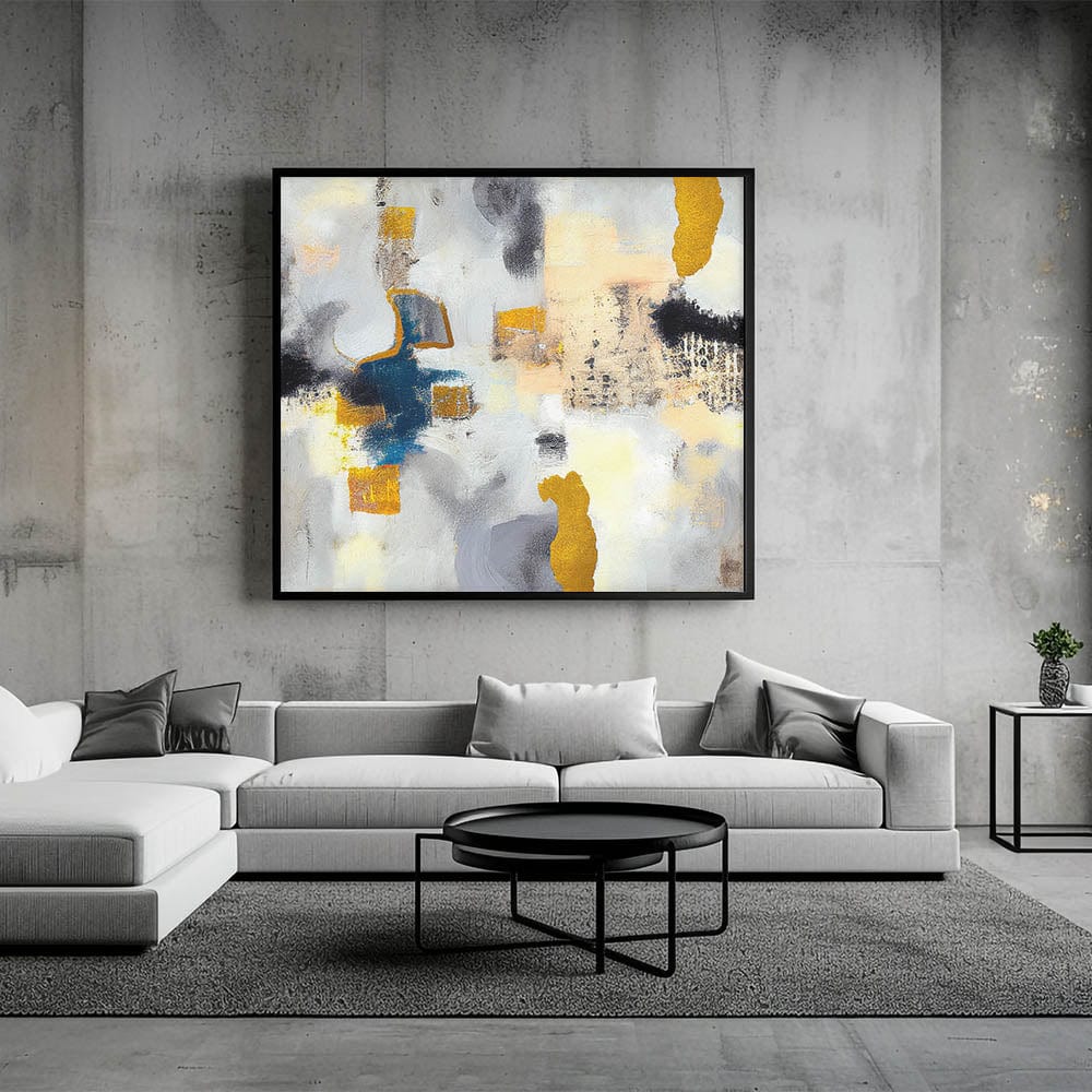Transform your space with this abstract canvas wall art, a stunning piece of contemporary abstract art designed to bring depth and elegance to your décor. This modern abstract painting features a striking fusion of gold, deep blue, and gray, accentuated by expressive textures and fluid brushstrokes. The captivating balance of warm and cool tones makes this artwork a perfect statement piece for those seeking large abstract wall art with a refined aesthetic.