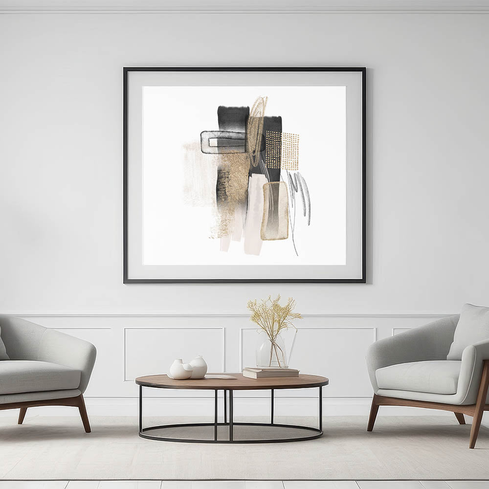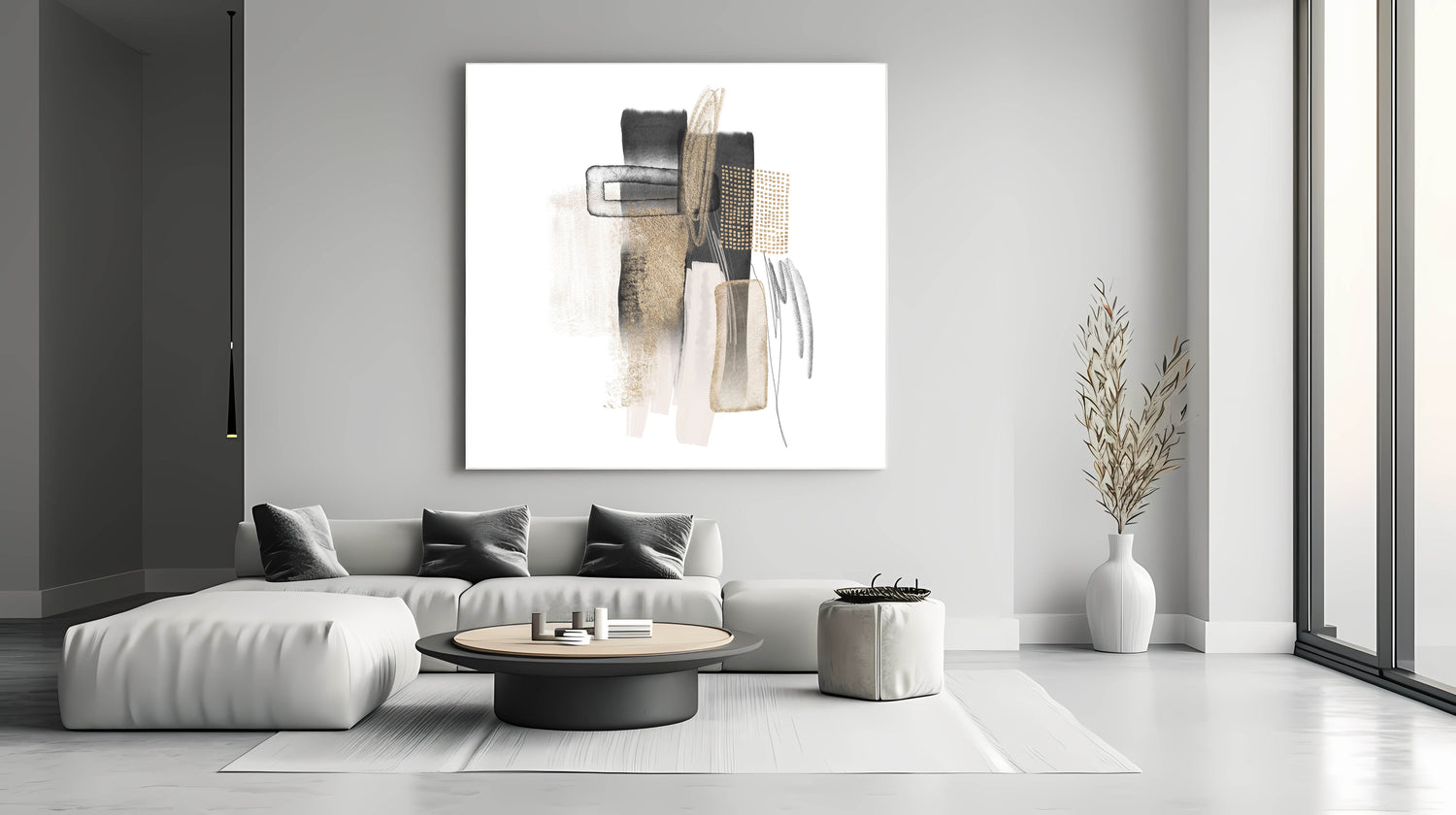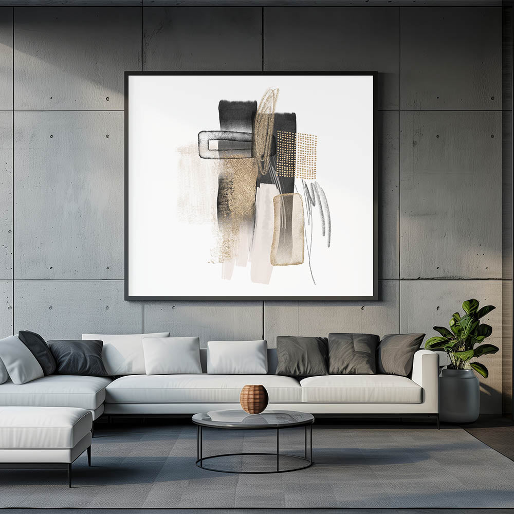Bring contemporary sophistication to your space with this high-quality geometric minimalist abstract wall art. Featuring striking contrasts of black, white, and gold, this piece merges bold geometric shapes and textured patterns, creating an elegant and modern design. The combination of soft brushstrokes and geometric precision makes it the perfect addition to both minimalist and chic interiors.