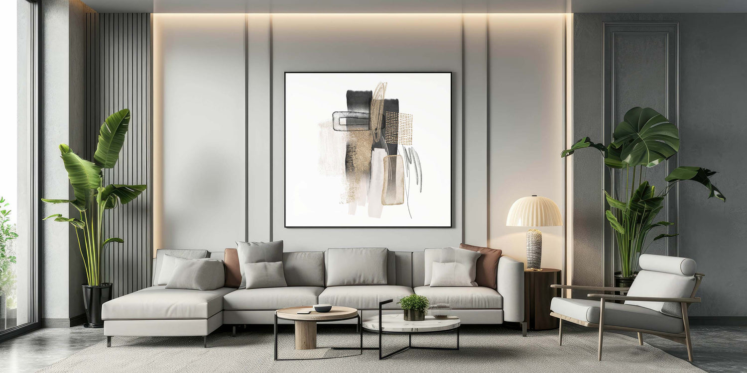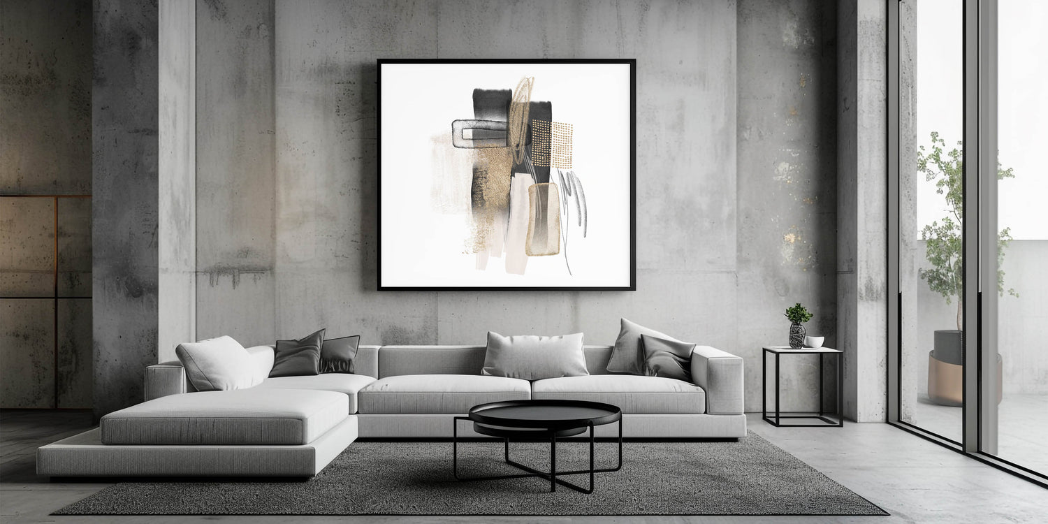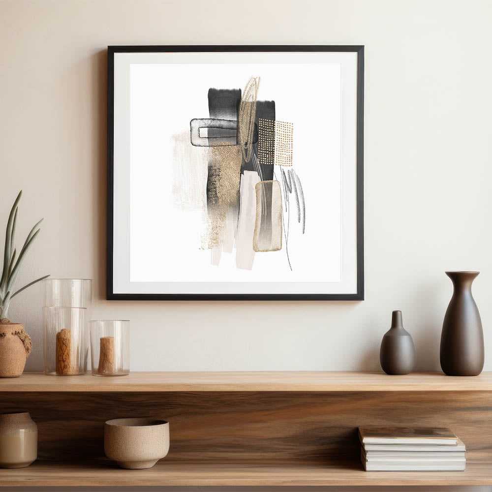 Bring contemporary sophistication to your space with this high-quality geometric minimalist abstract wall art. Featuring striking contrasts of black, white, and gold, this piece merges bold geometric shapes and textured patterns, creating an elegant and modern design. The combination of soft brushstrokes and geometric precision makes it the perfect addition to both minimalist and chic interiors.