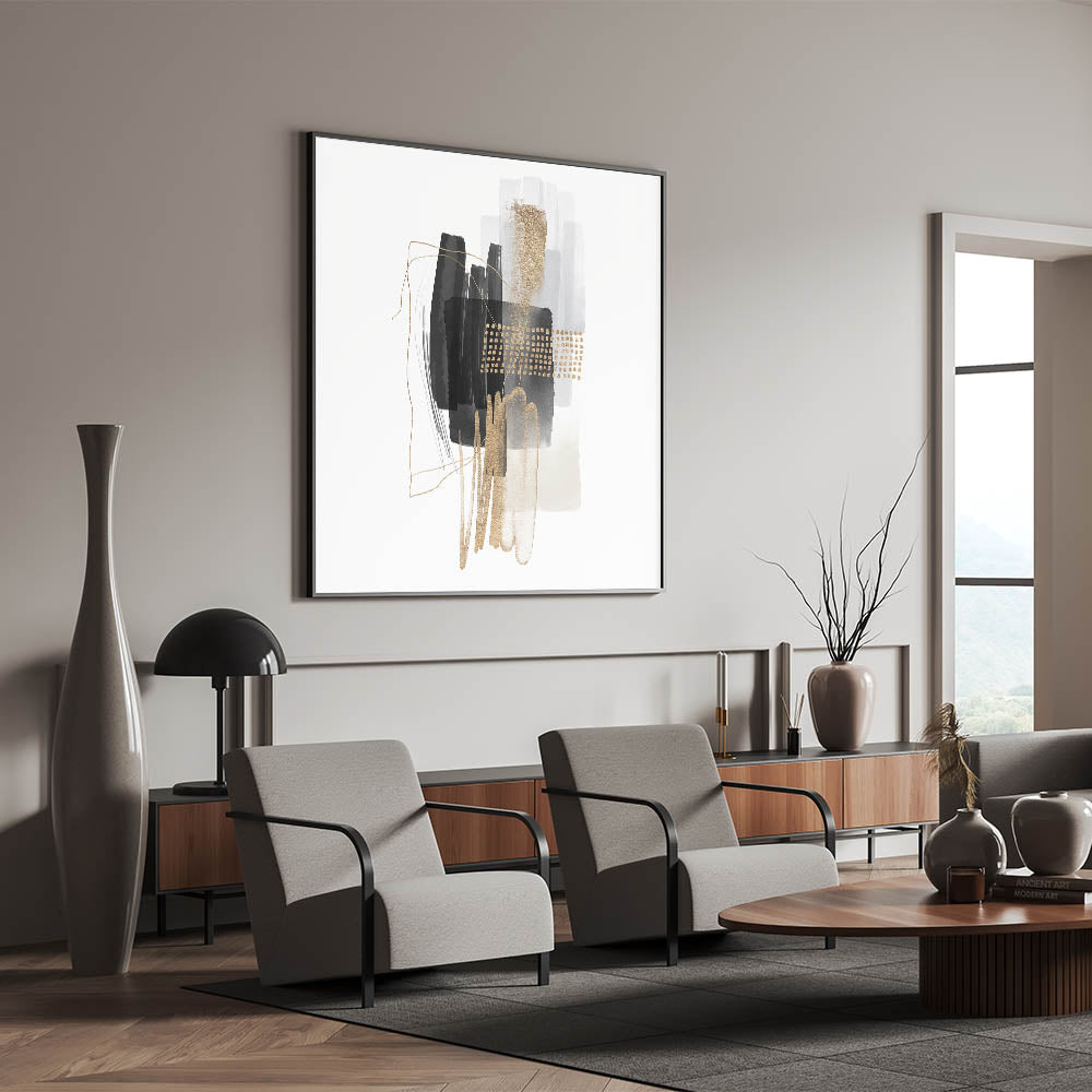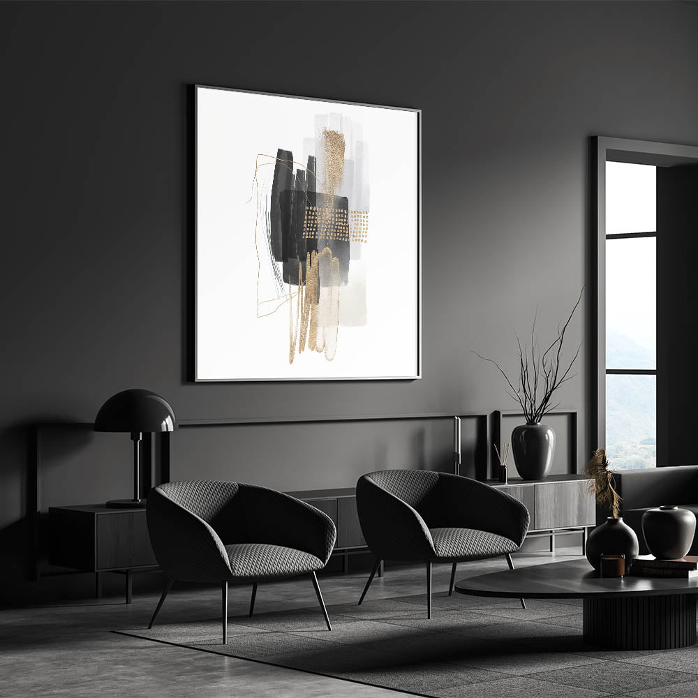 Add a bold statement to your space with this high-quality geometric minimalist abstract wall art, featuring a striking interplay of black, gray, and shimmering gold. The layered geometric forms and brushstrokes create a visually dynamic composition, making it a standout piece in any room. This design reflects modern and contemporary geometric design, ideal for urban-inspired interiors.