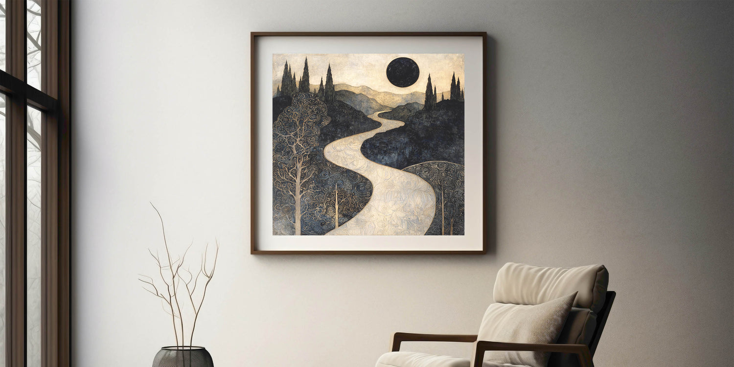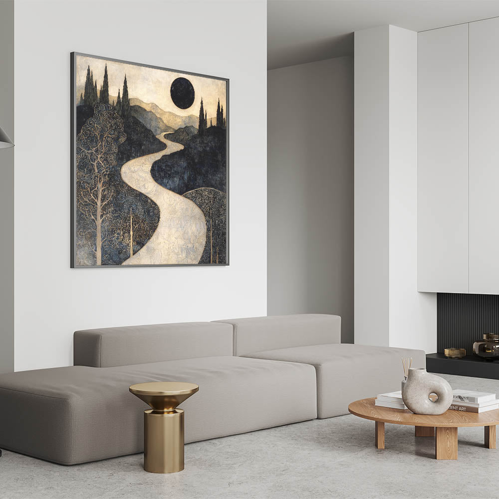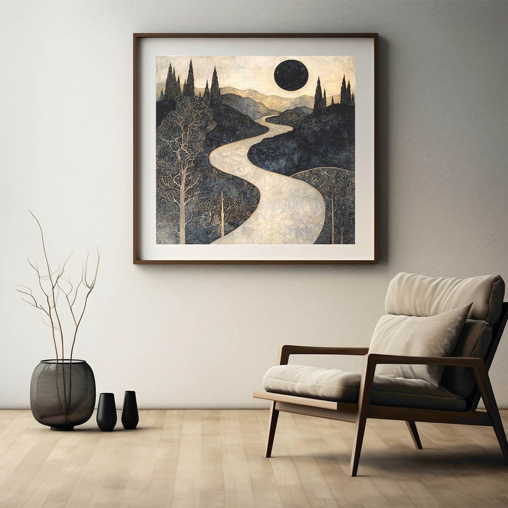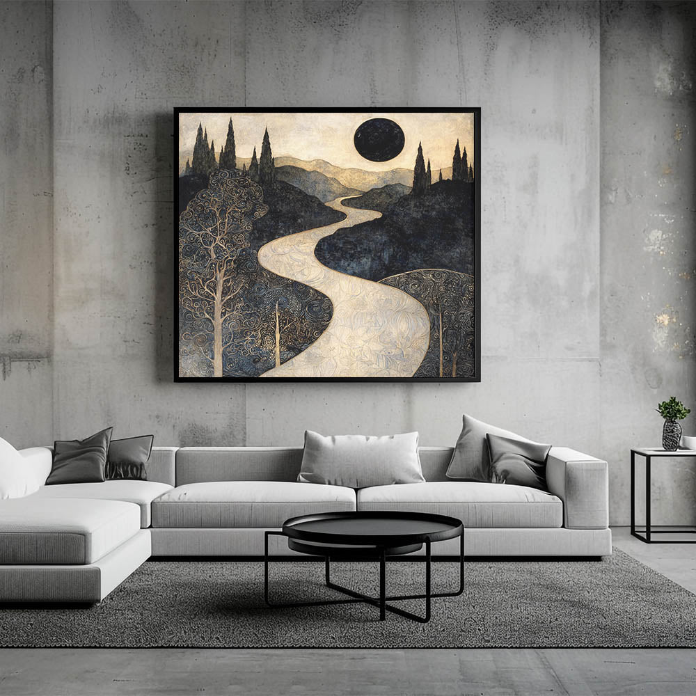 Immerse yourself in the allure of this abstract floral artwork for home decor, featuring an enchanting celestial landscape with intricate golden patterns and deep black tones. This modern flower abstract painting captures the mystery of a winding golden river beneath an eclipsed sun, evoking a dreamlike and elegant atmosphere. A stunning addition to contemporary interiors, this contemporary botanical canvas print blends fine details with bold contrasts for a truly captivating piece.