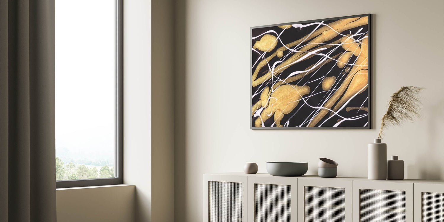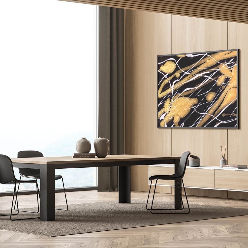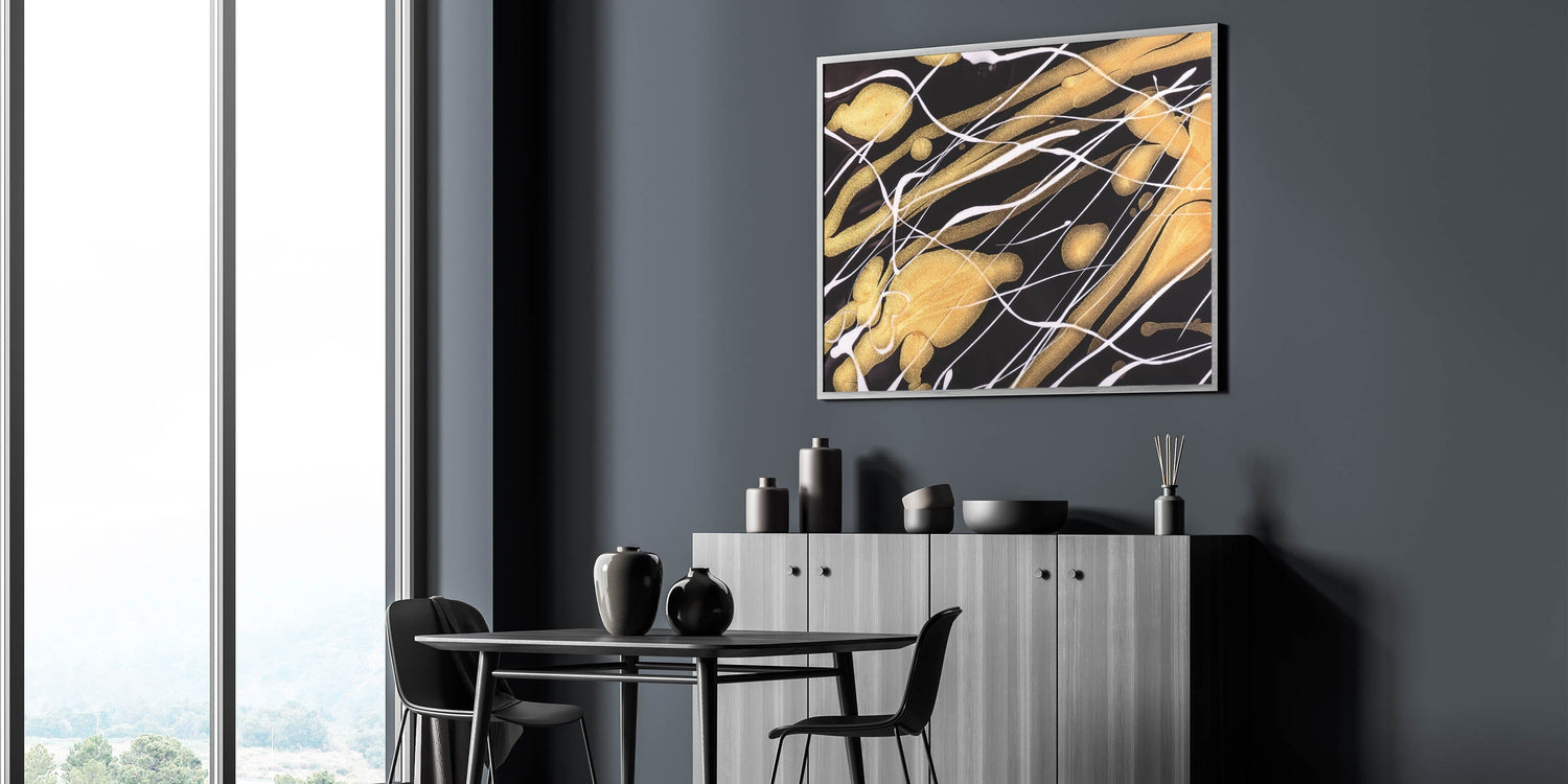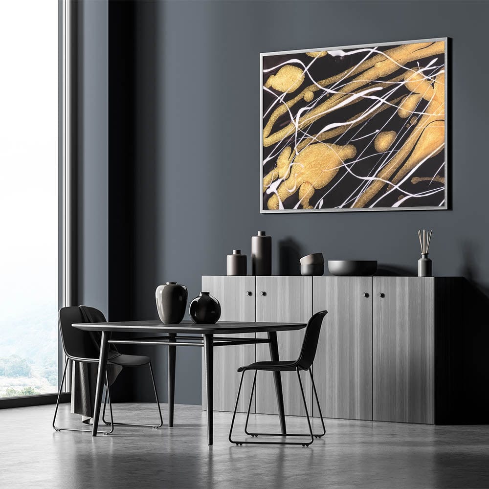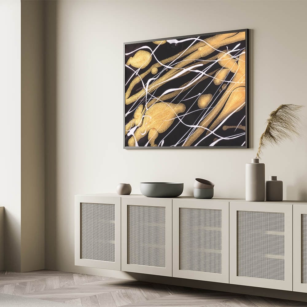 Add a touch of elegance to your space with this contemporary fluid art print. Featuring a striking contrast of black, gold, and white, this luxurious abstract wall decor showcases dynamic streaks of shimmering metallic tones against a bold dark background.
