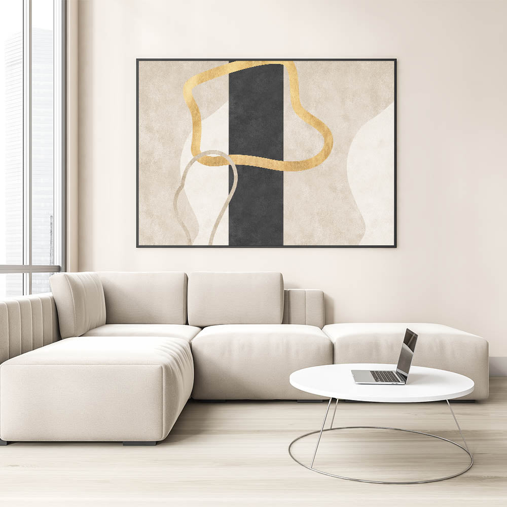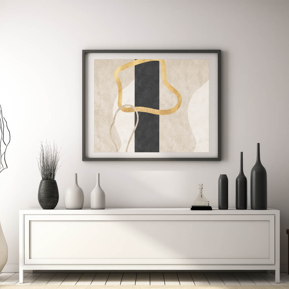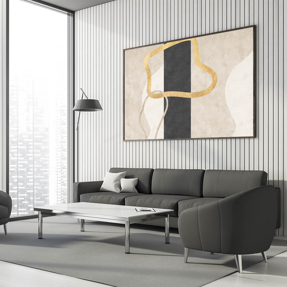 Add a bold yet refined accent to your interior with this striking design from the Earthen Harmony Abstracts collection. This modern abstract art piece features fluid golden lines intertwined over a central vertical black column, set against soft neutral tones of beige and cream. The result is an elegant balance of simplicity and contrast—perfect for lovers of minimalist wall decor and contemporary sophistication.