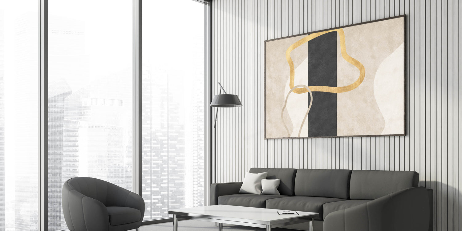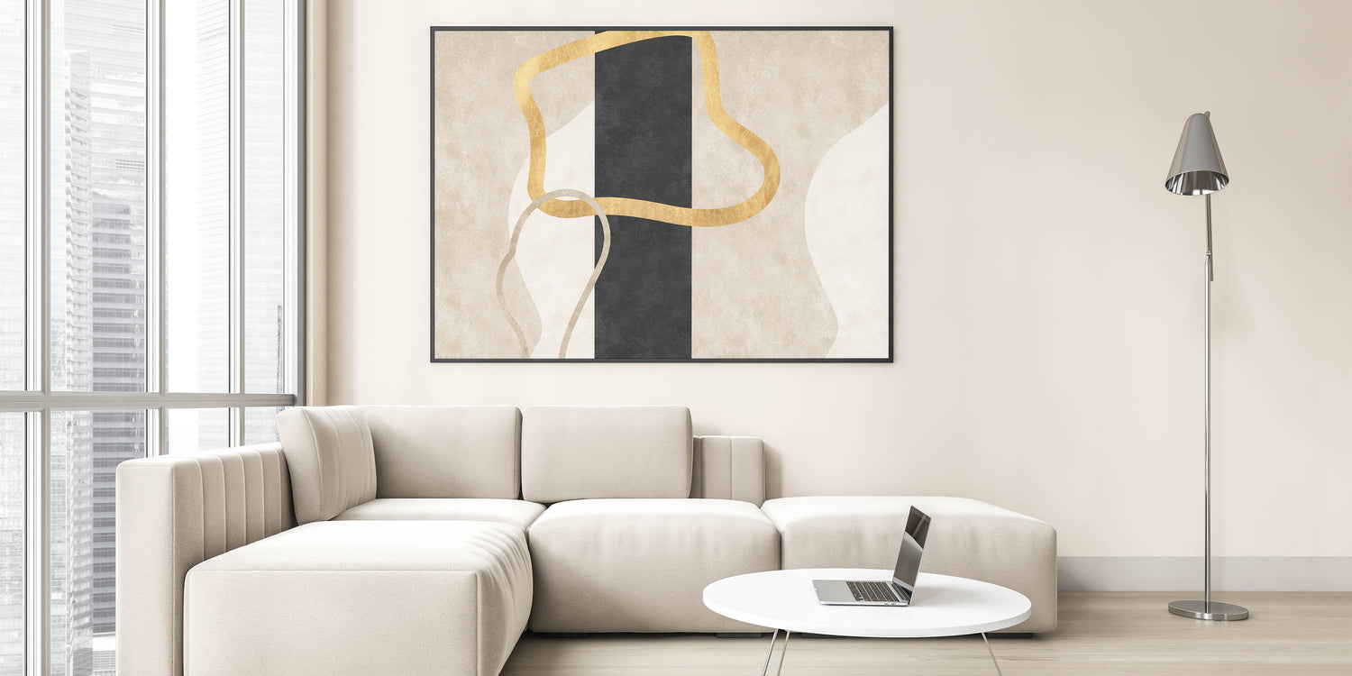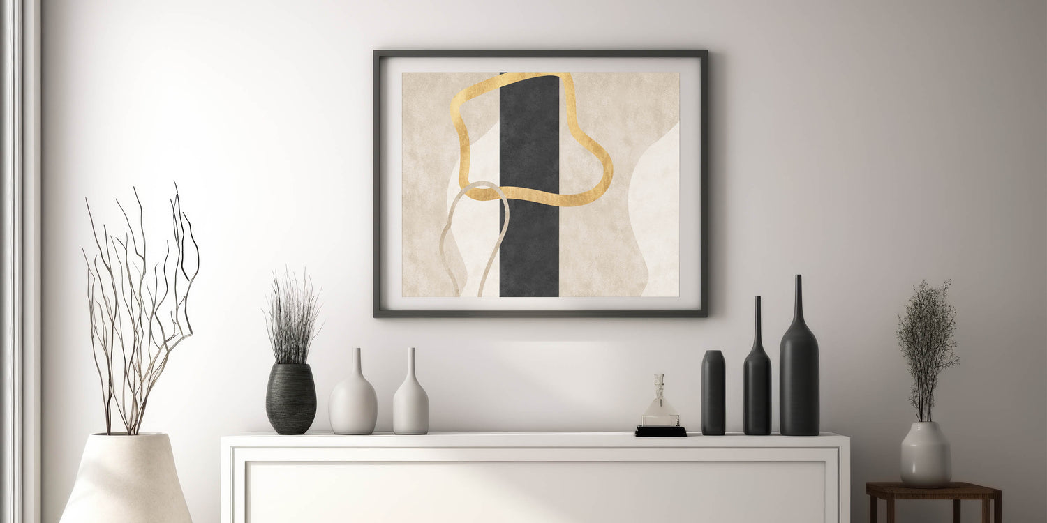 Add a bold yet refined accent to your interior with this striking design from the Earthen Harmony Abstracts collection. This modern abstract art piece features fluid golden lines intertwined over a central vertical black column, set against soft neutral tones of beige and cream. The result is an elegant balance of simplicity and contrast—perfect for lovers of minimalist wall decor and contemporary sophistication.