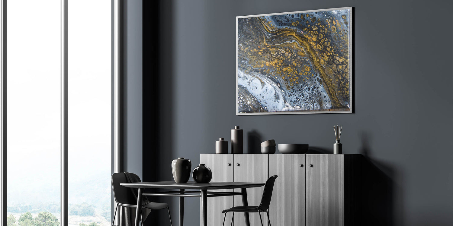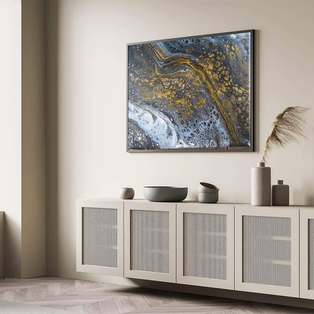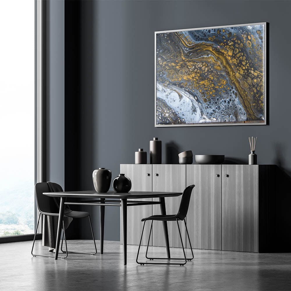 Make a bold statement with this elegant abstract fluid canvas. Featuring a striking blend of black, gold, and hints of grey, this modern gold & black wall art captivates with its rich textures and flowing organic patterns. The luxurious metallic highlights create a sense of movement and depth, making it a visually dynamic piece.