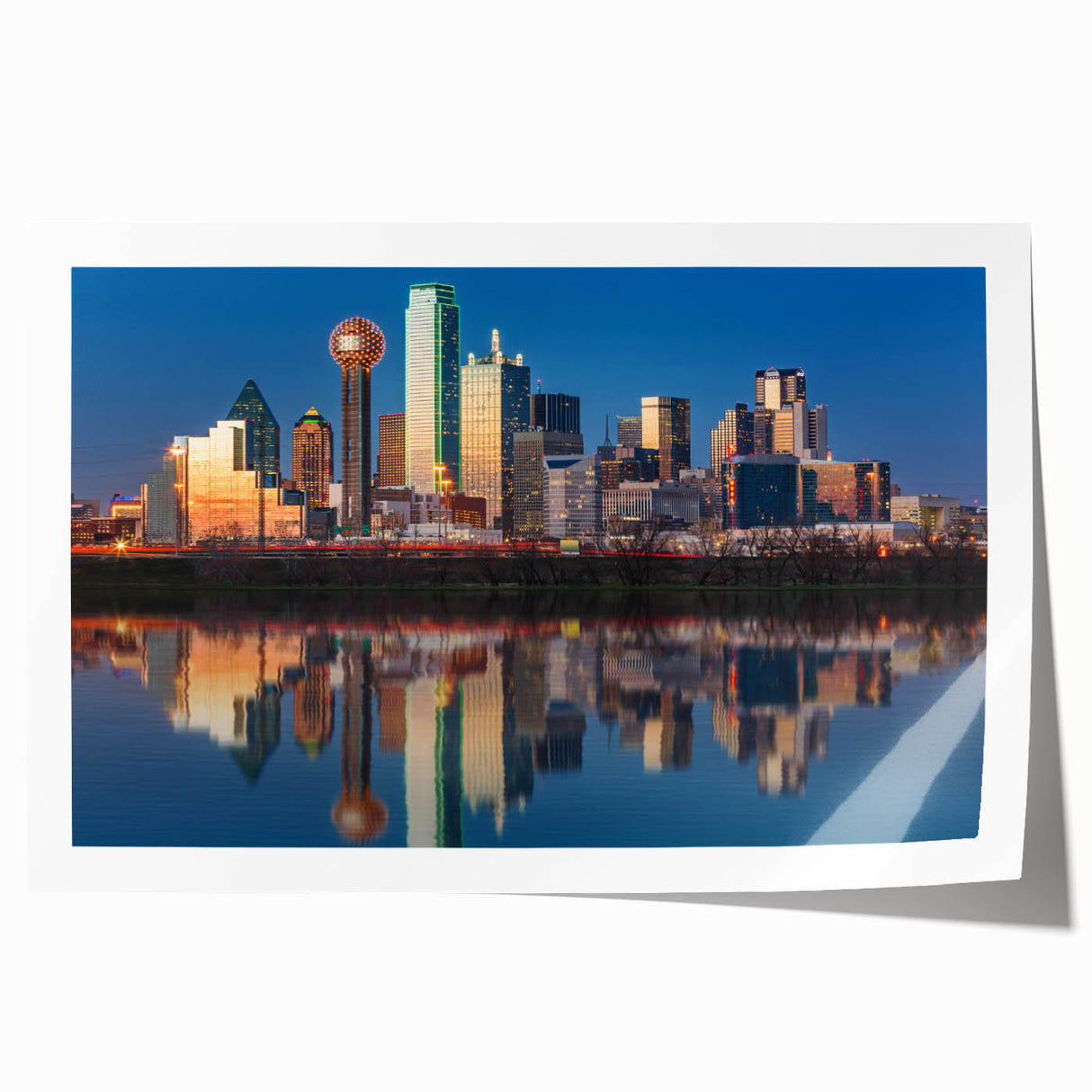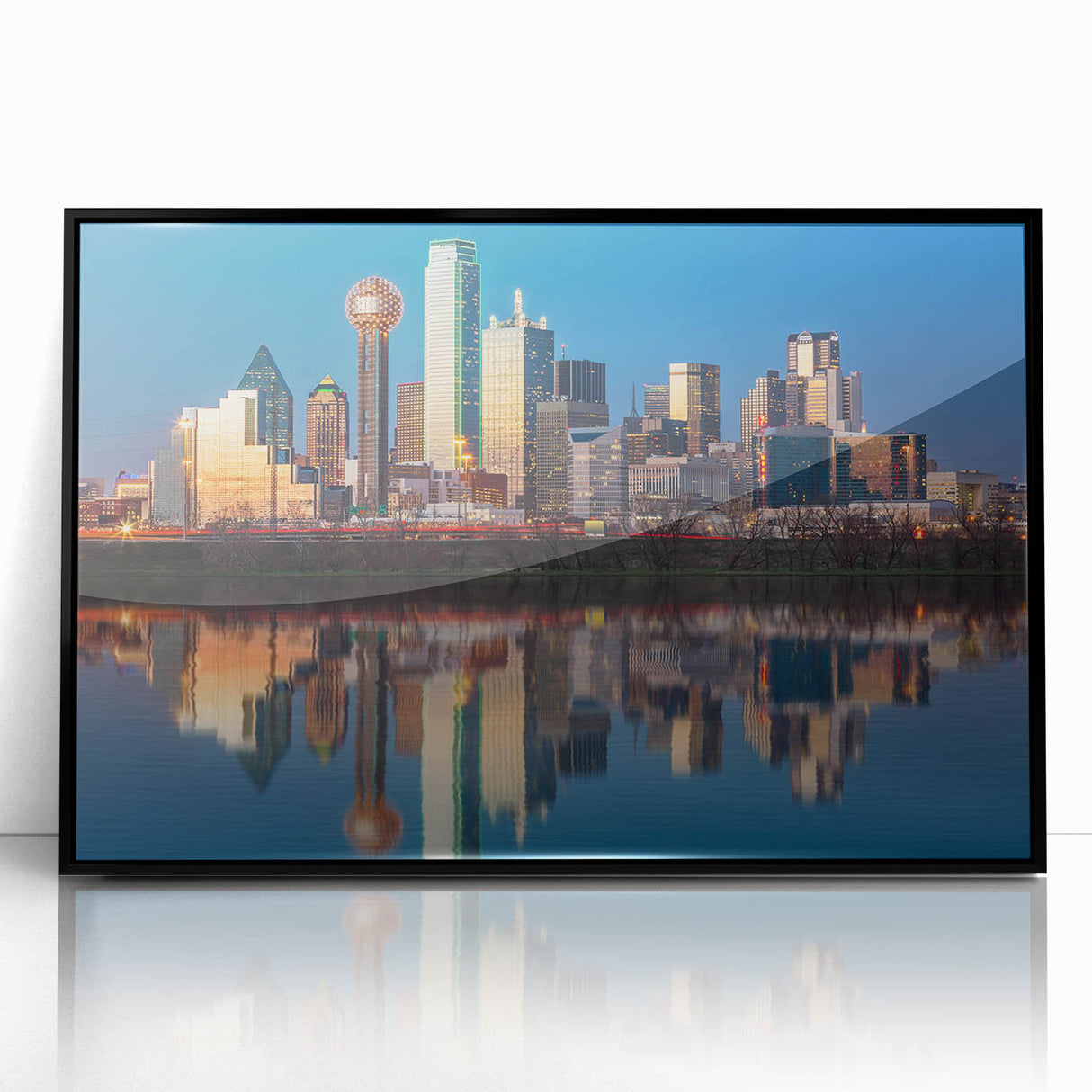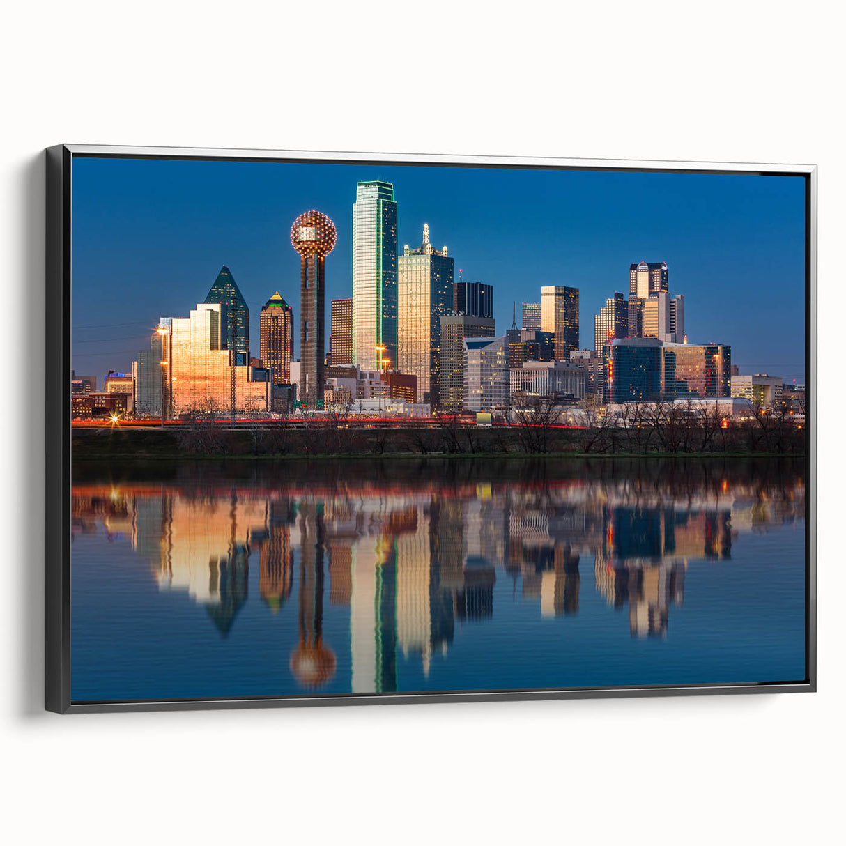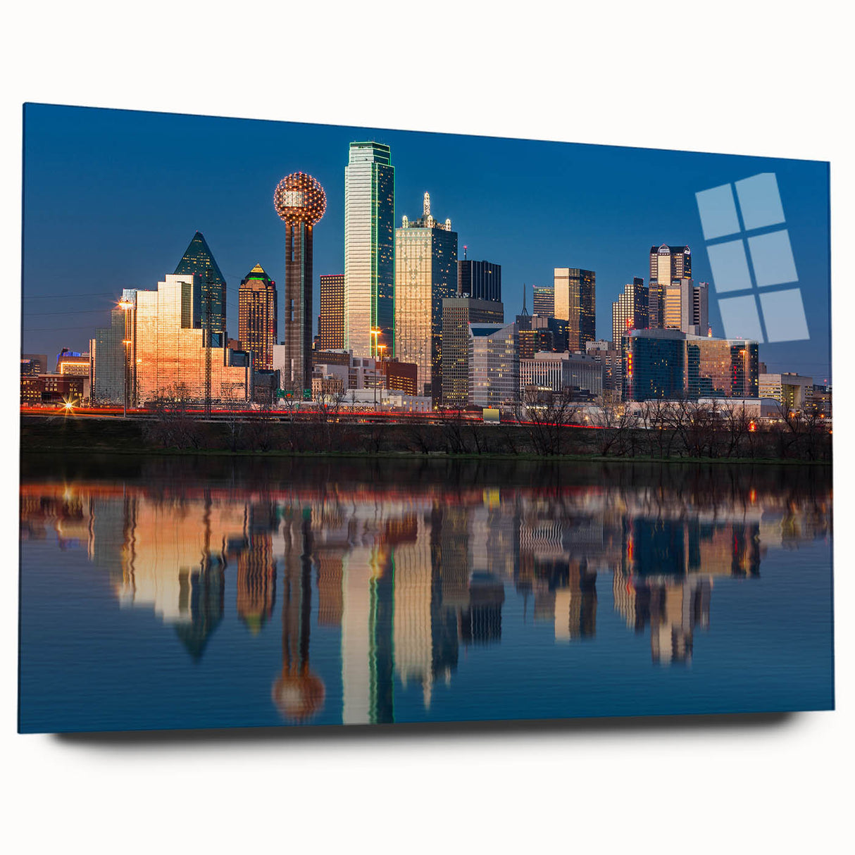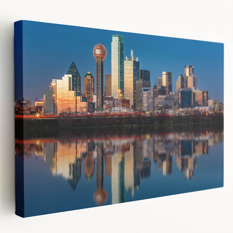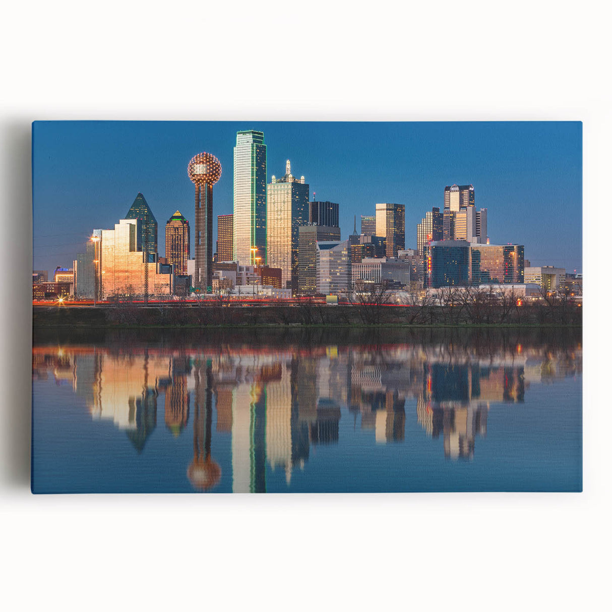 Illuminate your space with the vibrant glow of the Dallas skyline at night, perfectly captured in this stunning wall art piece. The iconic Reunion Tower and the shimmering reflections on the water create a mesmerizing view of the city that comes alive after dark. This Dallas skyline night art is an ideal choice for those looking to add a touch of sophistication to their home or office decor. Available in various formats, including stretched canvas, framed prints, and acrylic glass, this artwork is crafted to suit any style.