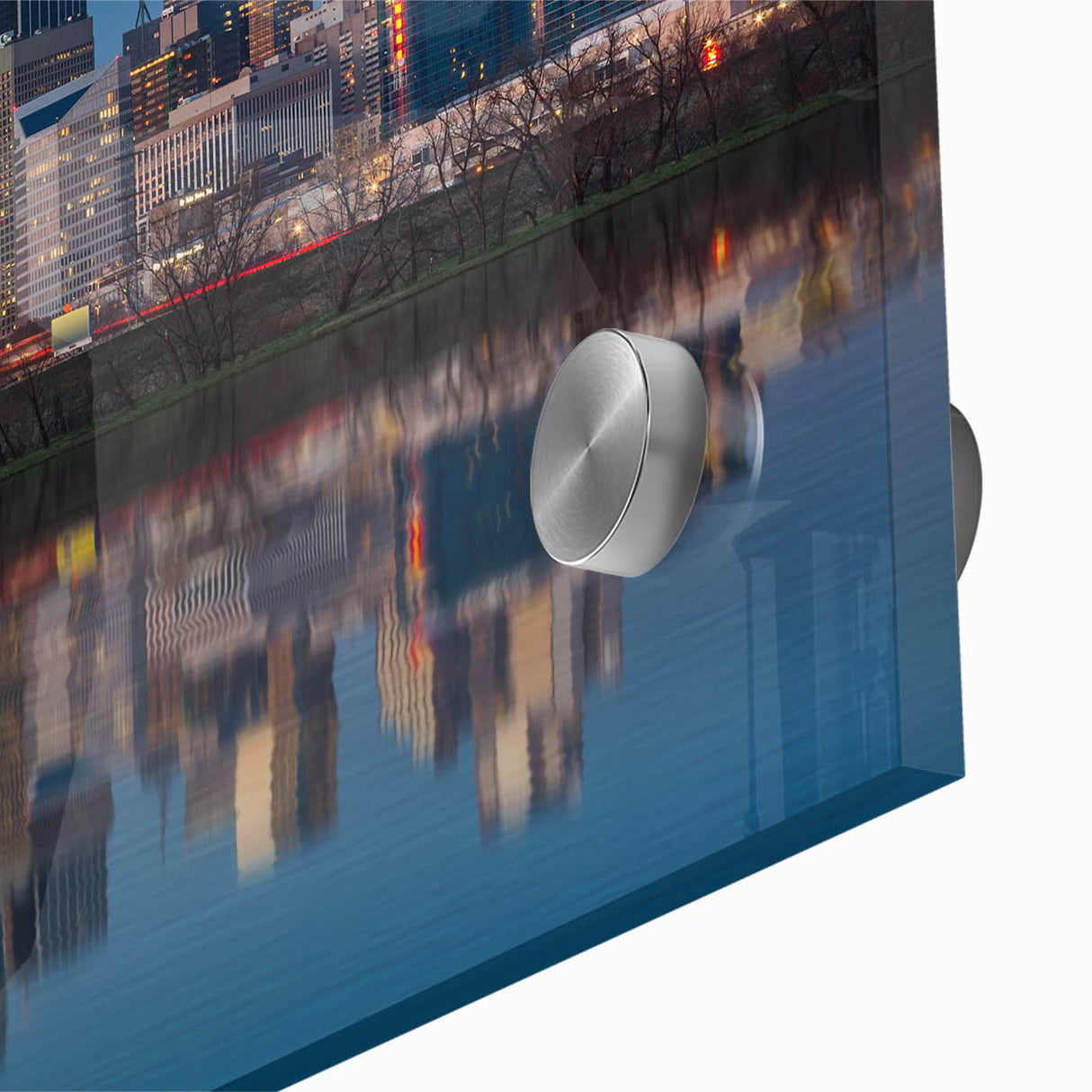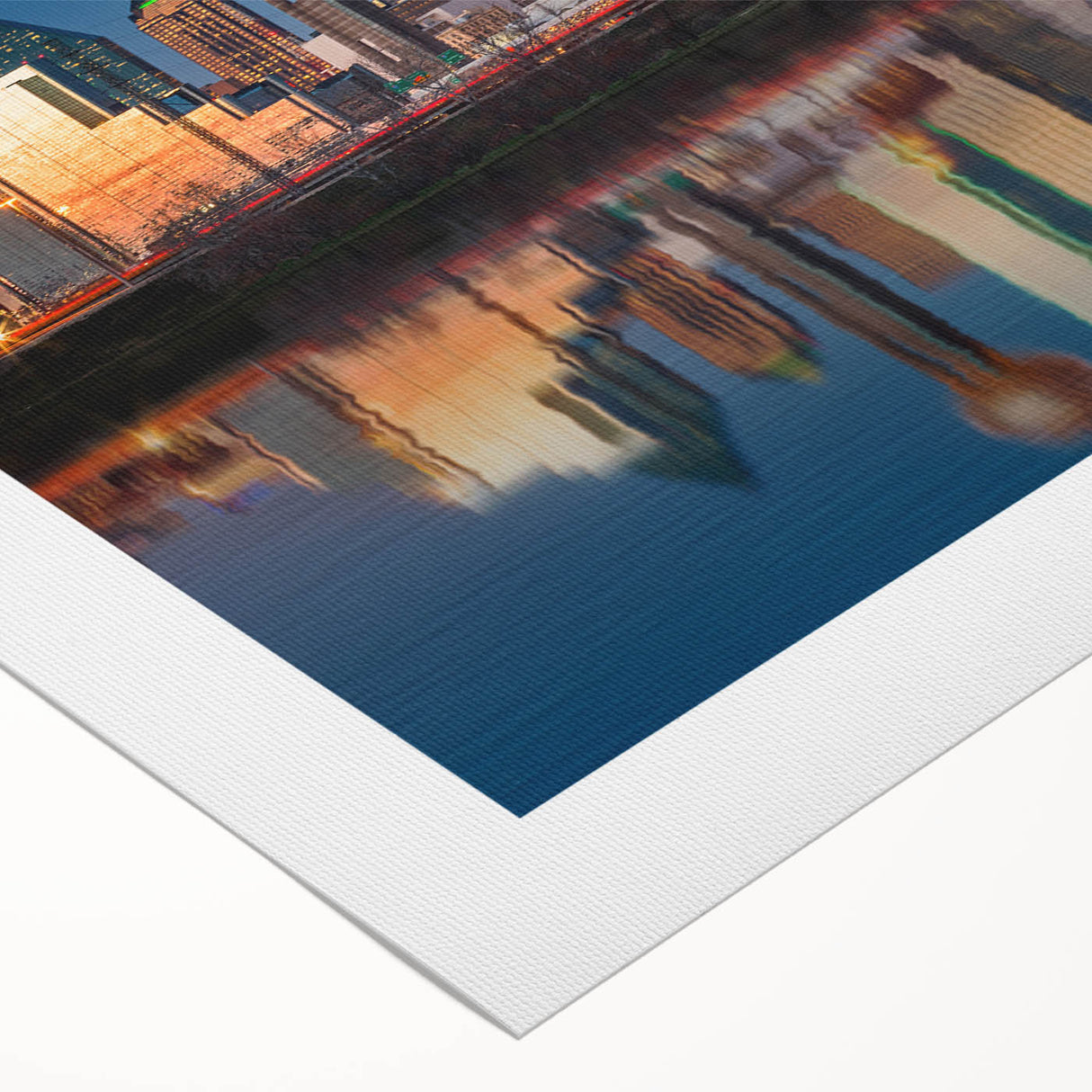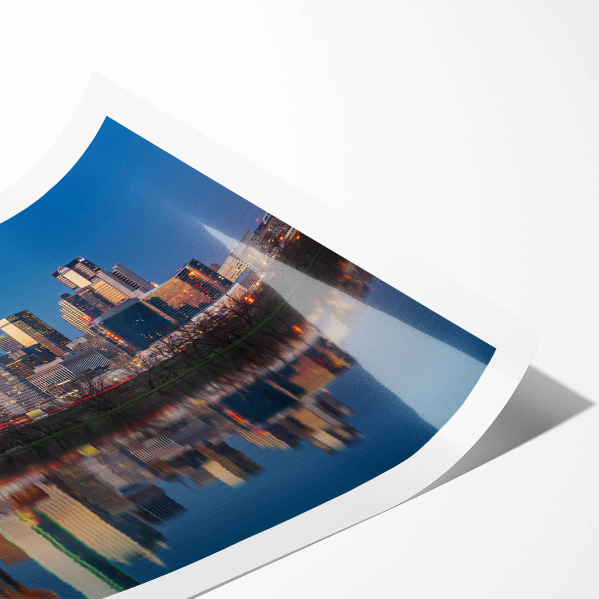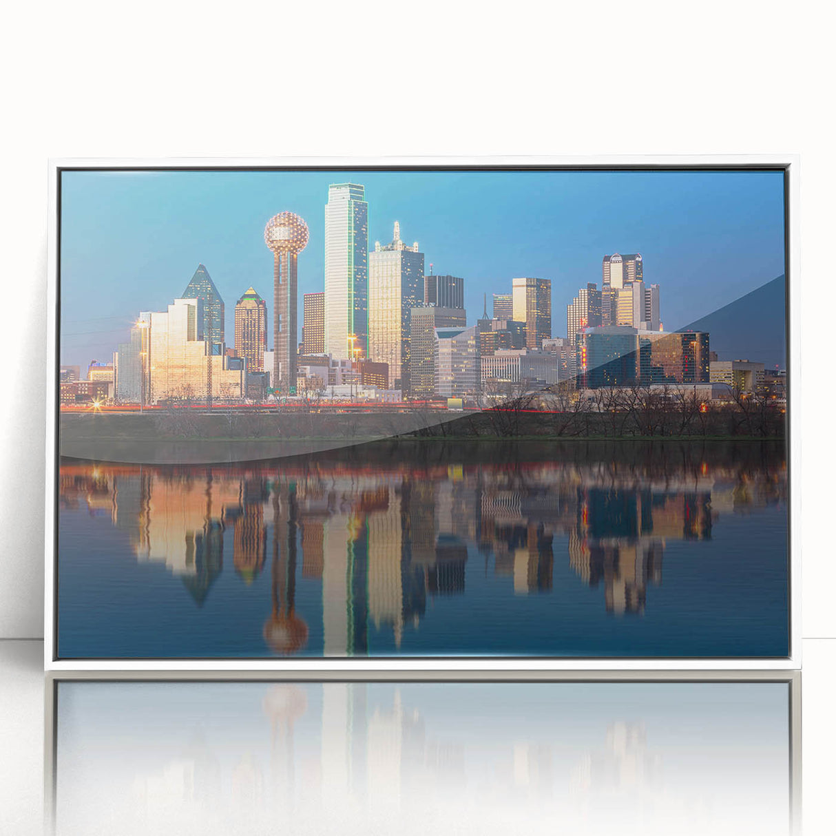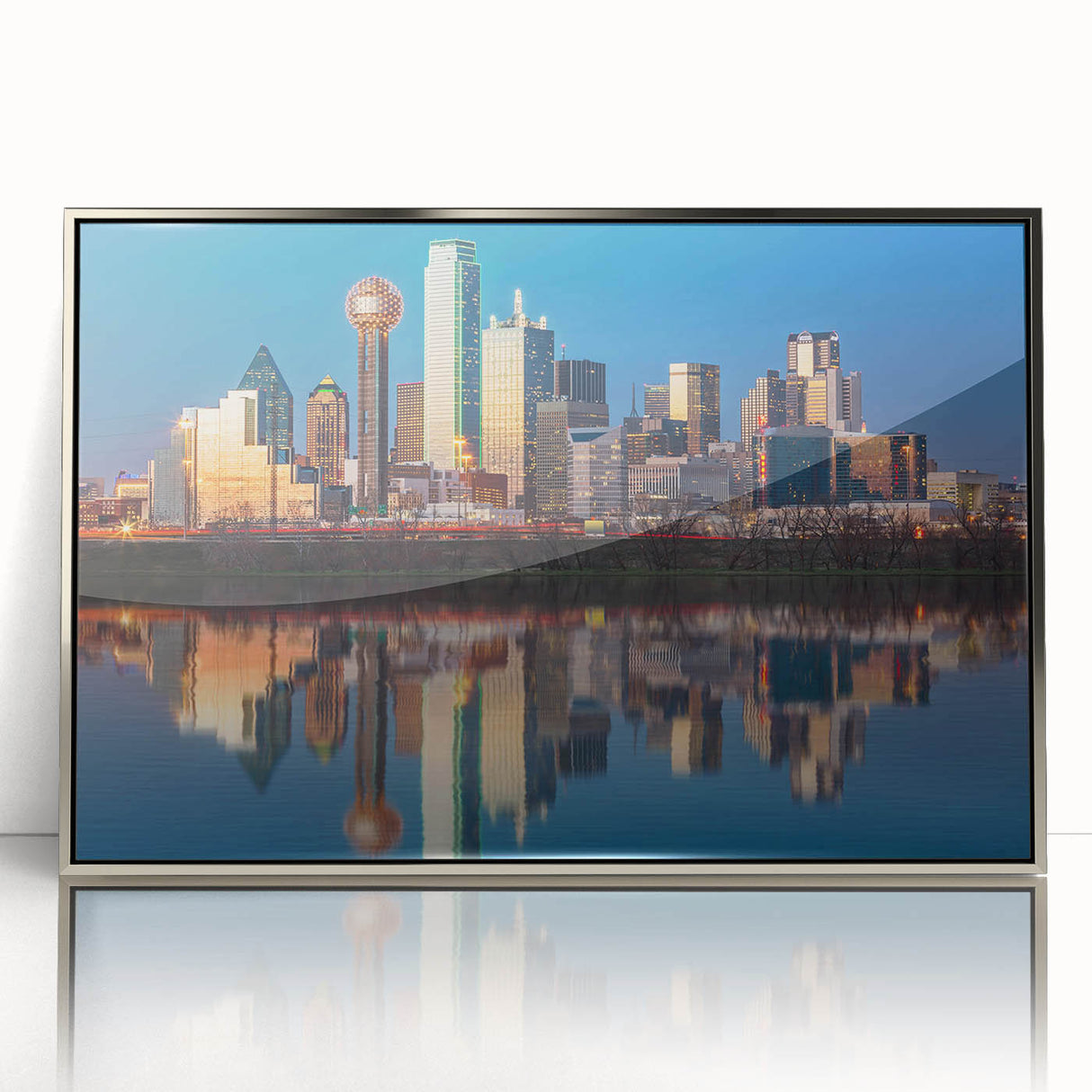 Illuminate your space with the vibrant glow of the Dallas skyline at night, perfectly captured in this stunning wall art piece. The iconic Reunion Tower and the shimmering reflections on the water create a mesmerizing view of the city that comes alive after dark. This Dallas skyline night art is an ideal choice for those looking to add a touch of sophistication to their home or office decor. Available in various formats, including stretched canvas, framed prints, and acrylic glass, this artwork is crafted to suit any style.