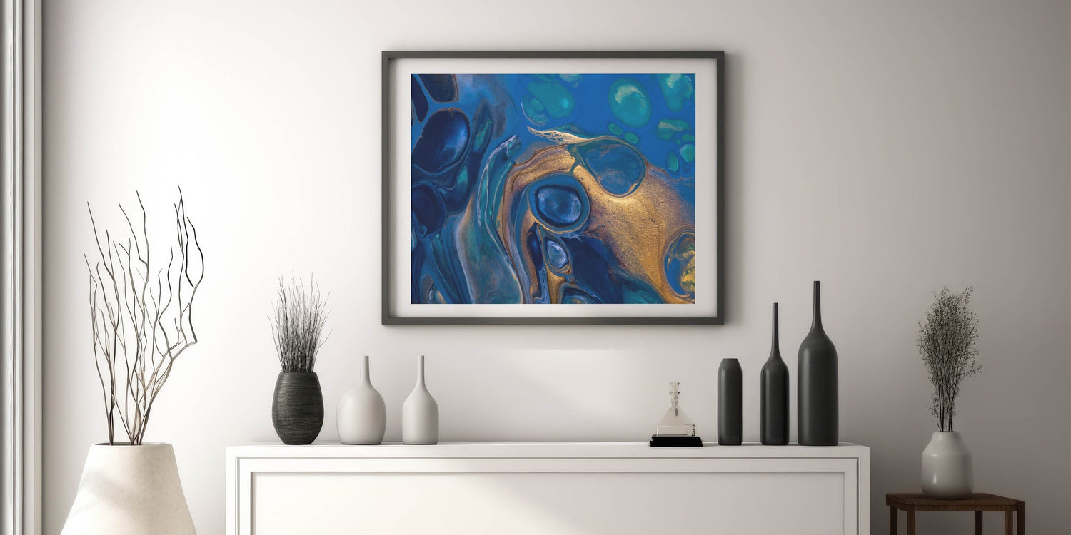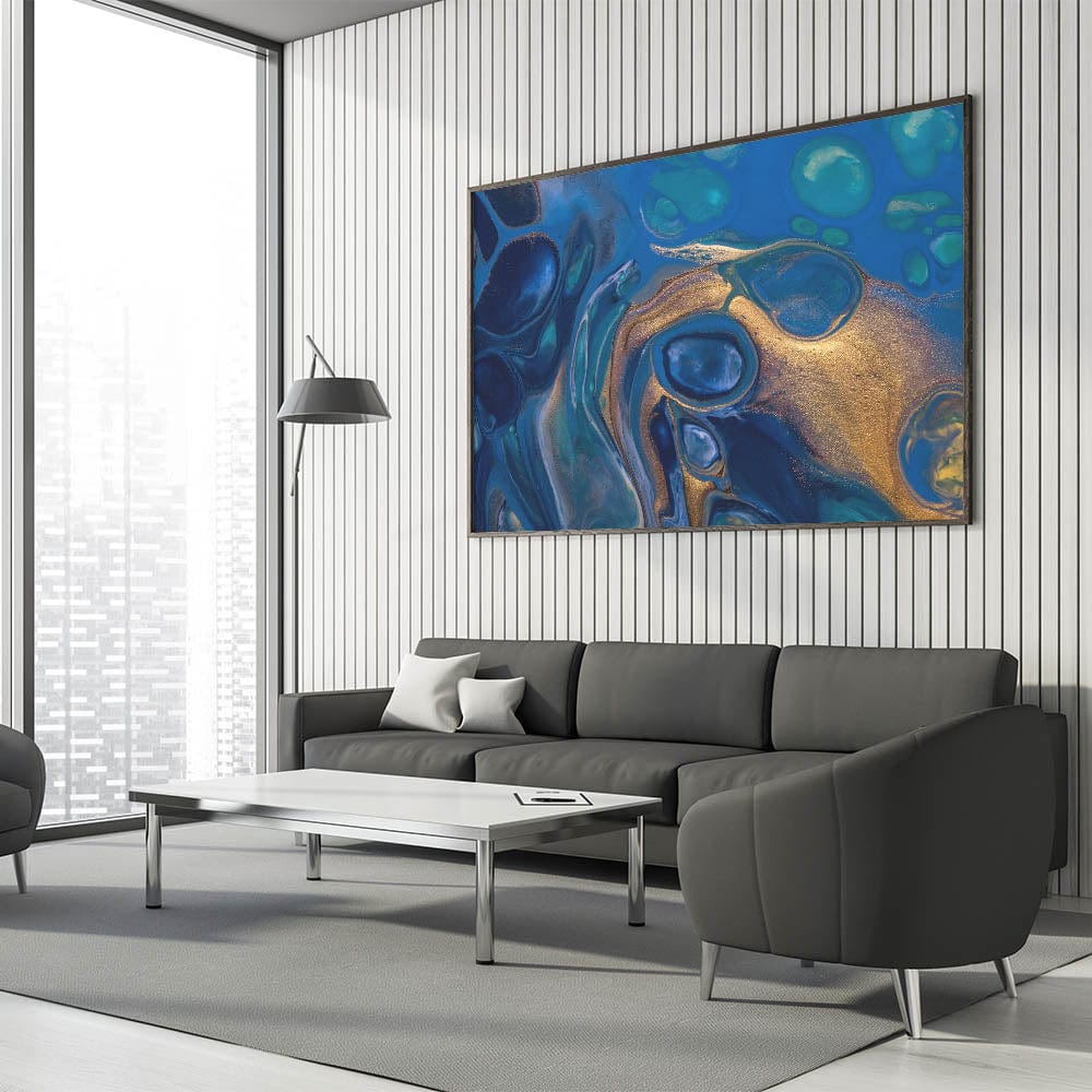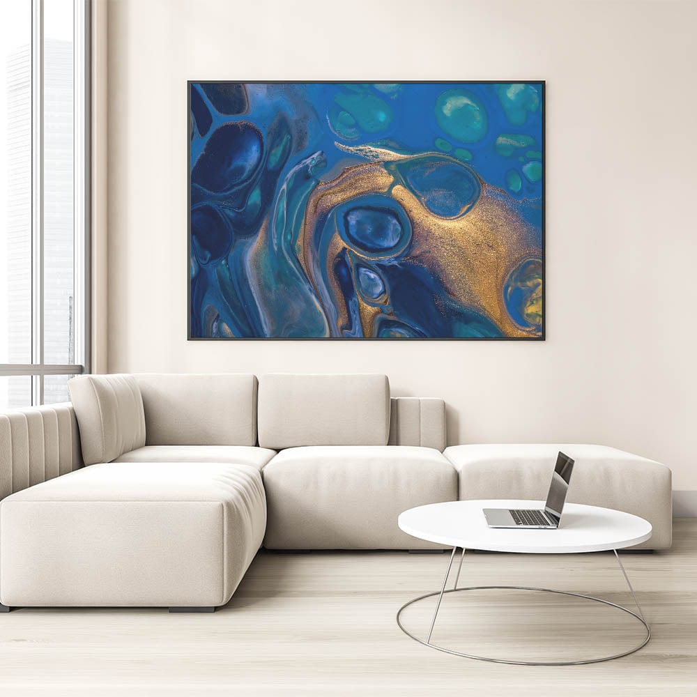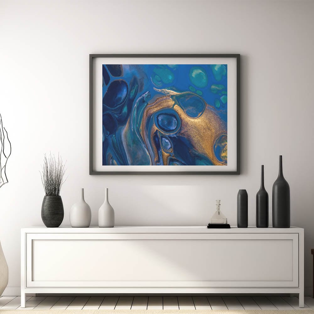 Transform your space with this elegant fluid abstract wall art. Featuring mesmerizing waves of deep navy blue, shimmering gold, and subtle teal, this modern fluid art print is designed to bring depth and sophistication to any interior. The organic flow and radiant metallic accents make it a captivating centerpiece.