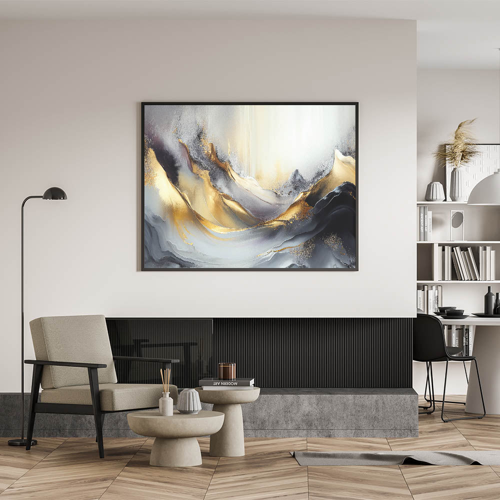 Immerse yourself in the elegance of this luxury abstract wall art collection, featuring a stunning interplay of black, gold, and silver hues. This high-quality abstract canvas print showcases fluid textures and shimmering metallics, making it an exclusive abstract design for modern spaces. The sophisticated color palette brings a refined touch to any contemporary interior, exuding a sense of grandeur and style.