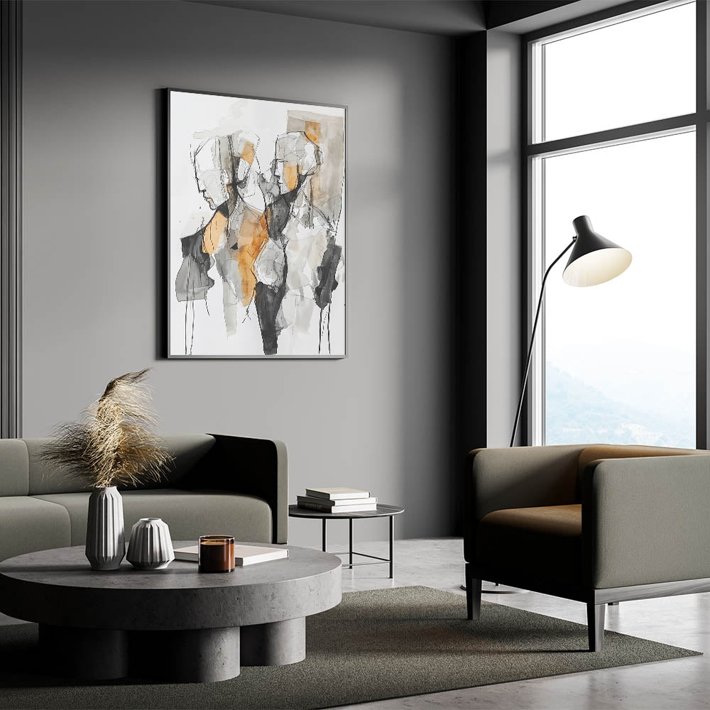 This abstract figurative wall art captures the connection and contrast between two faceless human figures, created through expressive brushstrokes and fluid watercolor textures. The delicate fusion of black, gray, and warm orange tones enhances the emotional depth, making this modern abstract figure painting a mesmerizing focal point in contemporary spaces.