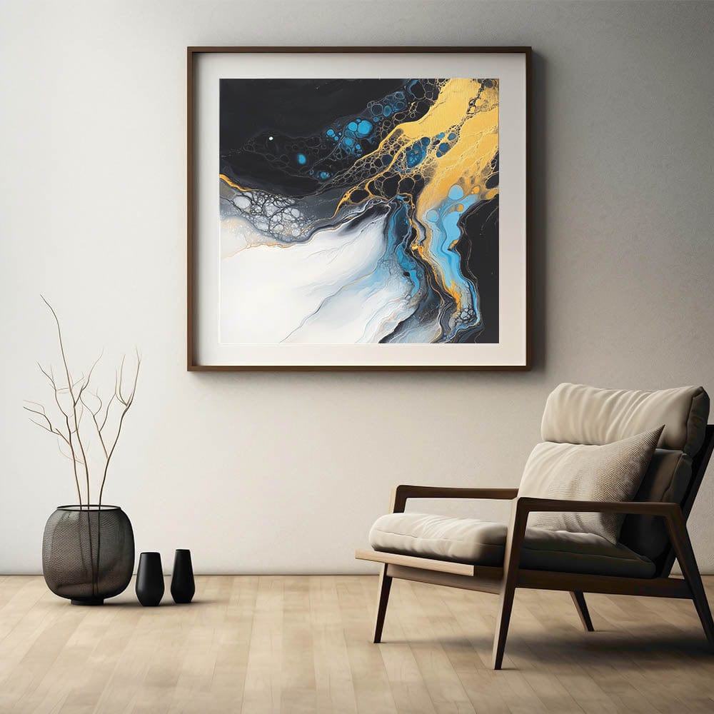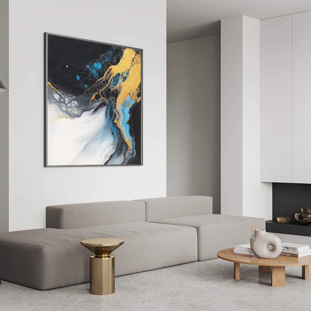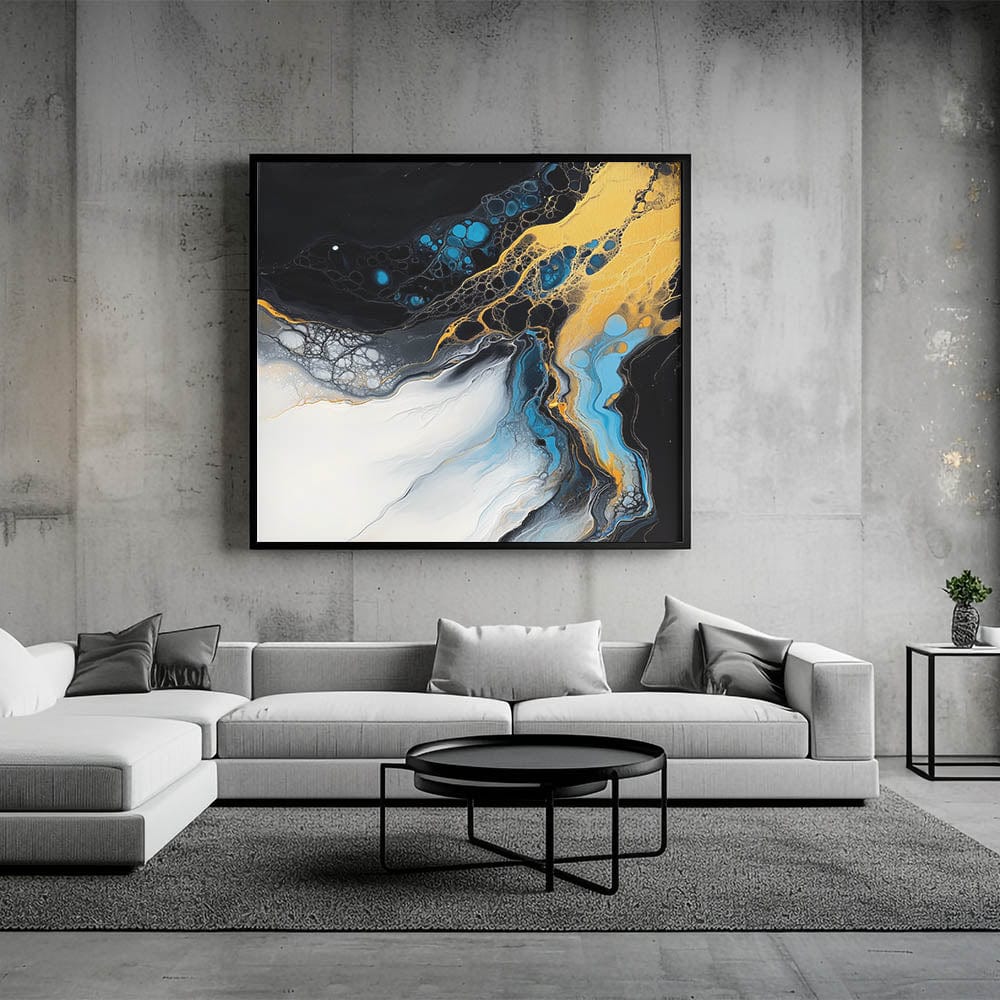 Elevate your interior with this fluid abstract wall art that captures the power of motion through bold color and organic form. Vivid gold streams surge through layers of deep black, turquoise, and soft white, creating a marbled composition that’s both elegant and energetic.