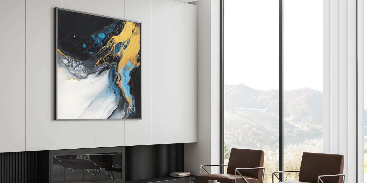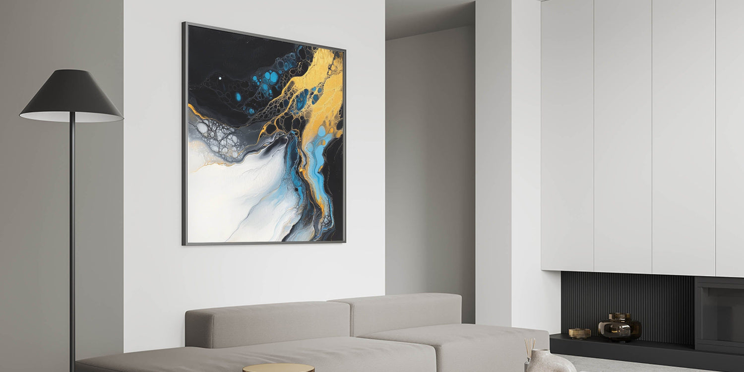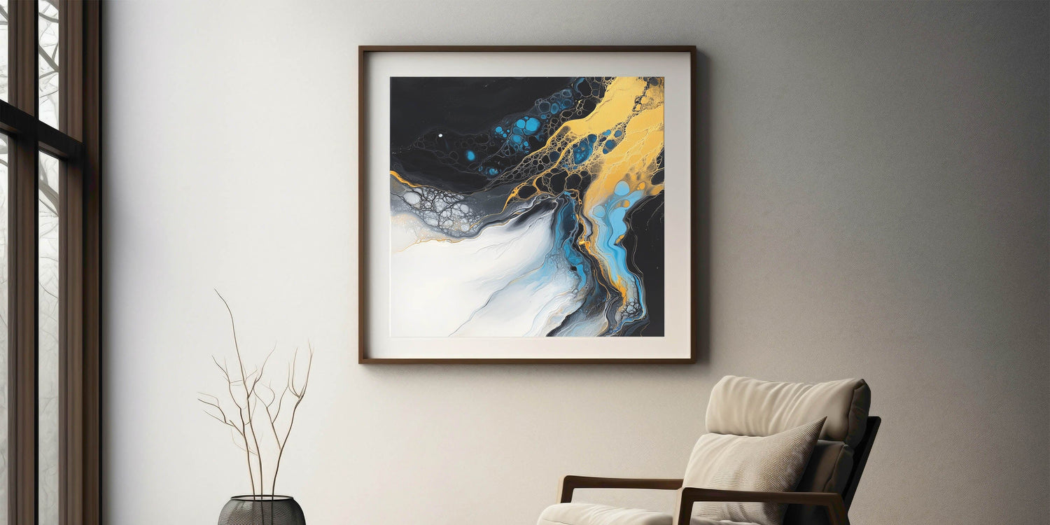Elevate your interior with this fluid abstract wall art that captures the power of motion through bold color and organic form. Vivid gold streams surge through layers of deep black, turquoise, and soft white, creating a marbled composition that’s both elegant and energetic.