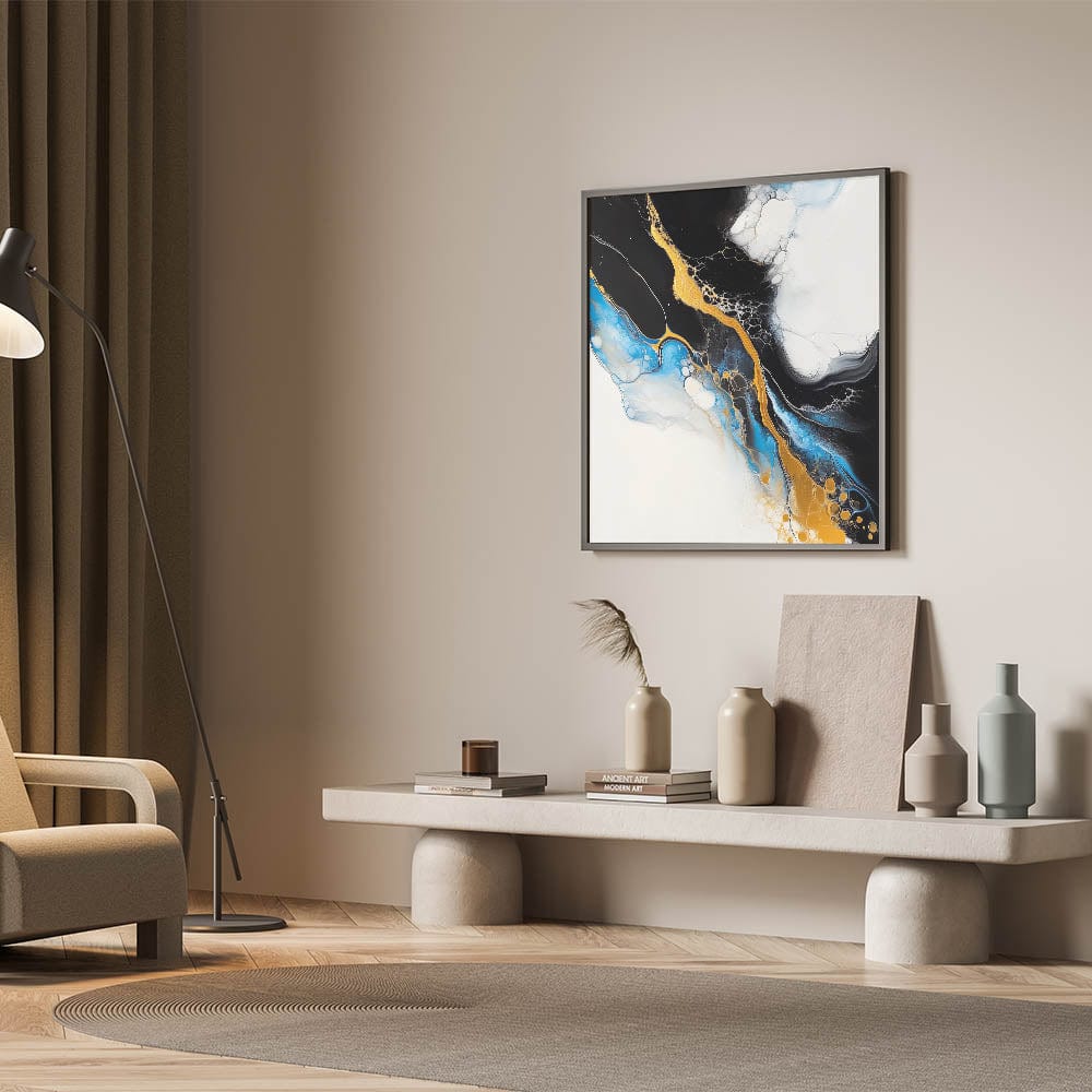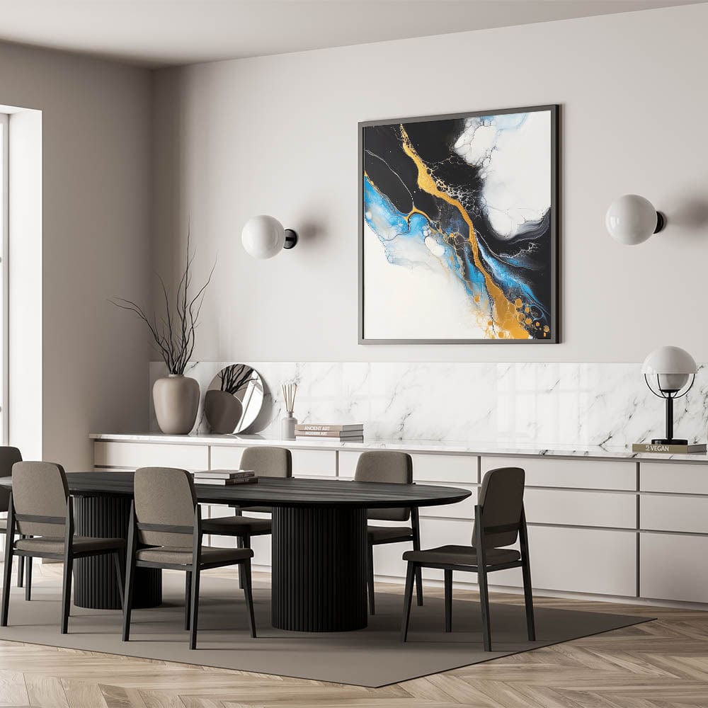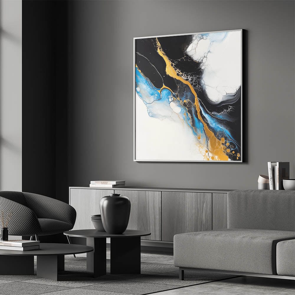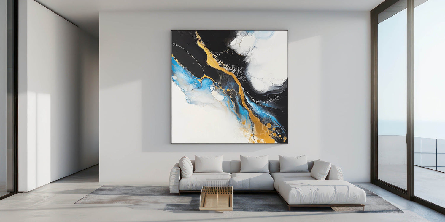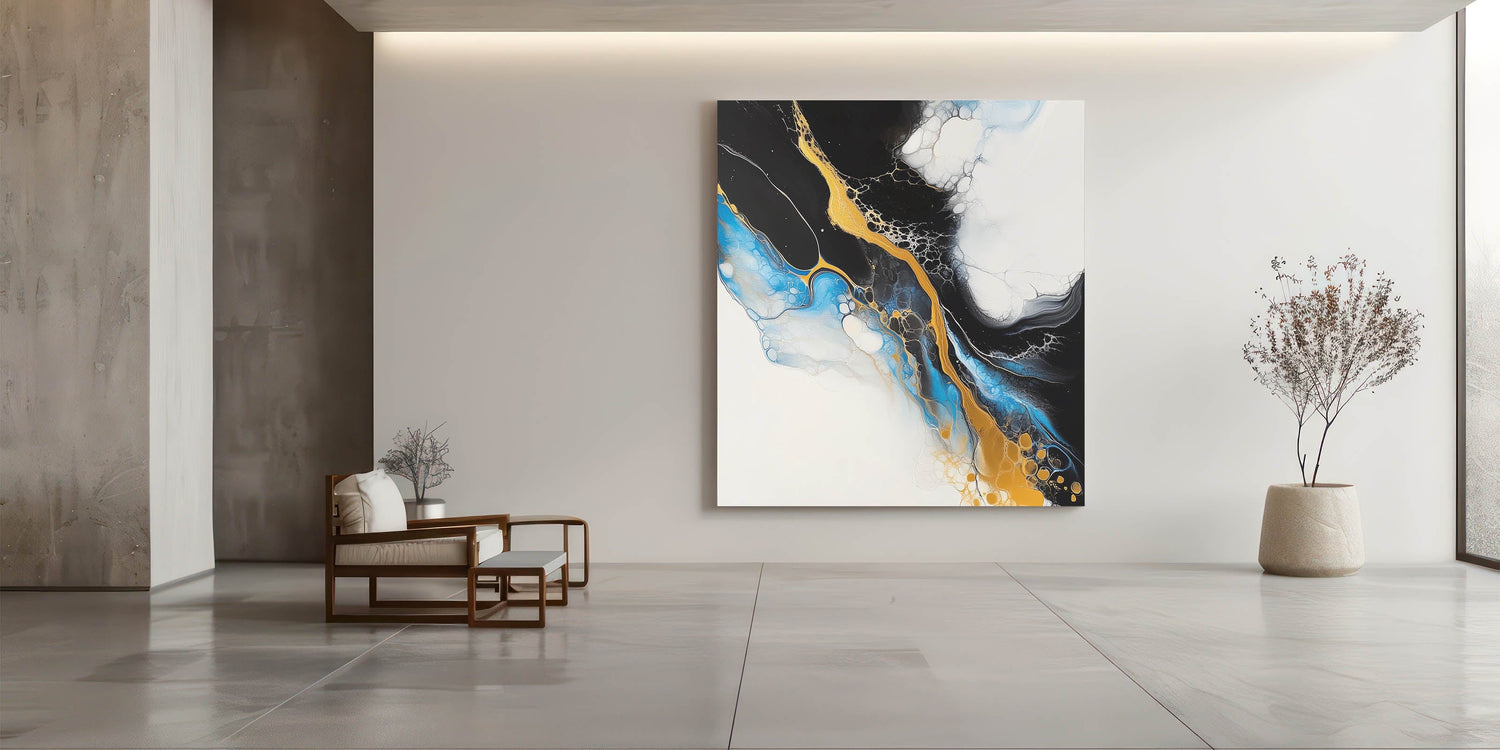 Infuse your space with movement and luxury using this fluid acrylic wall decor. A brilliant golden stream cuts through dramatic blacks, turquoise blues, and creamy whites, creating a high-contrast, cell-textured composition that’s both bold and refined.