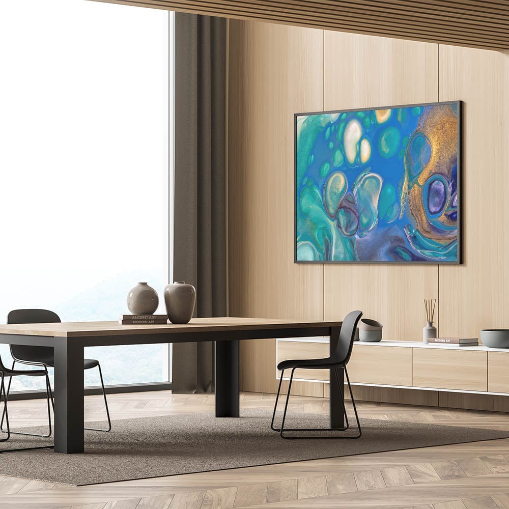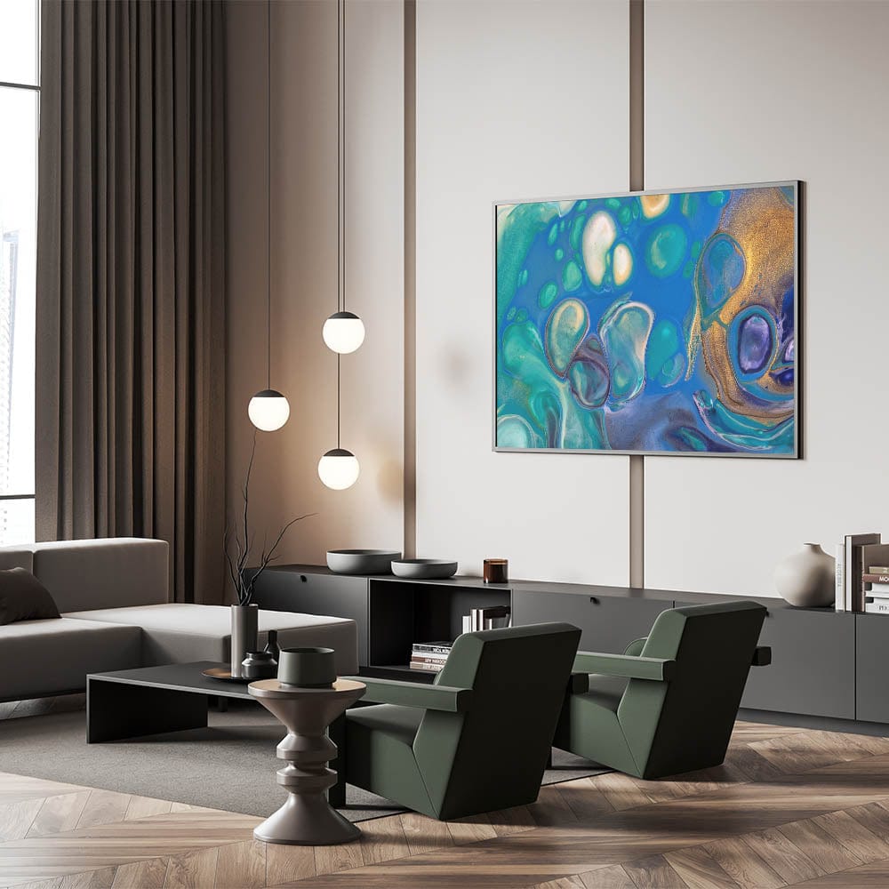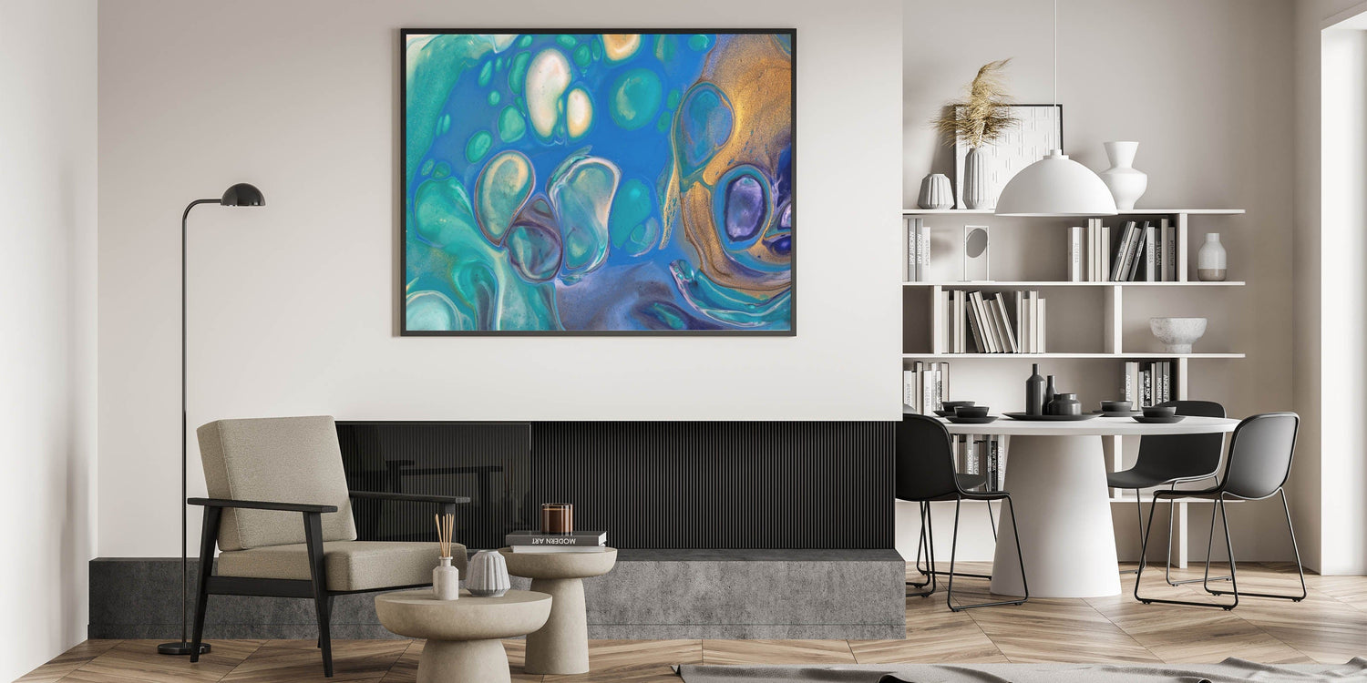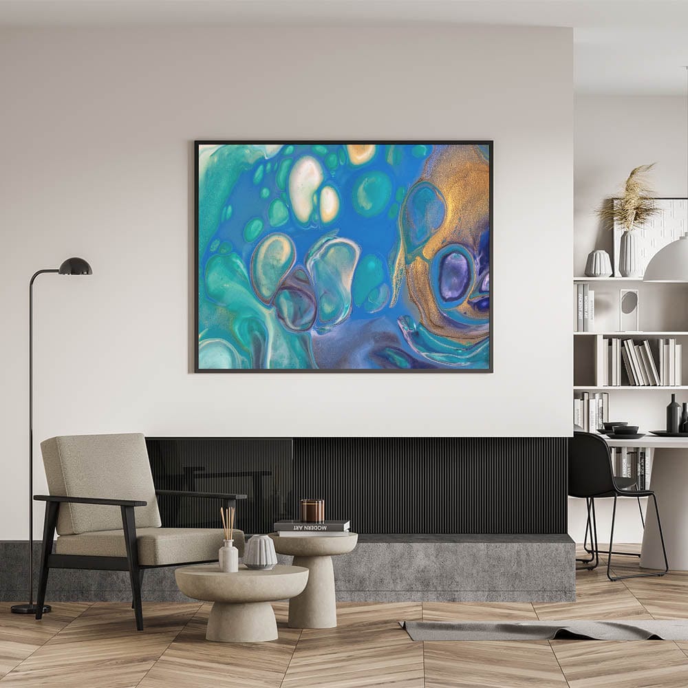 Immerse yourself in the beauty of this fluid art painting for walls, featuring mesmerizing shades of deep blue, turquoise, and shimmering gold. The organic movement of colors creates a dynamic, ocean-inspired aesthetic that enhances modern and contemporary interiors.