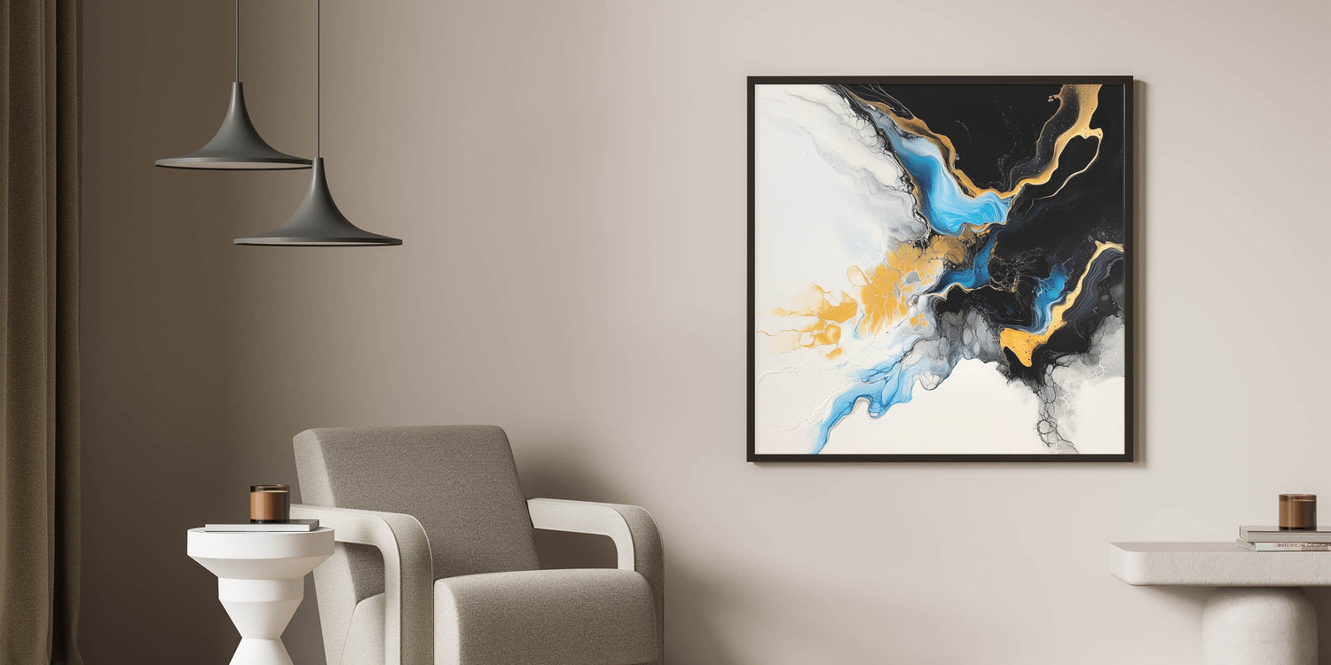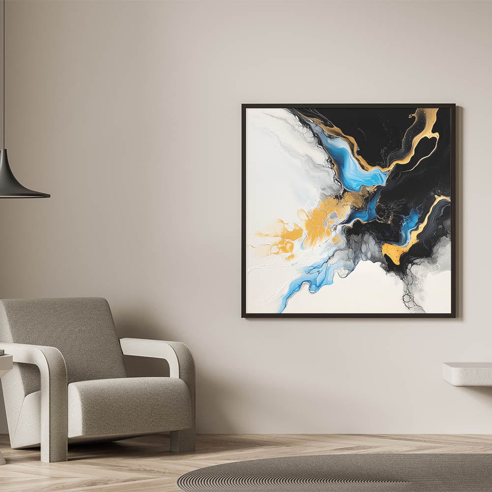 Add a dramatic touch to your space with this piece from our fluid art paintings for walls collection. Vivid gold, turquoise blue, black, and white collide and swirl in a captivating marbled flow, creating a sense of movement, light, and bold elegance.