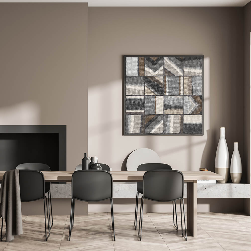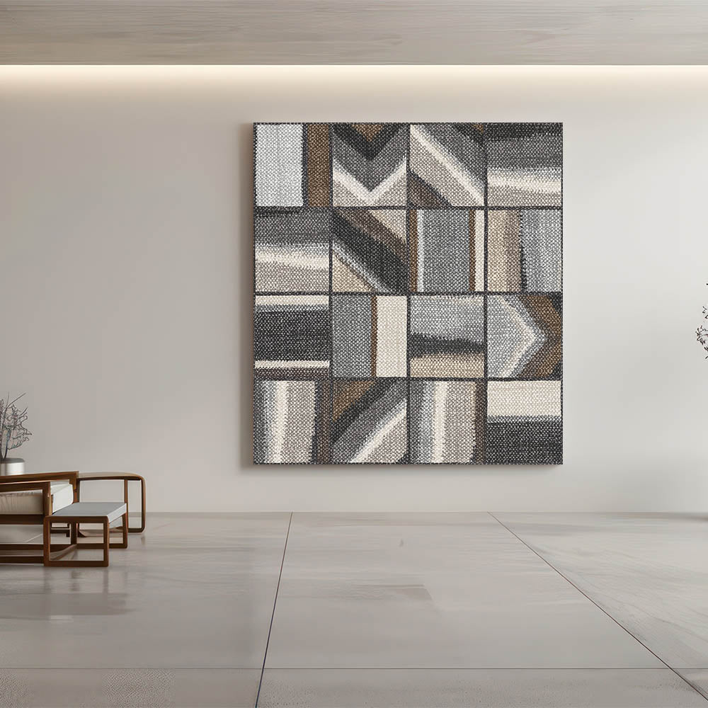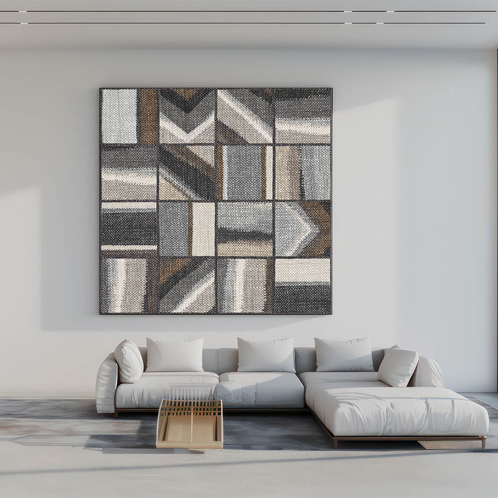 Discover balance and bold form with this Geometric Abstract Canvas Art. Featuring an intricate grid of layered shapes and directional patterns in black, gray, beige, and brown tones, it creates movement through symmetry. Ideal for structured, modern interiors, this artwork delivers depth and grounded energy. A statement in subtle tones.