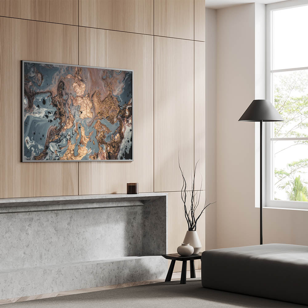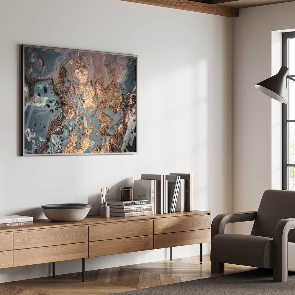 This exclusive abstract design for modern spaces blends deep, moody hues with golden highlights, adding a sophisticated abstract art touch to your decor. Whether displayed as a framed print, acrylic glass, or luxury canvas, this upscale abstract piece is the perfect statement for an elegant space.