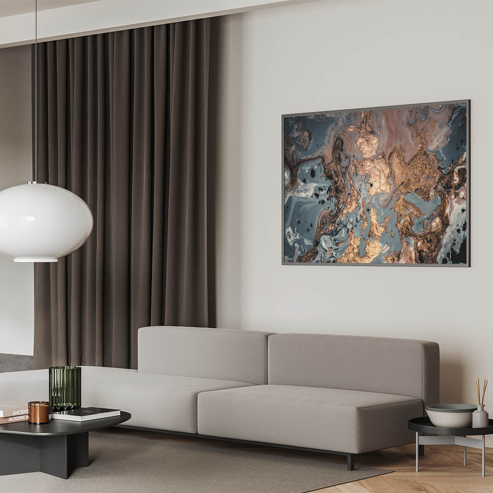 Transform your space with high-end abstract canvas prints, featuring an elegant fusion of blue-gray, black, and gold. This premium abstract art piece showcases fluid, marbled textures and shimmering metallic tones, making it a perfect choice for modern, upscale interiors. Whether placed in a living room, office, or bedroom, this artwork enhances any setting with sophistication.