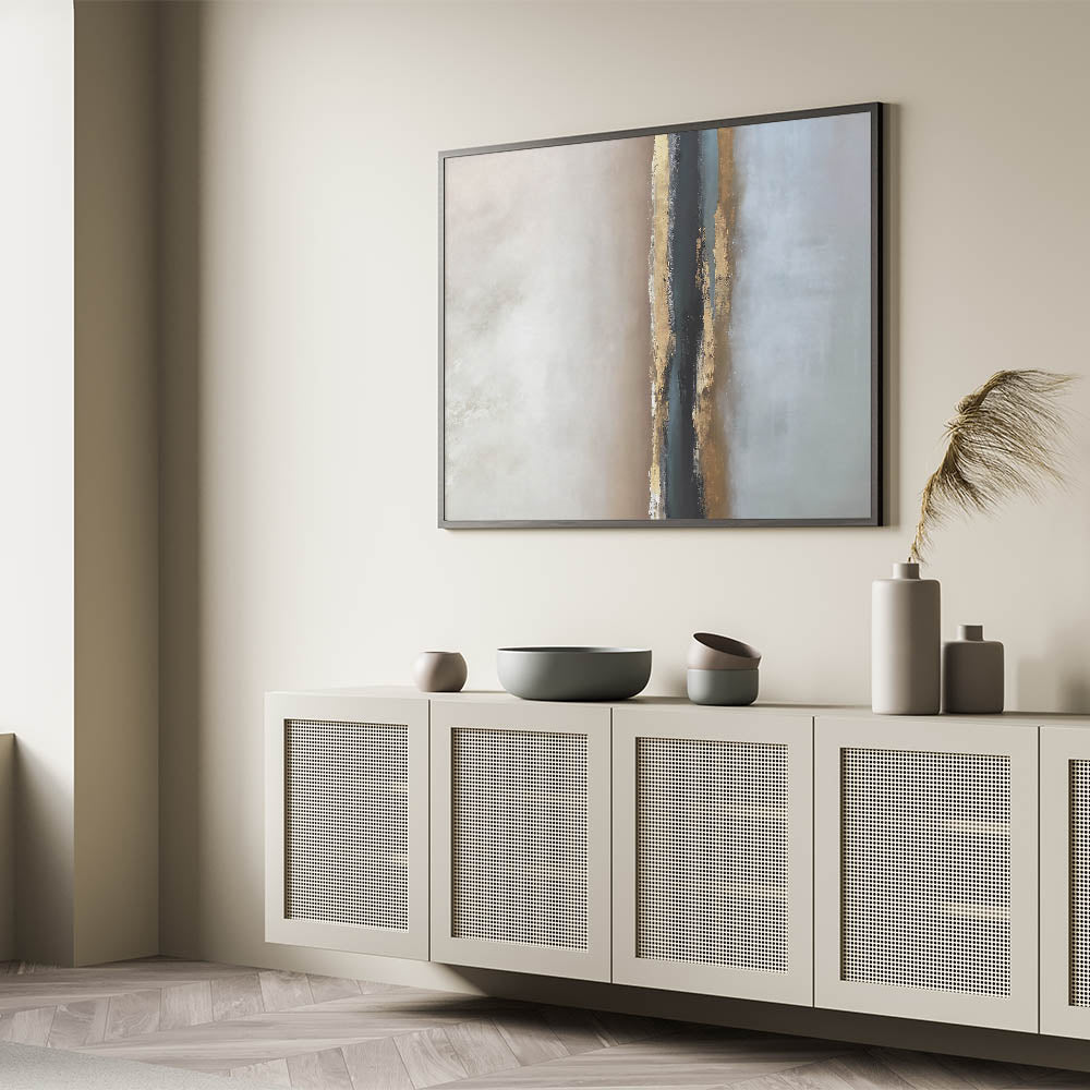 Bring depth and contrast into your interior with this Large Abstract Wall Decor from the Timeless Textures collection. Featuring a bold vertical crack in tones of black, teal, and gold, it blends raw elegance with contemporary design. The soft beige backdrop and metallic accents offer richness while keeping the composition minimal.