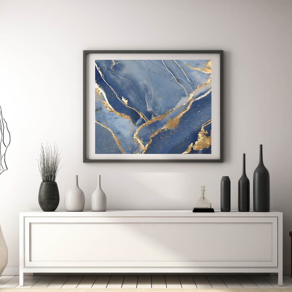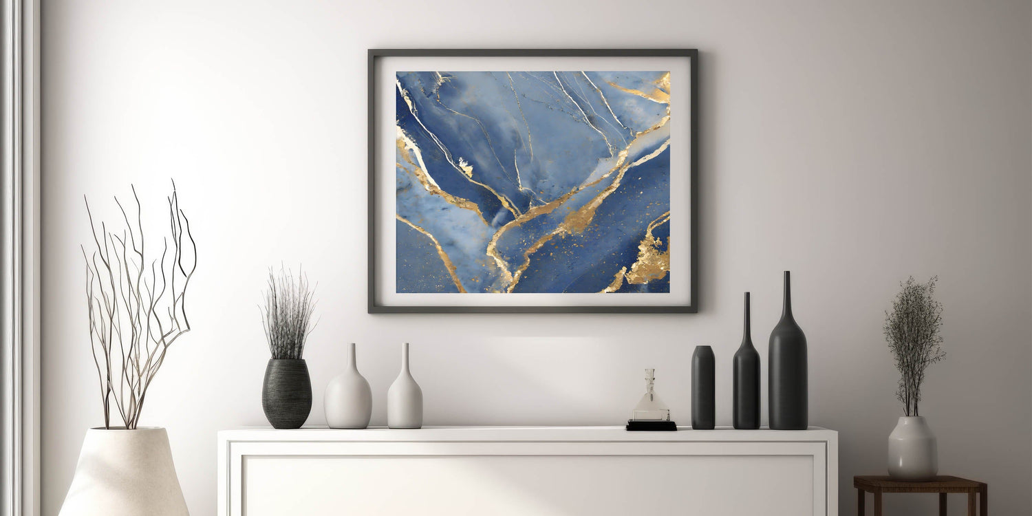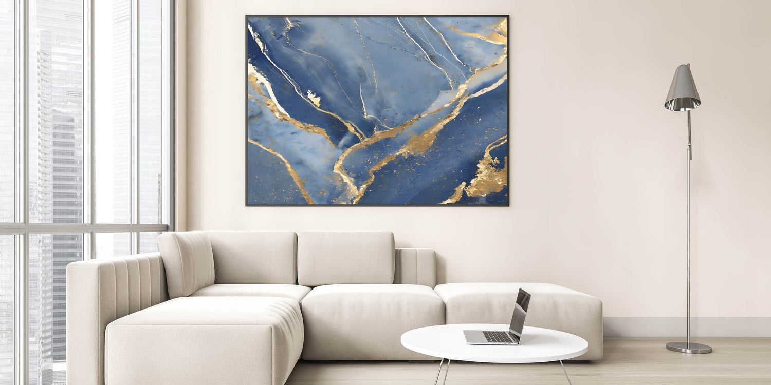 Bring a touch of luxury to your space with this stunning fluid art print. Featuring deep navy blue, shimmering gold, and soft white, this artwork captures the elegance of marble with flowing gold veining. The contrast between rich blue tones and metallic highlights creates a sophisticated and regal aesthetic, making it a perfect addition to high-end interiors.