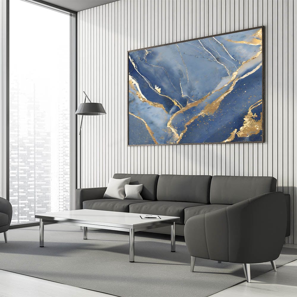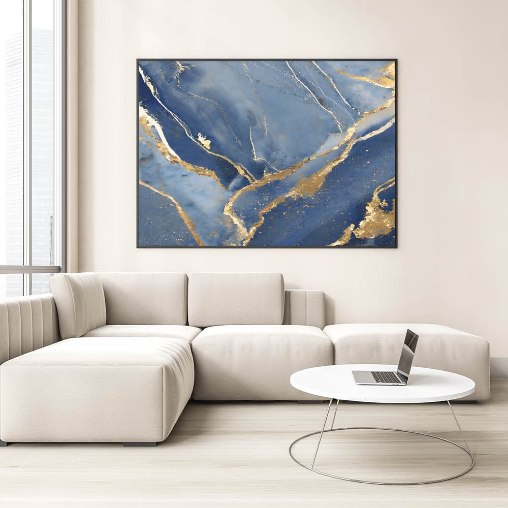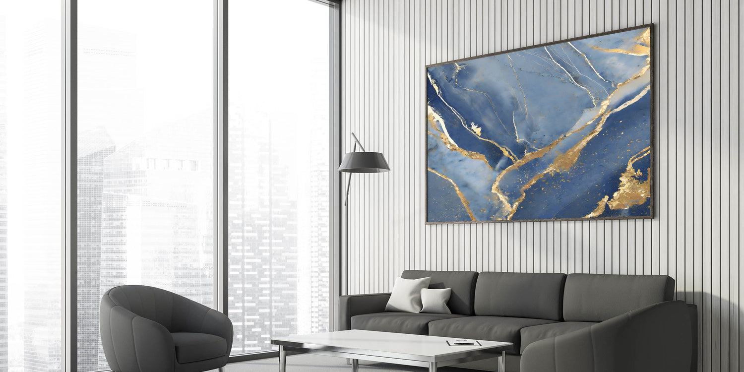 Bring a touch of luxury to your space with this stunning fluid art print. Featuring deep navy blue, shimmering gold, and soft white, this artwork captures the elegance of marble with flowing gold veining. The contrast between rich blue tones and metallic highlights creates a sophisticated and regal aesthetic, making it a perfect addition to high-end interiors.