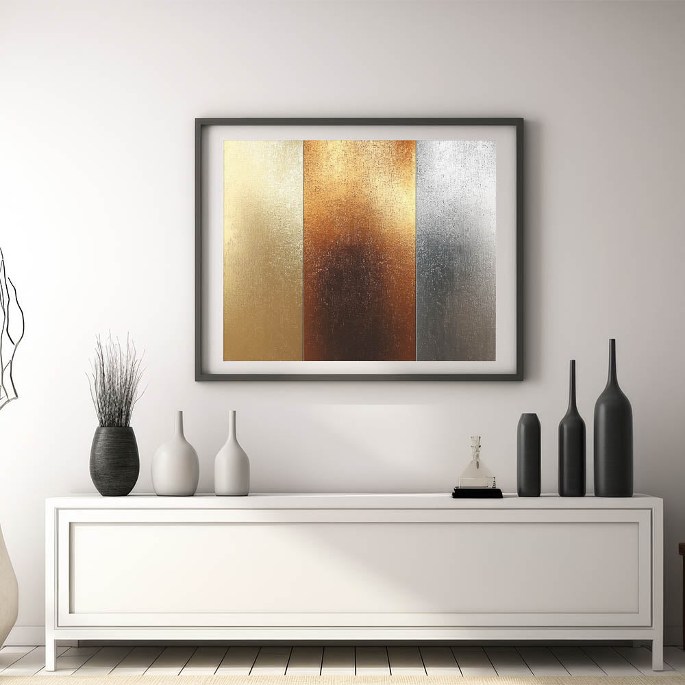 Add a touch of luxury and sophistication to your space with this contemporary black and white abstract art piece, infused with rich metallic tones of gold, bronze, and silver. The subtle texture and reflective quality of the design create a timeless and elegant aesthetic, making it an ideal statement piece for modern, glam, and high-end interiors. The interplay of metallic shades adds depth and warmth, perfect for creating an upscale ambiance in homes, offices, and luxury spaces.