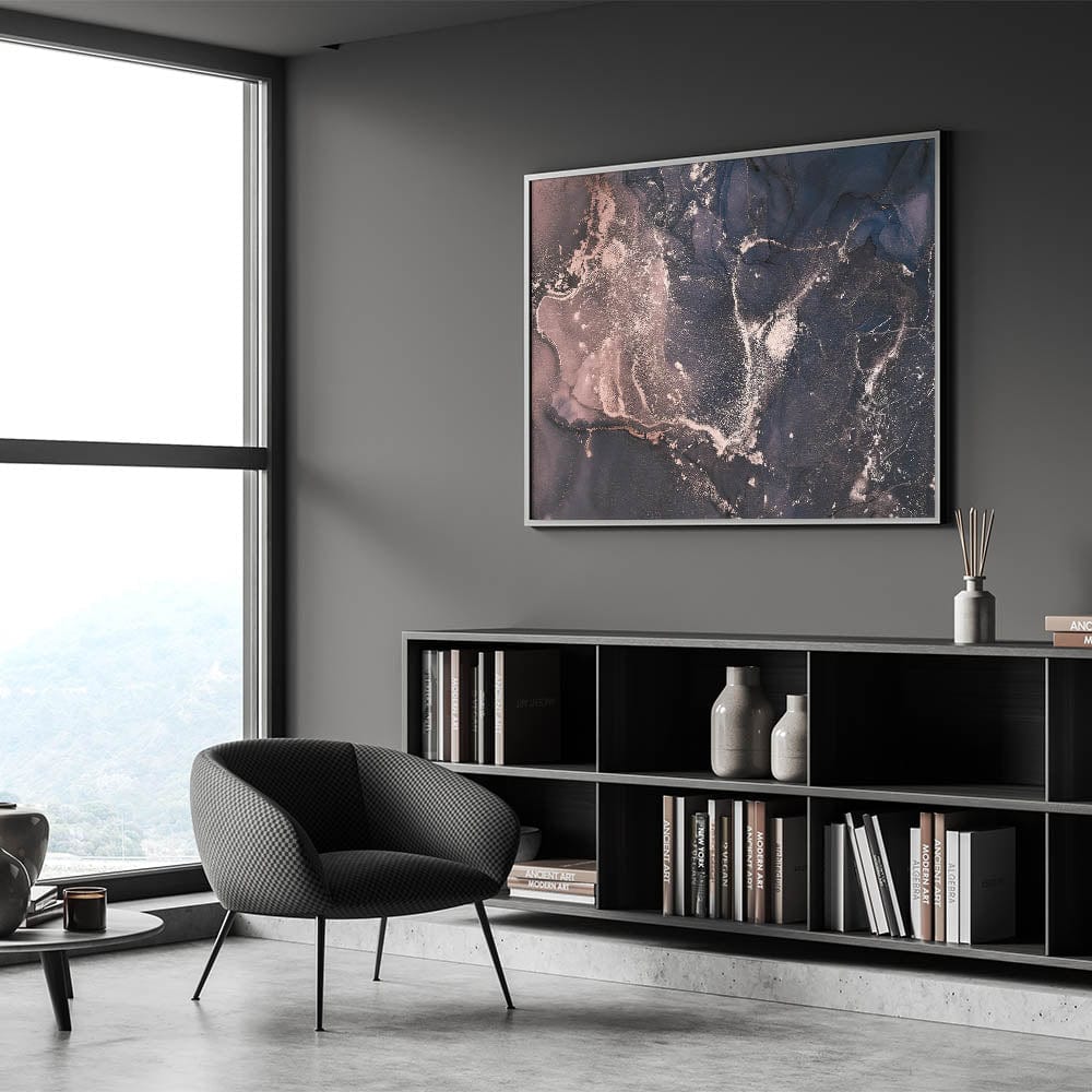 Elevate your space with the shimmering elegance of “Metallic Midnight Flow,” a captivating piece from our fluid abstract art collection. This design blends deep navy tones with soft champagne metallics, evoking a sense of movement, mystery, and modern refinement.