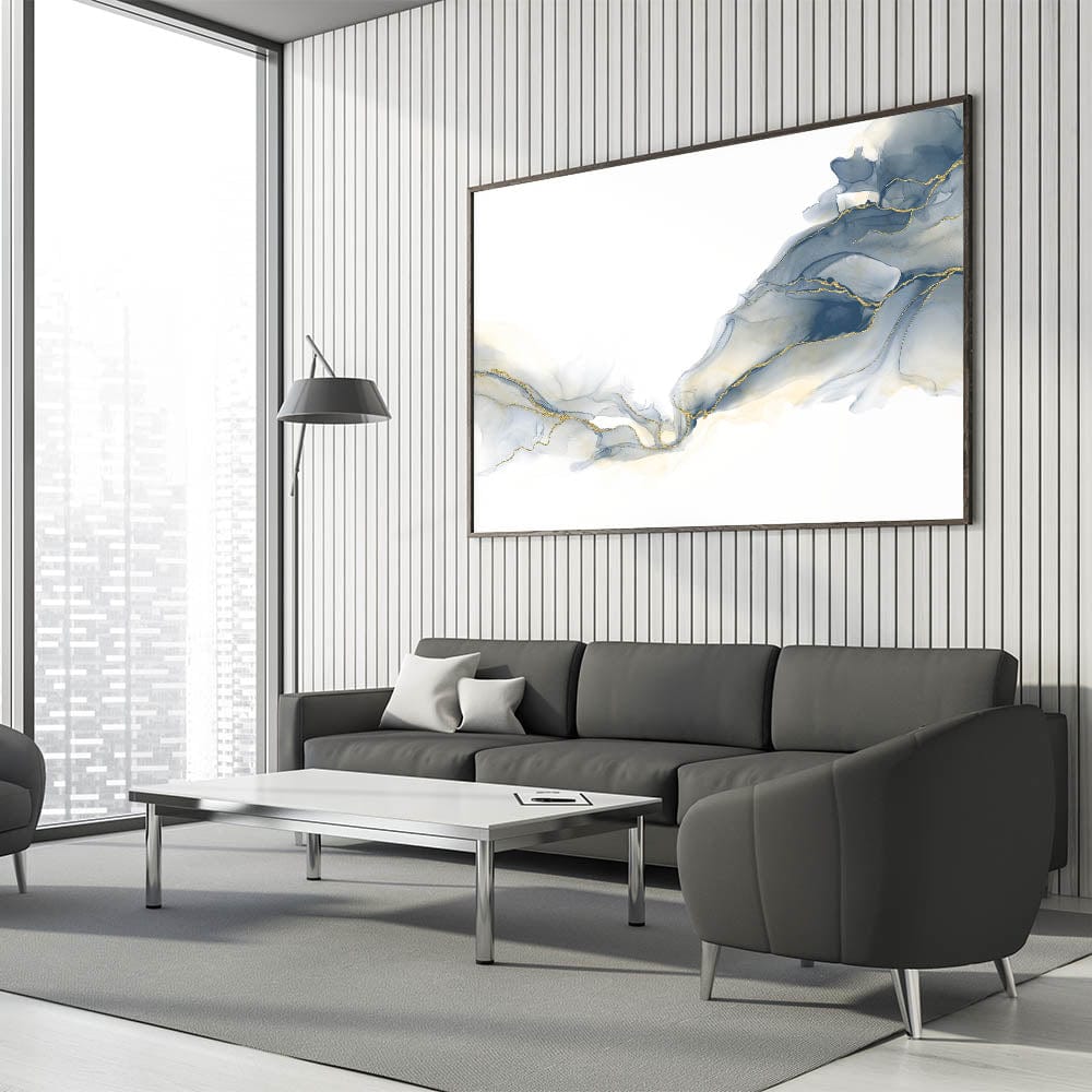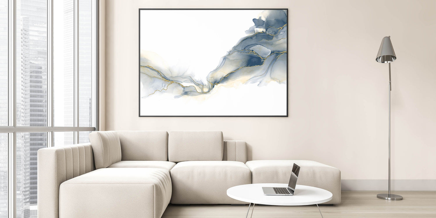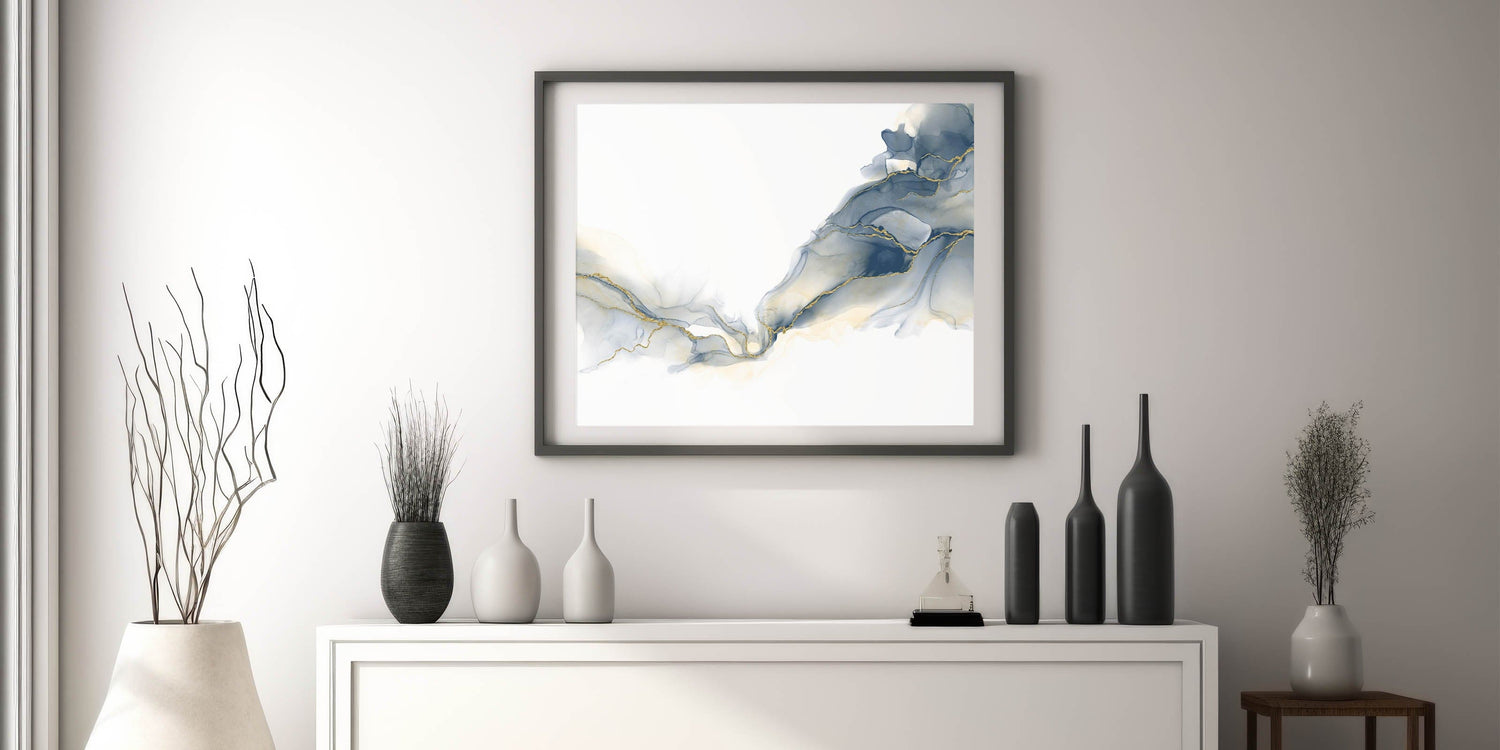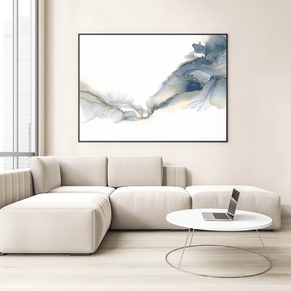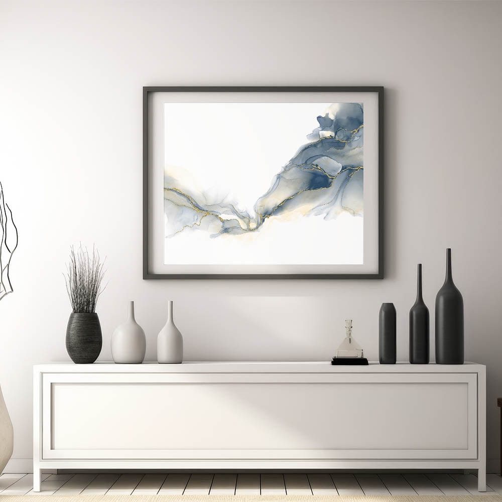 Enhance your space with this elegant fluid abstract wall art, featuring a delicate blend of deep navy, soft beige, and shimmering gold. The smooth ink-like flow and gold accents create a sophisticated, minimalist aesthetic that complements modern and contemporary interiors.