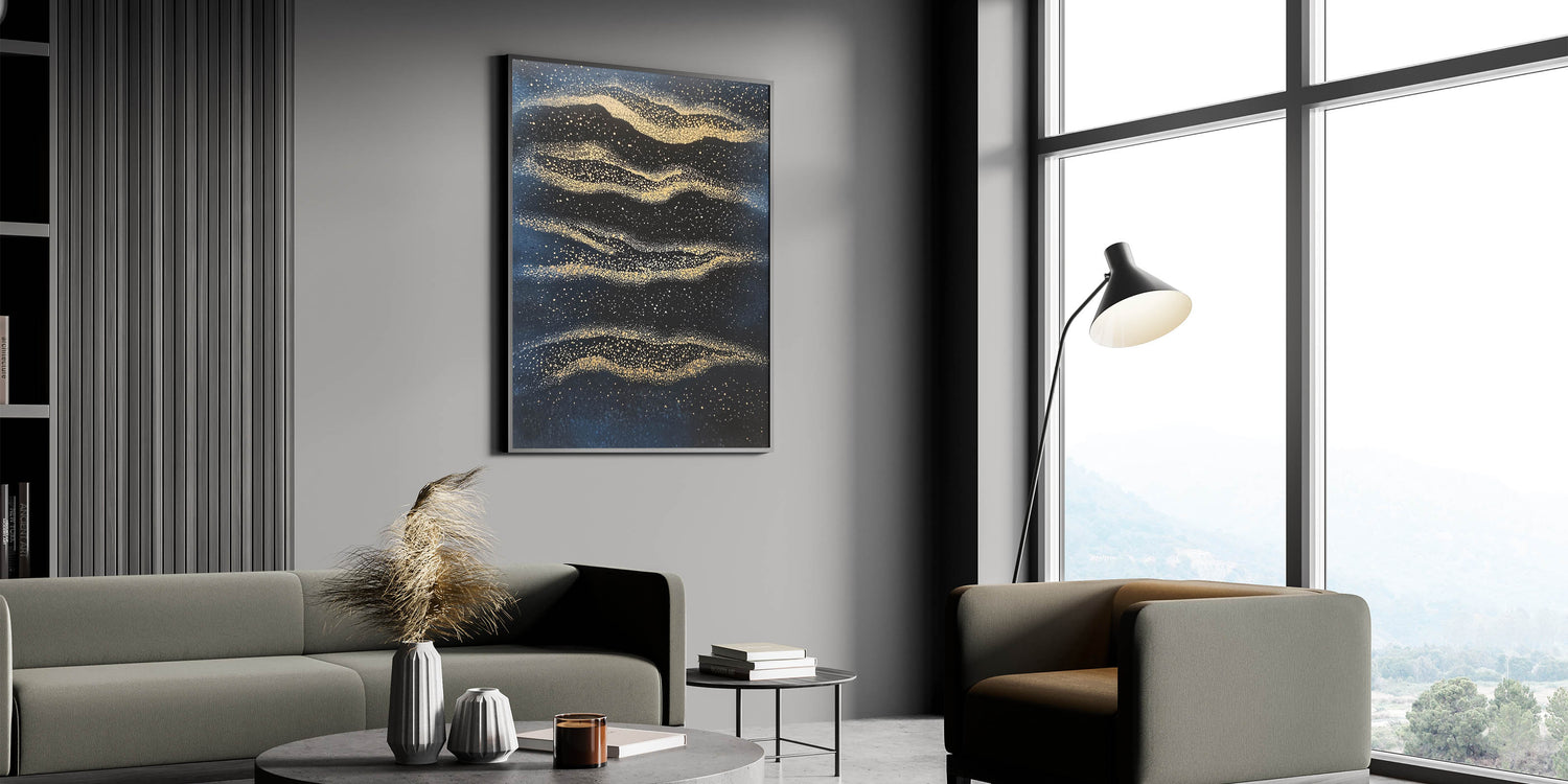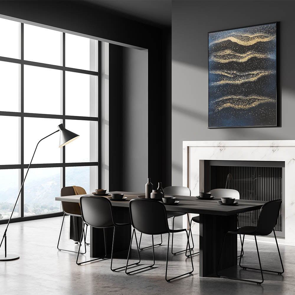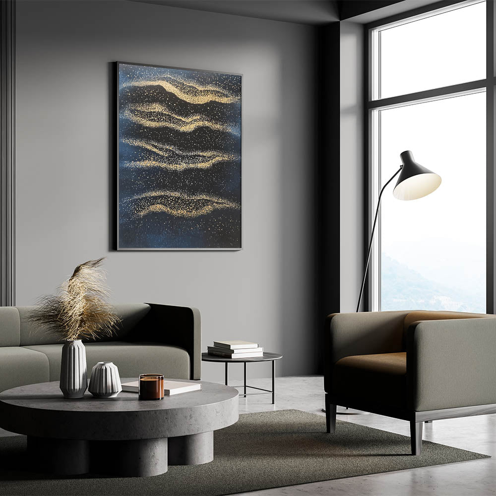 Capture the essence of cosmic beauty with this minimalist wall décor, a mesmerizing fusion of deep navy blue and radiant gold. Inspired by celestial patterns, this modern abstract wall art evokes the wonder of the night sky with shimmering golden textures scattered across a rich, dark background. The fluid motion and fine details create a dreamlike ambiance, making it an ideal piece for sophisticated interiors.
