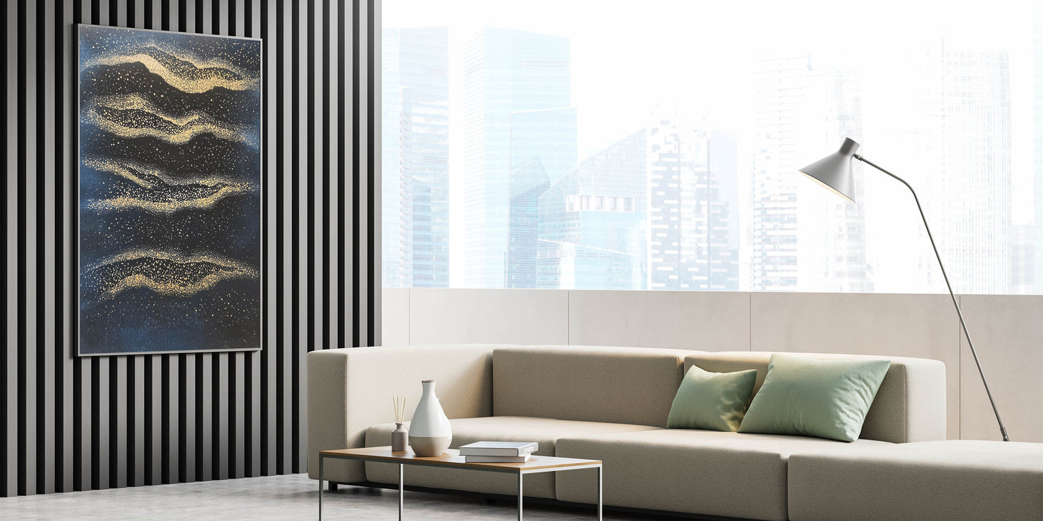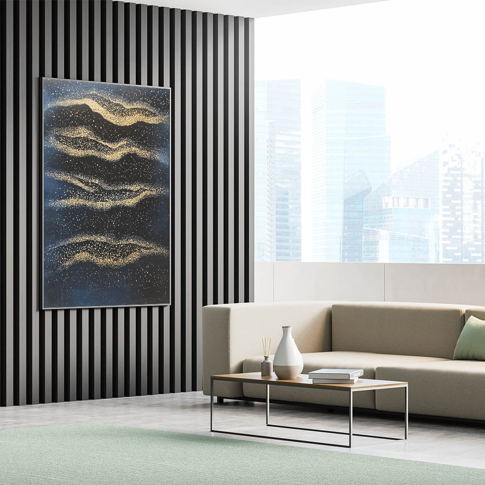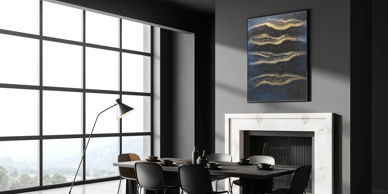 Capture the essence of cosmic beauty with this minimalist wall décor, a mesmerizing fusion of deep navy blue and radiant gold. Inspired by celestial patterns, this modern abstract wall art evokes the wonder of the night sky with shimmering golden textures scattered across a rich, dark background. The fluid motion and fine details create a dreamlike ambiance, making it an ideal piece for sophisticated interiors.