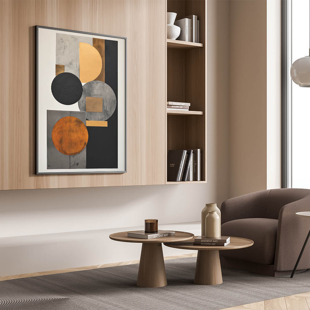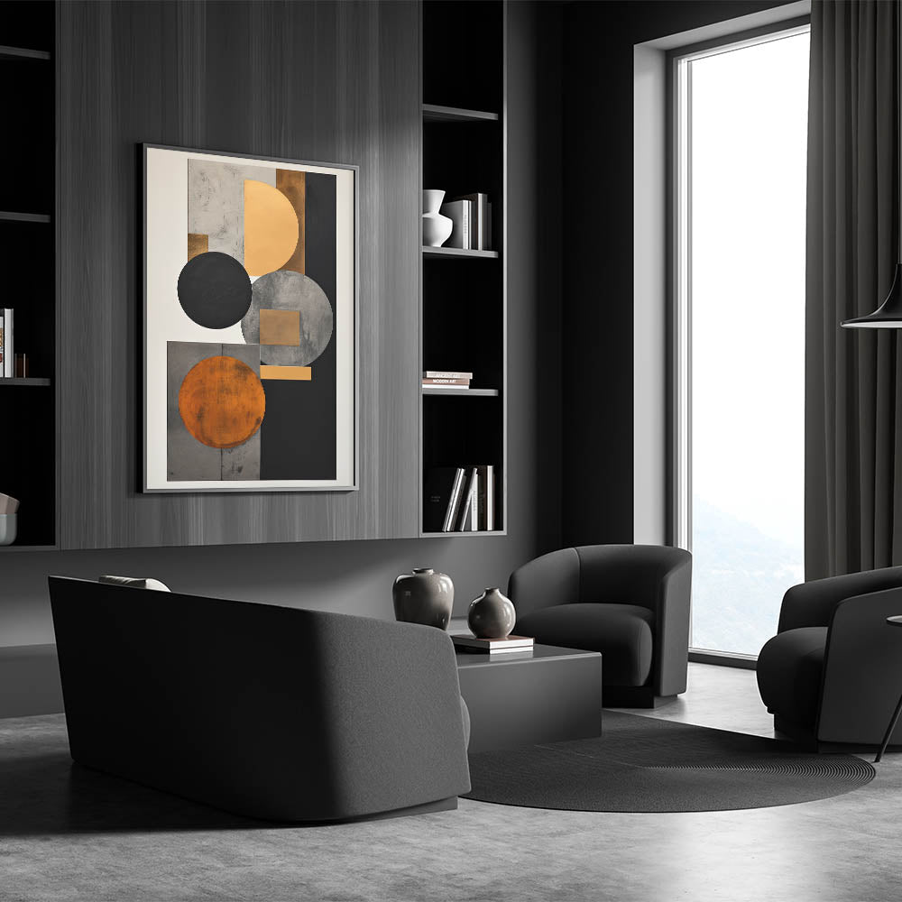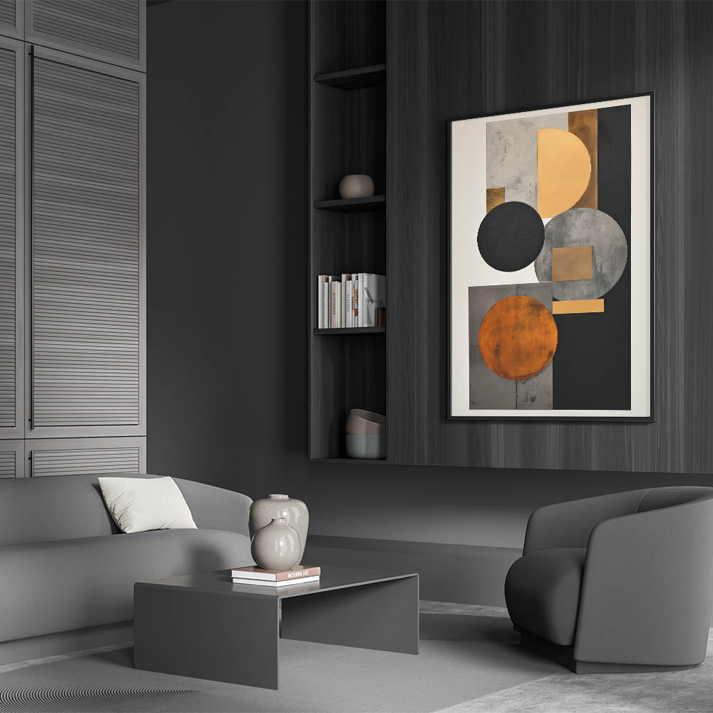 Add luxury and structure to your space with this standout piece from the Abstracts in Earthen Harmony collection. Featuring layered circles and rectangles in black, gold, gray, and burnt orange, this design embodies the timeless sophistication of modern abstract art. Its symmetrical layout and rich color palette deliver bold visual impact with a minimalist edge.