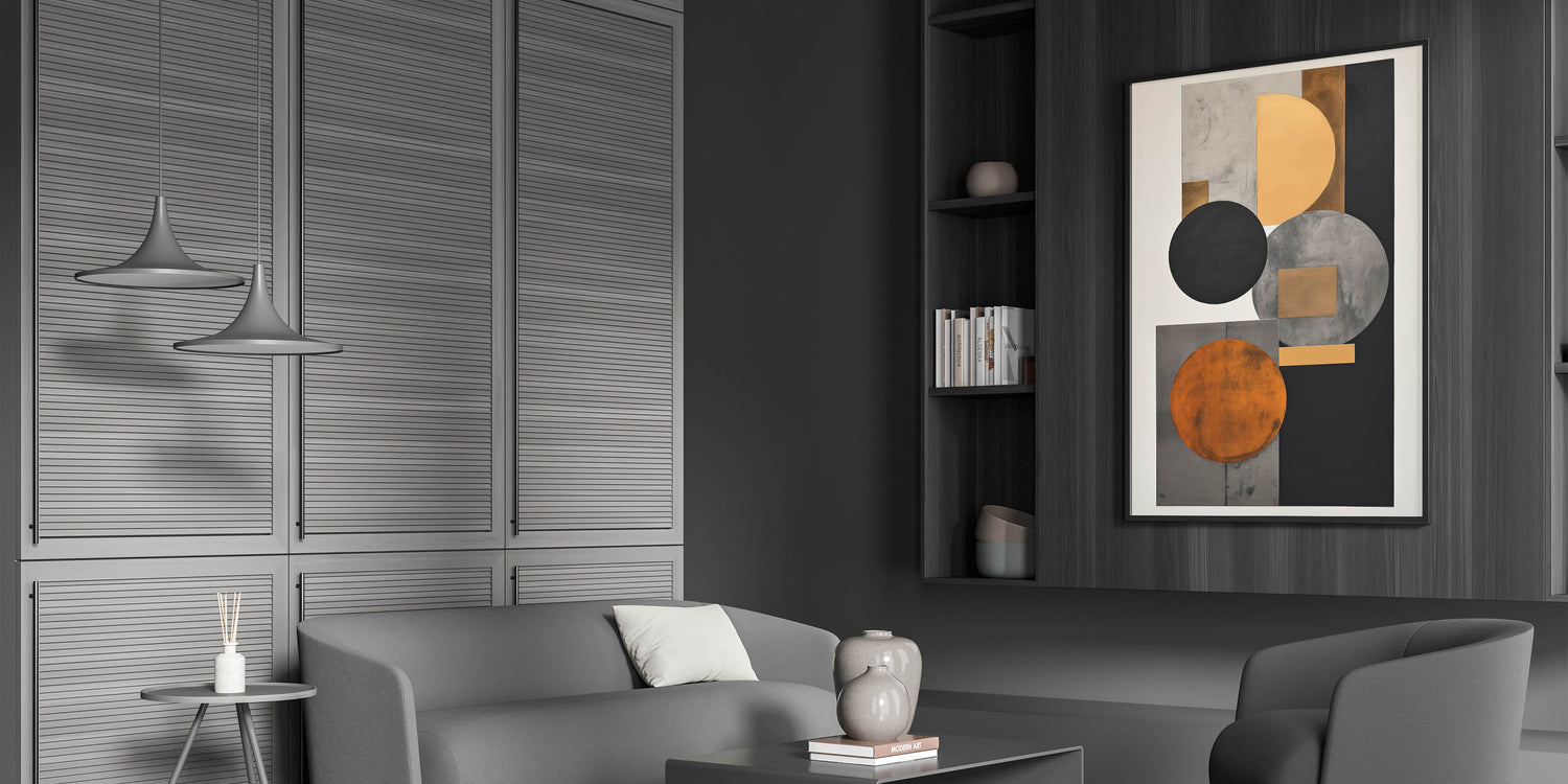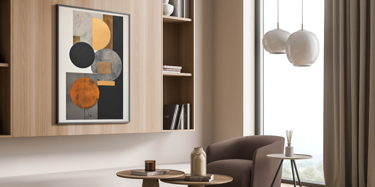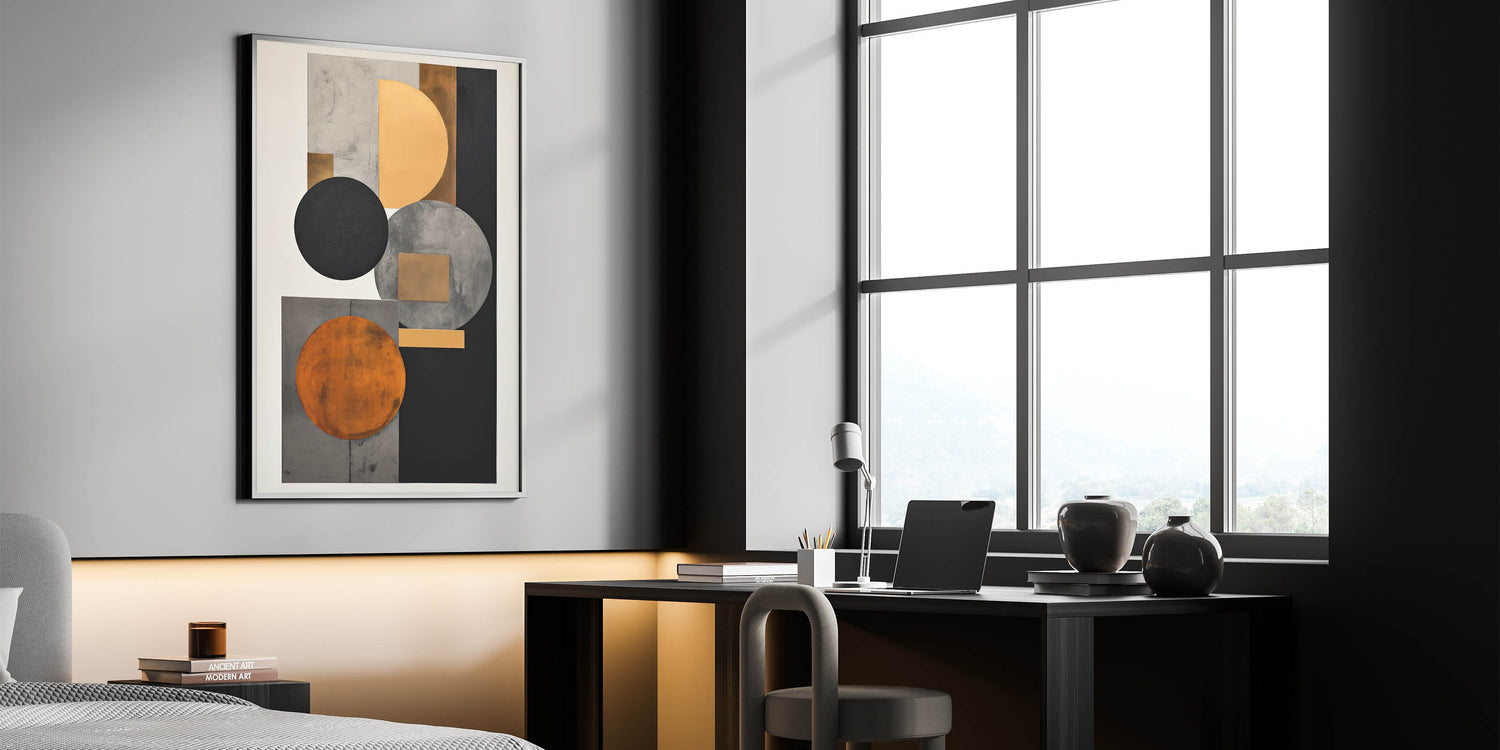 Add luxury and structure to your space with this standout piece from the Abstracts in Earthen Harmony collection. Featuring layered circles and rectangles in black, gold, gray, and burnt orange, this design embodies the timeless sophistication of modern abstract art. Its symmetrical layout and rich color palette deliver bold visual impact with a minimalist edge.