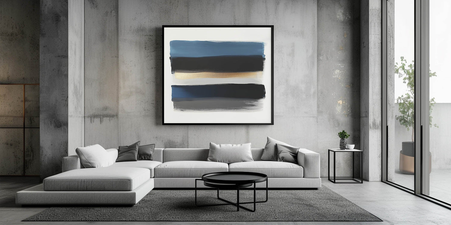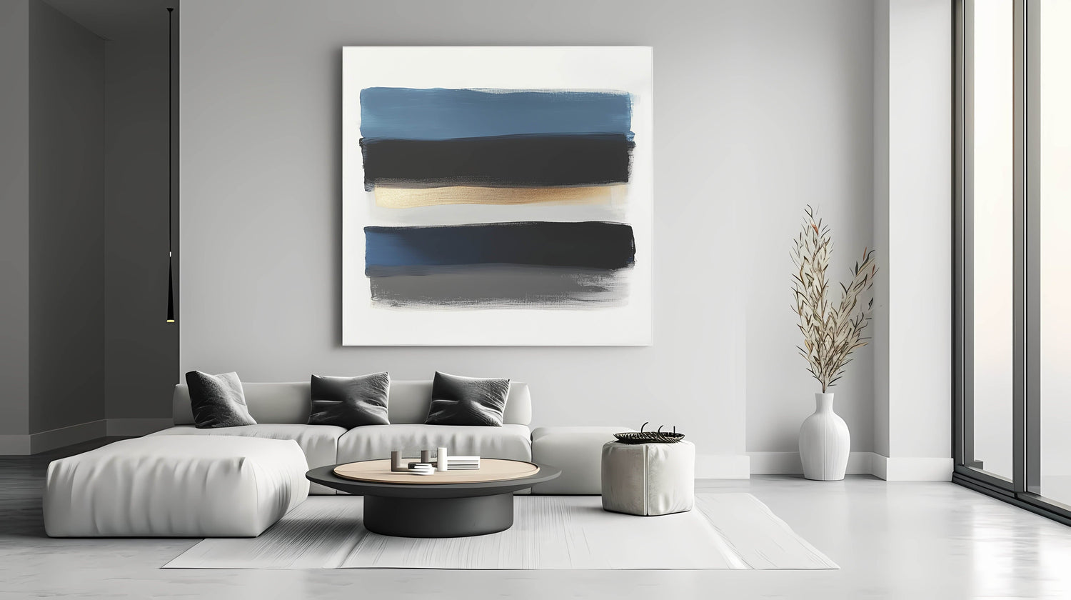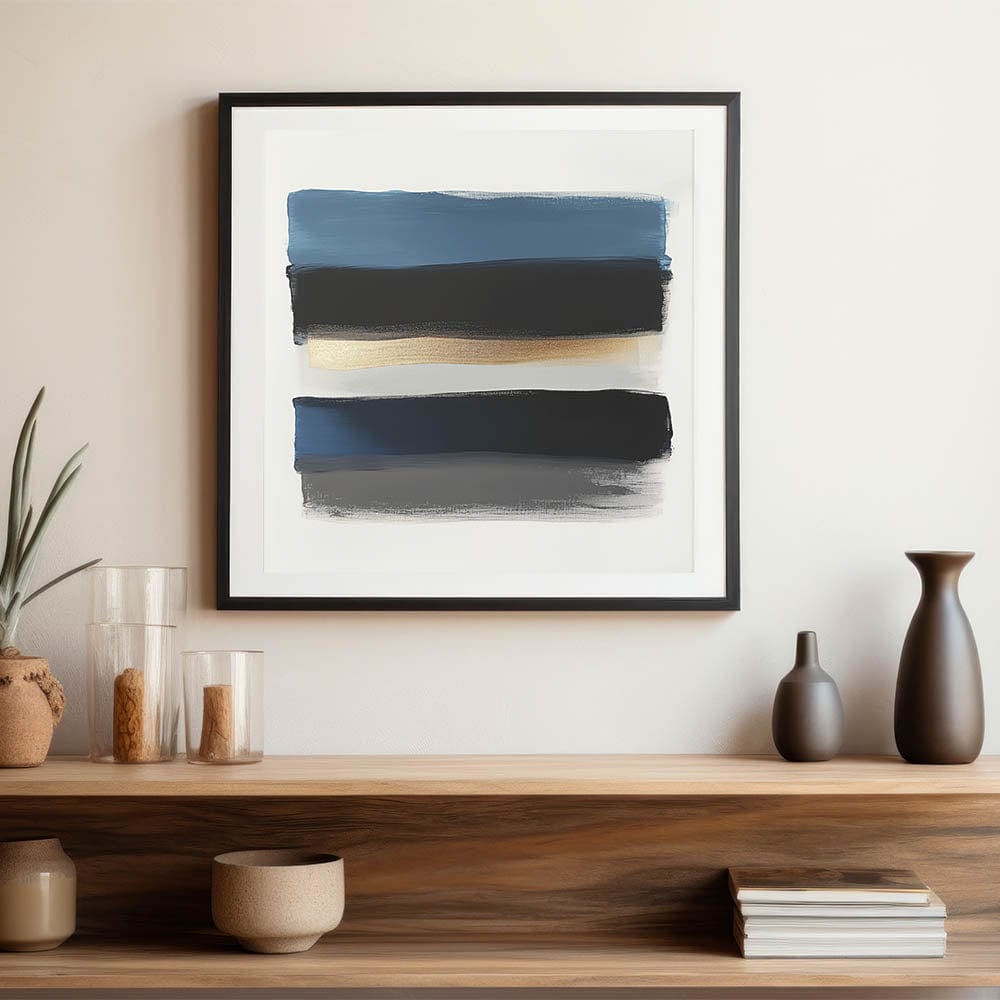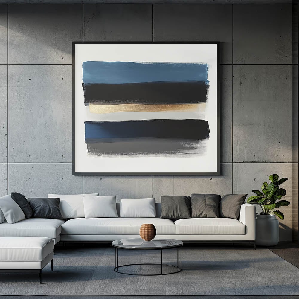 Infuse your space with modern sophistication using this striking modern abstract wall art. Featuring layered brushstrokes in black, navy blue, slate gray, and metallic gold, this composition delivers bold geometry with refined elegance. A clean layout and minimalist palette make it ideal for contemporary interiors.