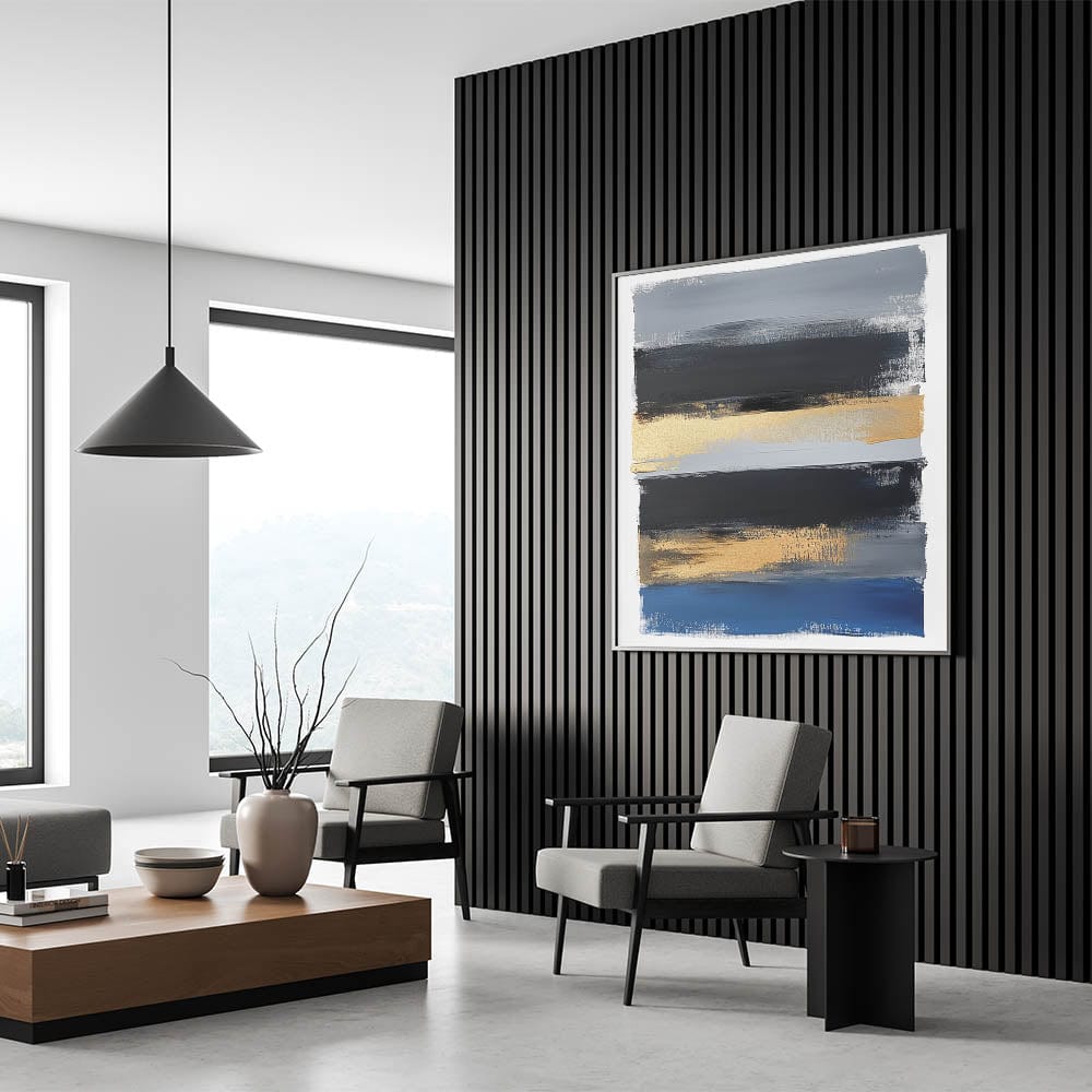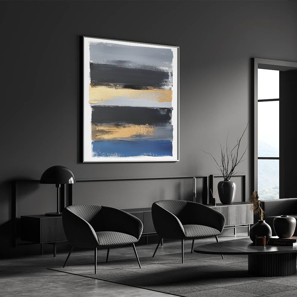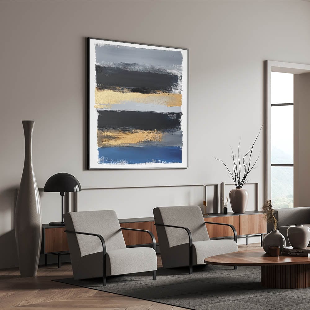 Make a bold design statement with this modern abstract wall art, featuring layered geometric strokes in deep black, shimmering gold, steel gray, and royal blue. This visually dynamic piece adds sophistication and contrast, perfect for elevating minimalist or contemporary interiors.