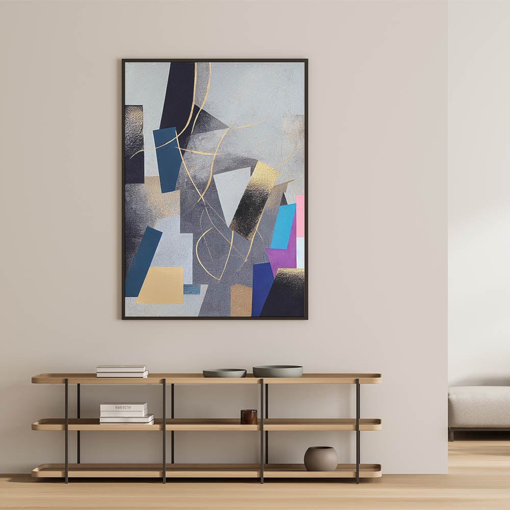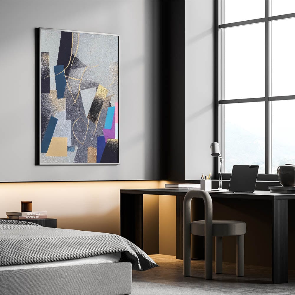 Bring a bold and luxurious touch to your space with this moody modern wall art, a stunning display of contemporary abstract art. The structured geometric design in deep navy blue, shimmering gold, and soft gray creates a sophisticated yet modern aesthetic. The interplay of bold shapes and gold accents adds depth, making this abstract canvas wall art a statement piece for stylish interiors.