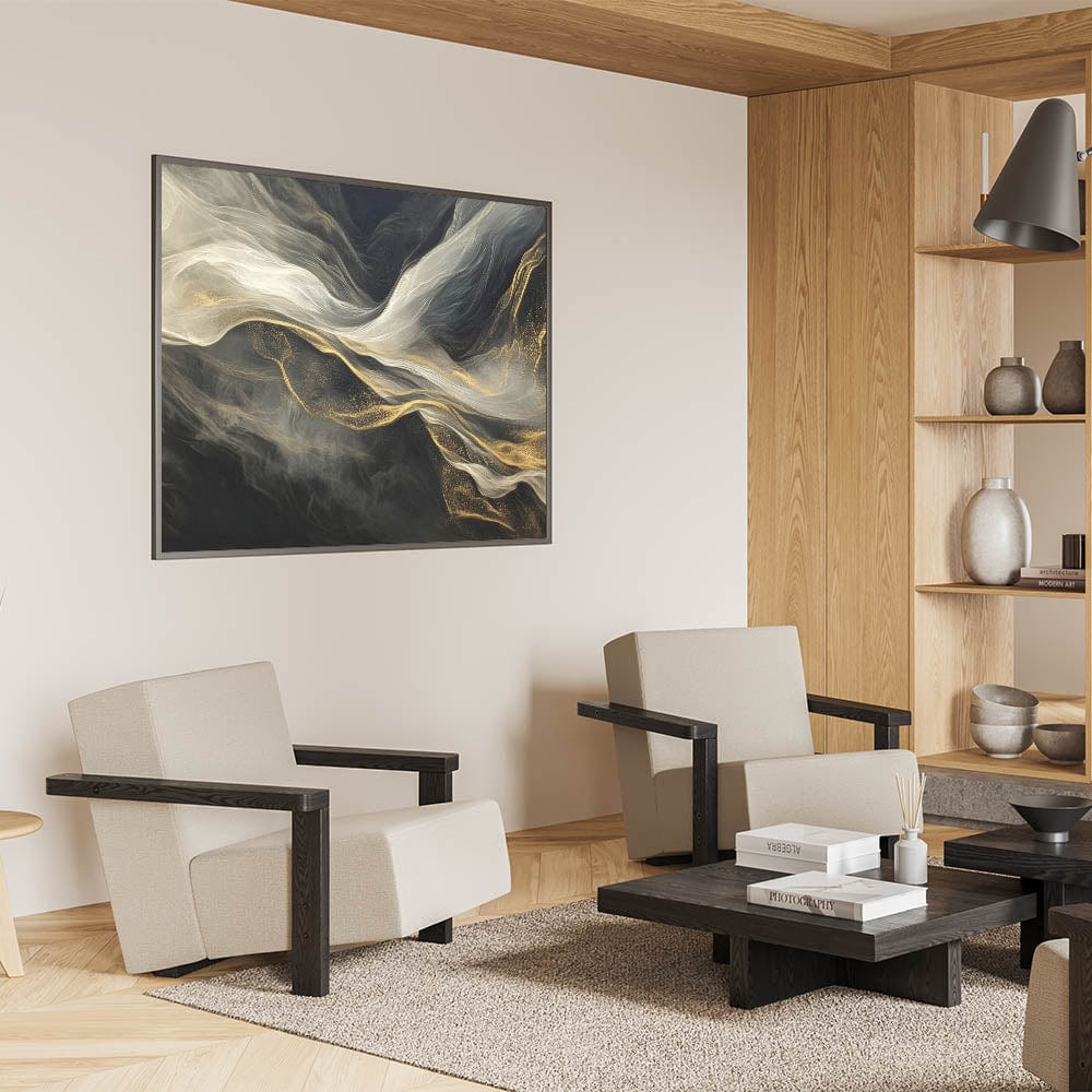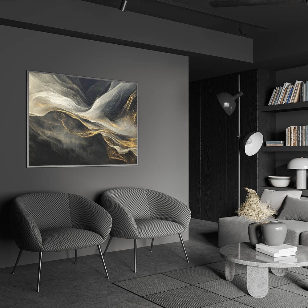 Immerse your space in mystique and elegance with this fluid acrylic wall decor, featuring flowing black, white, and golden tones. The design captures the essence of light and motion, creating a smoky, dreamlike atmosphere that draws the eye.